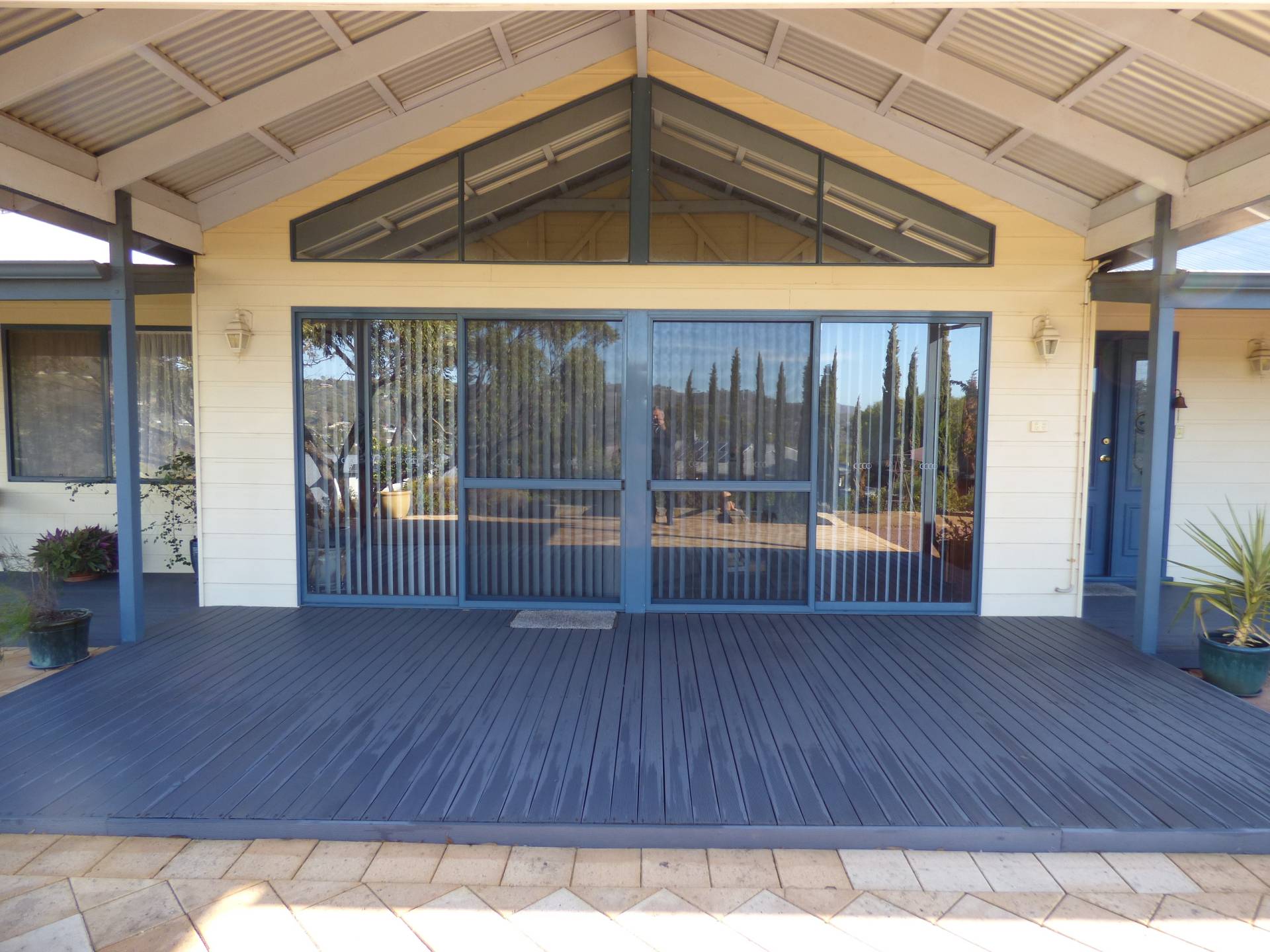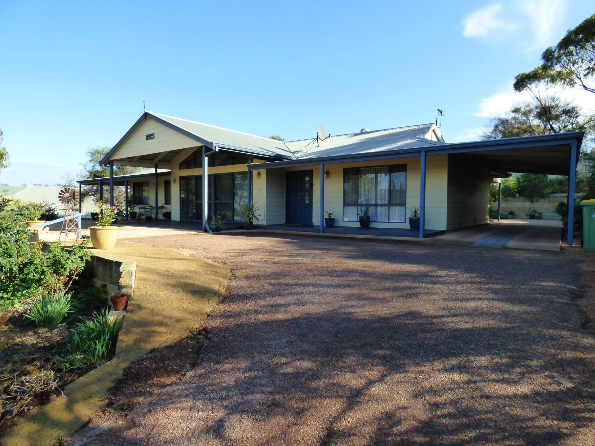 The bitumen driveway leads you past the row of tall pencil pines up to the Stunning Designed home.