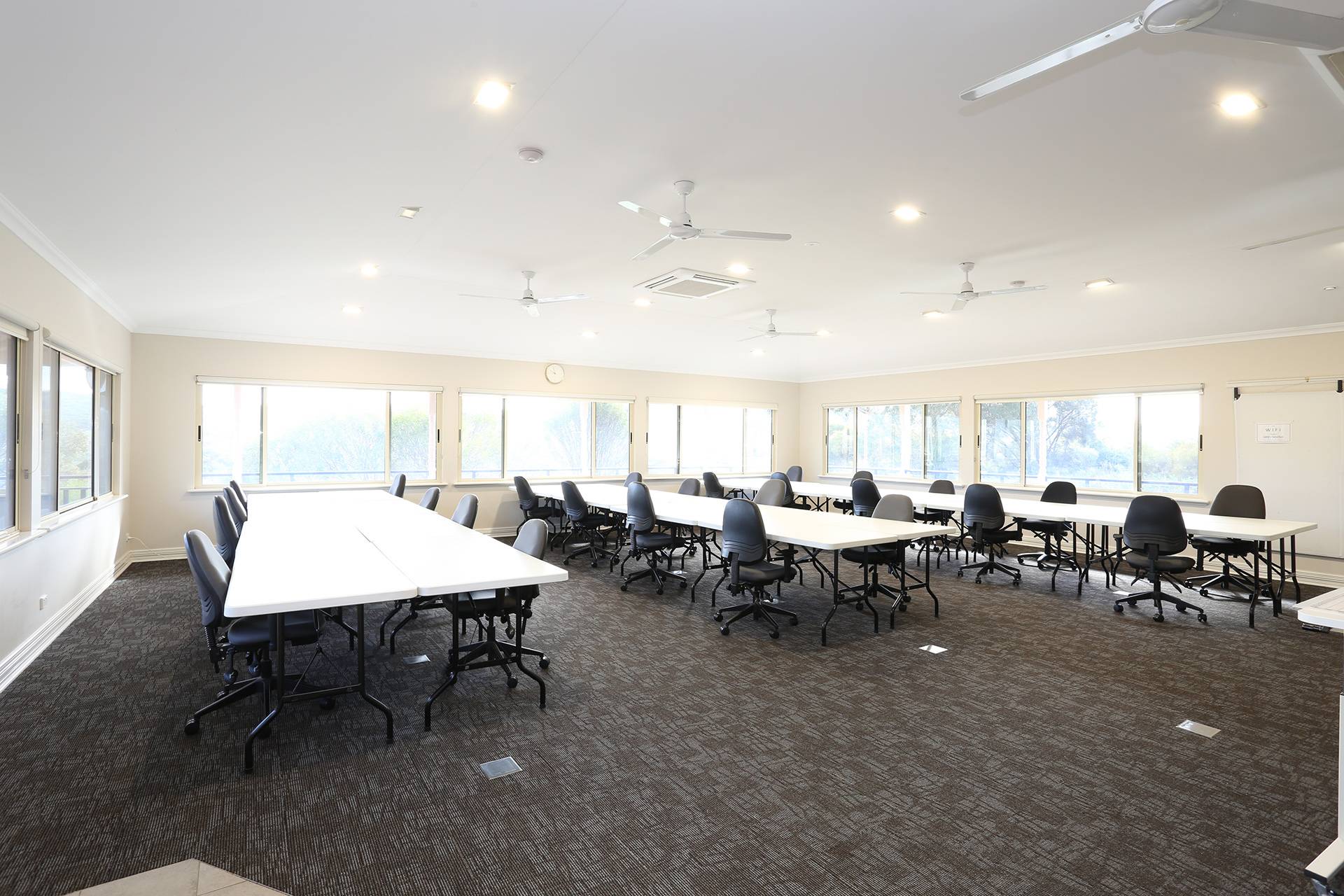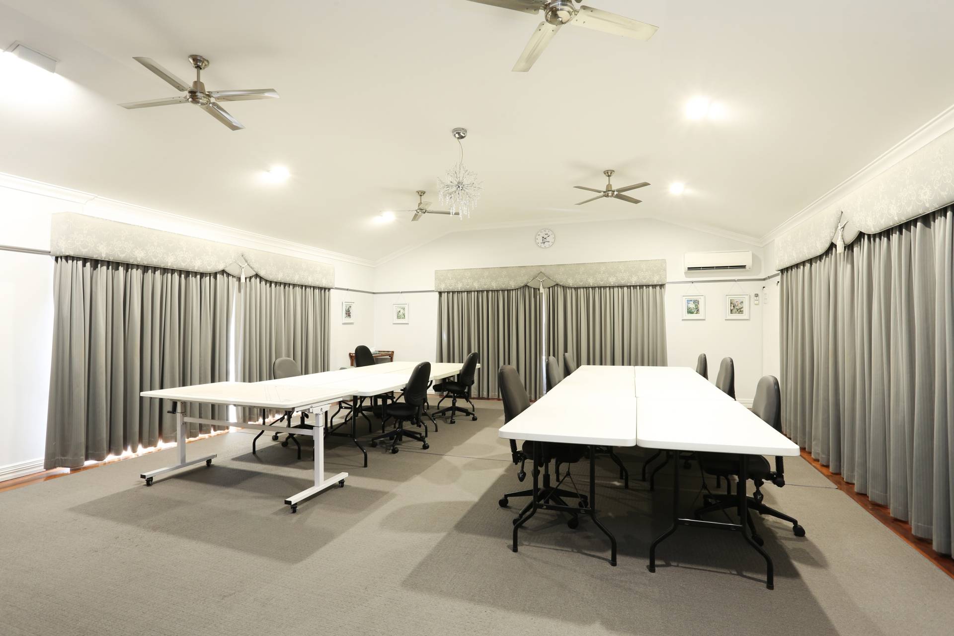 CONFERENCE ROOM 2 – Known as the “Silver Room” – is approximately 65 sqm and is the smaller of the function rooms. Catering for all occasions, it has a capacity for up to16 people with a work table each for crafting, or a higher capacity can be arranged for activities where tables are not required. The Silver Room is fitted out with polished timber floorboards for dances, reverse cycle air conditioning, white boards, flip charts, a light box and professional adjustable height cutting table, display walls and iron and ironing boards.