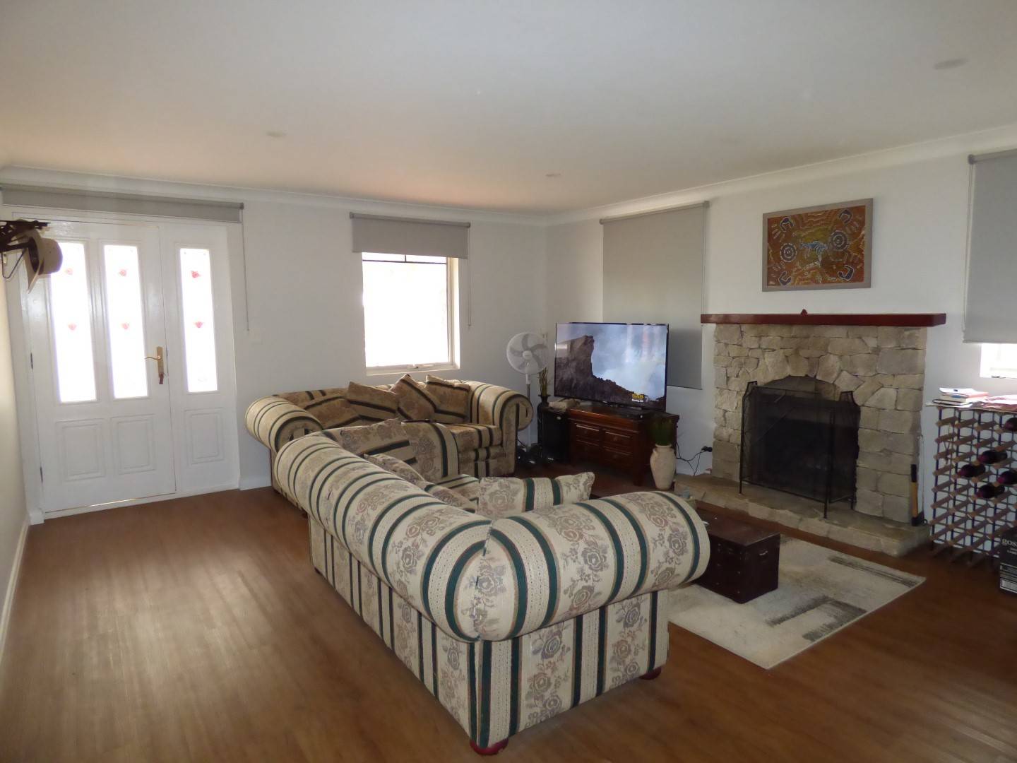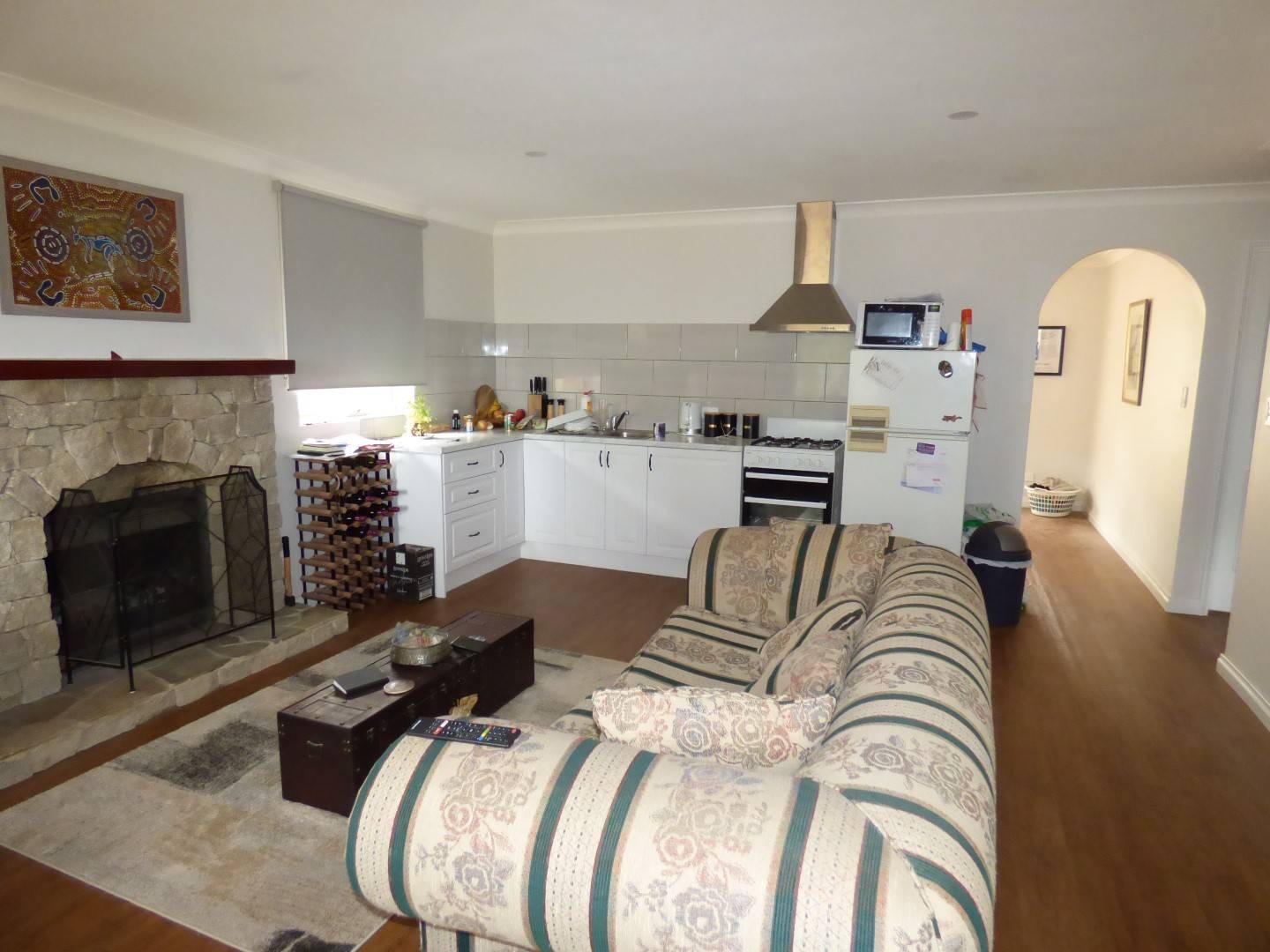 Lounge room has a stunning stone fireplace, kitchen is at the end of the lounge room and features stone benchtops and a gas oven.