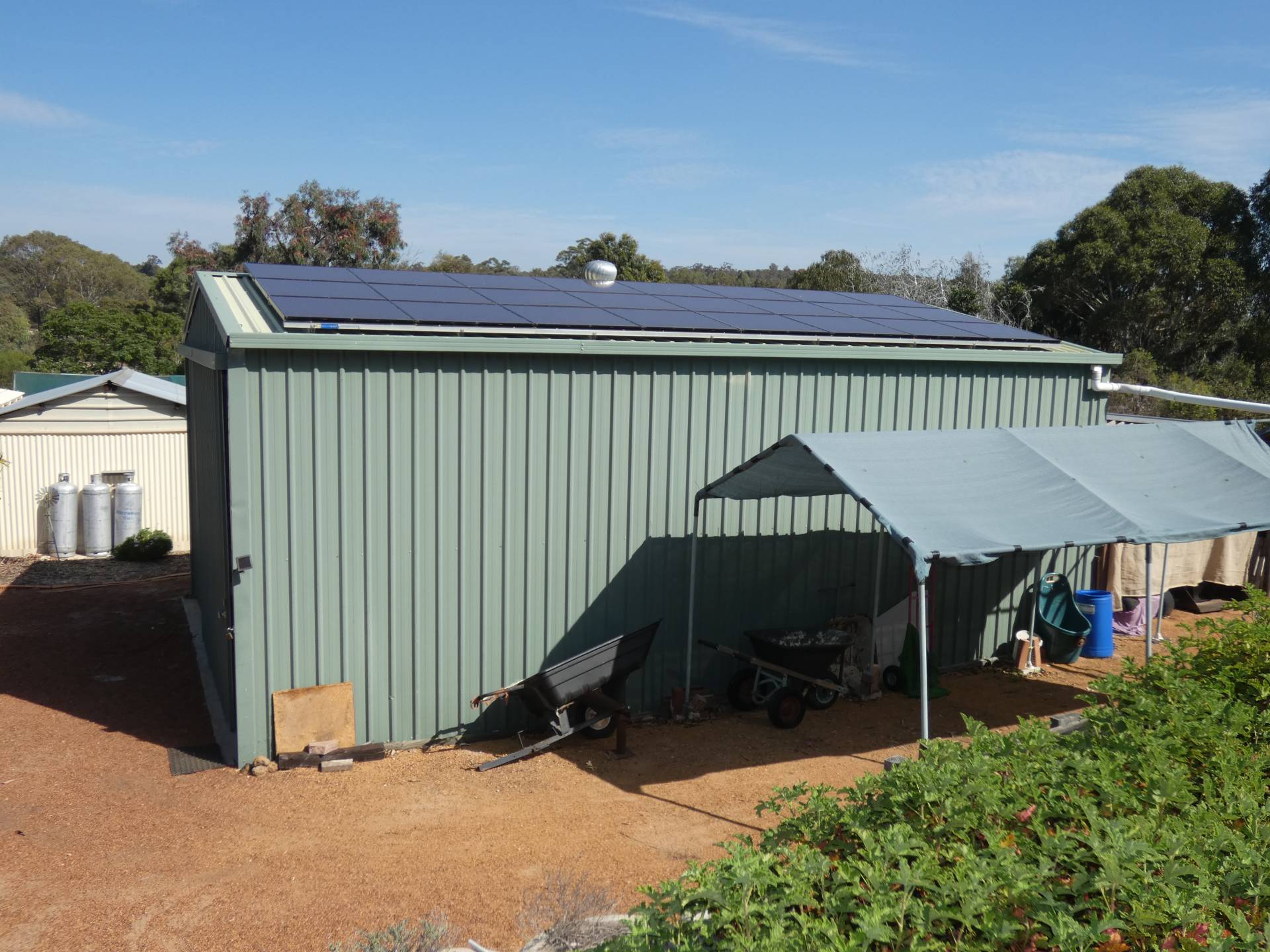 Next, a 9-metre x 6-metre shed, which will accommodate a caravan, sliding doors both ends with an external lean to big enough to accommodate a fair-sized boat. On the shed roof sits a very efficient solar panel array, the owners have not paid for electricity for some years. The panels were made in Japan and being of the Amorphous type operate better in summer heat.