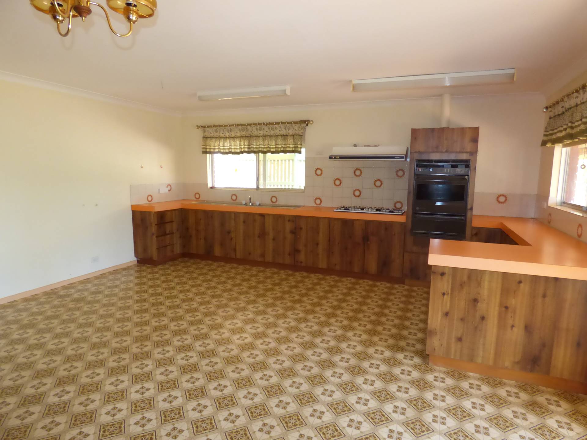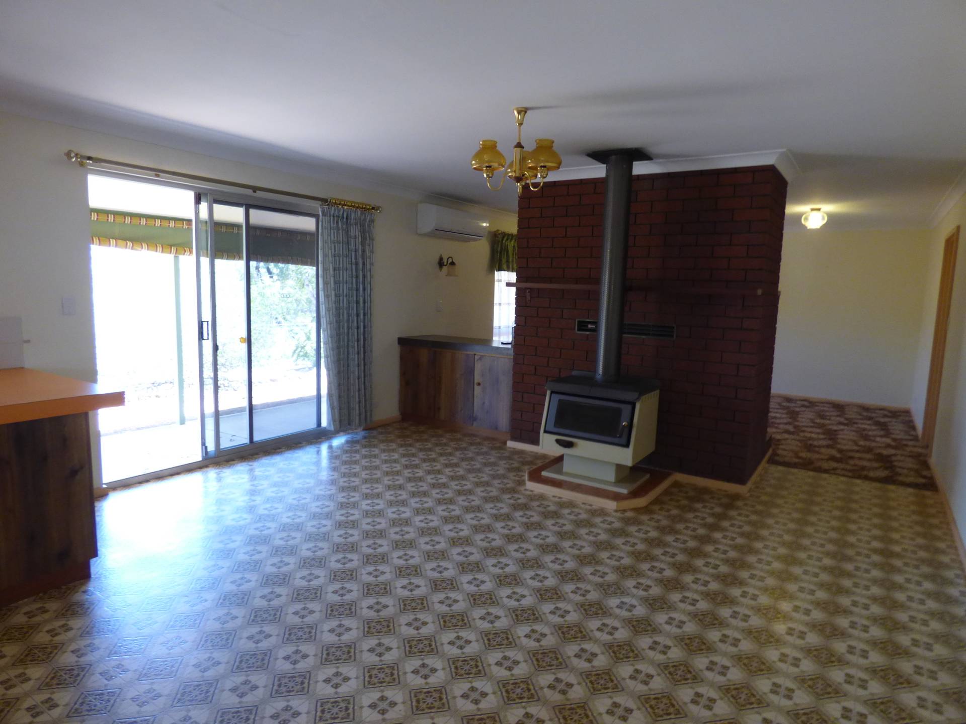 At the rear of the home is the huge kitchen area. Here you have the wood fire place, gas cooking and plenty of storage and bench space. The kitchen wraps around into the lounge room which is carpeted and is serviced by a split system air-conditioner.