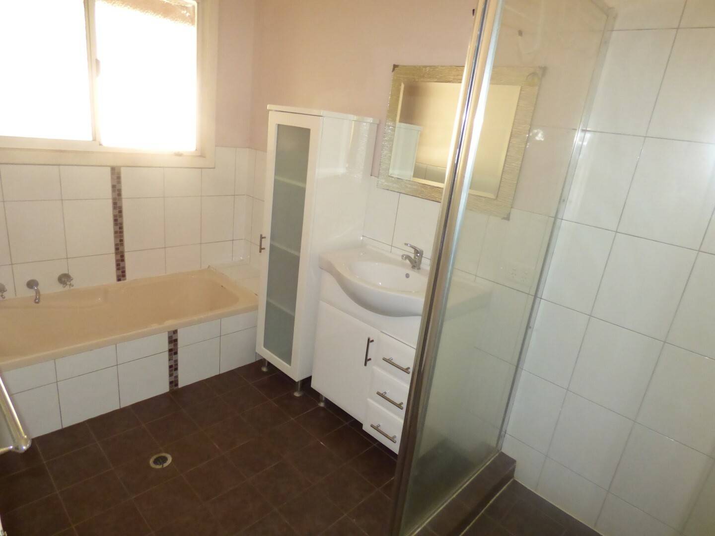 The functional bathroom features a bath tub, separate shower unit, vanity and cupboard for storage.