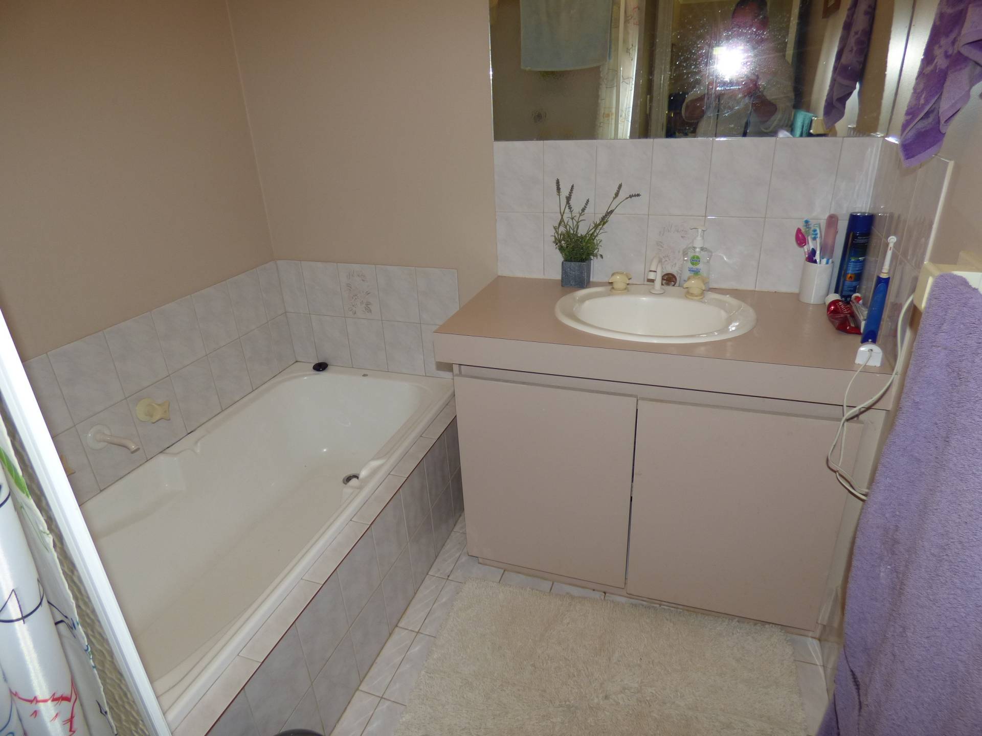 Bathroom features a corner shower along with a separate bathtub and vanity unit with under basin storage.