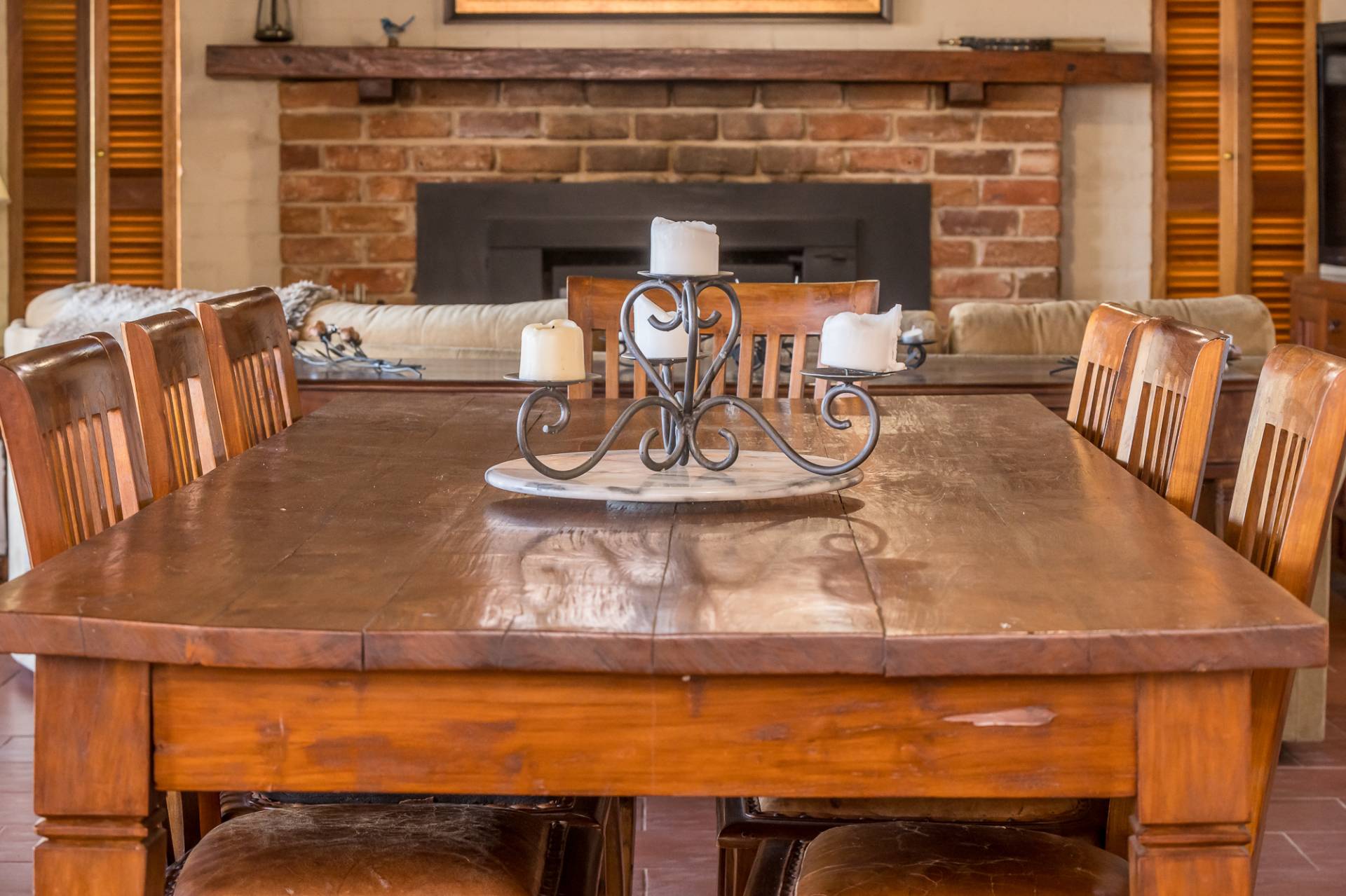 A 'L' shape kitchen with gas stove and plenty of bench space also has a walk in pantry. The central dining area can easily accommodate an 8 seater table. All of this area  has pleasant quarry tile flooring for easy cleaning.