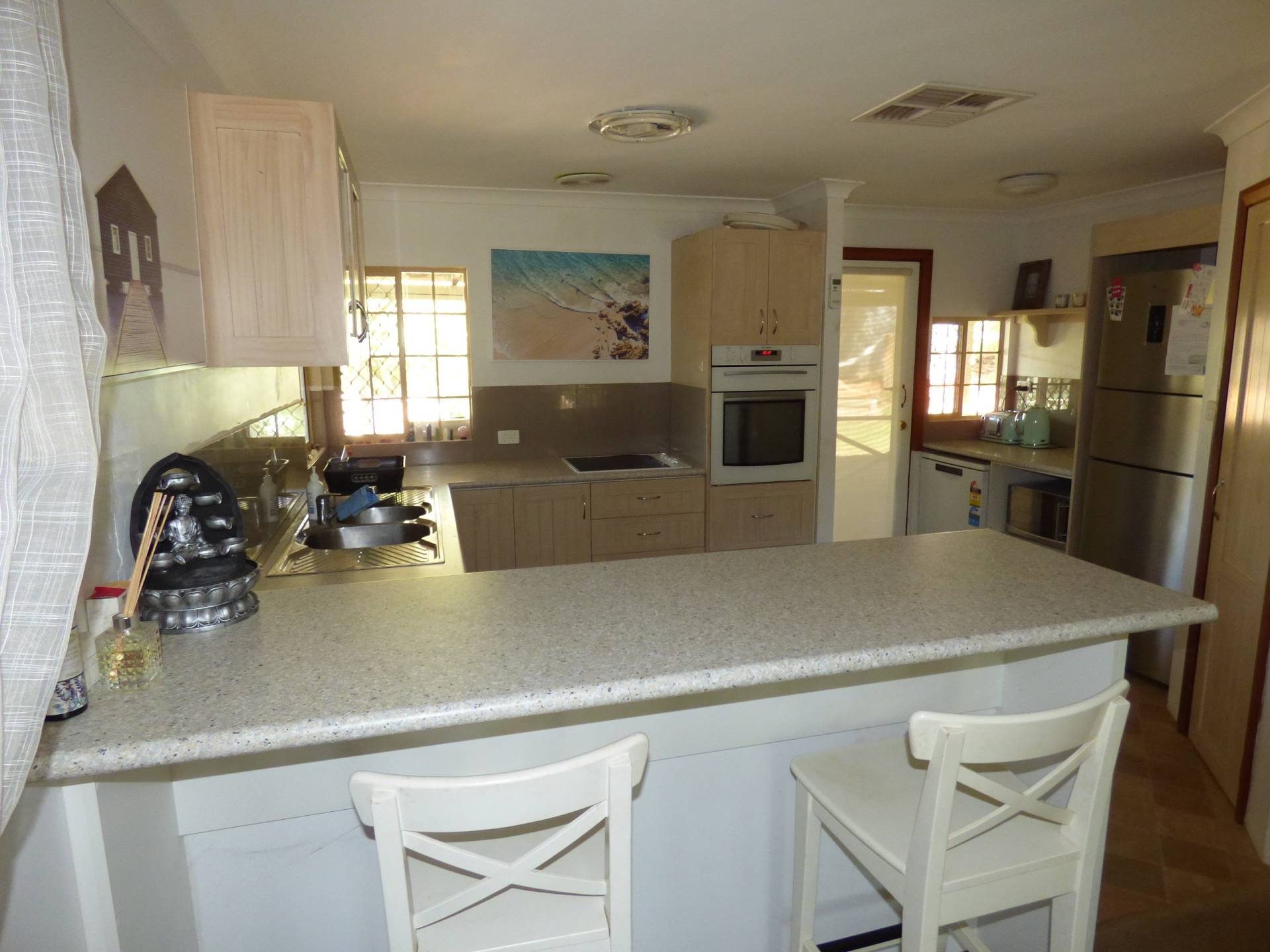 To the inside – you have a comfortable carpeted loungeroom featuring double windows as well as French door access to the veranda deck area. Overlooking this is the updated U shape kitchen which has everything you need: electric cooking, dishwasher, above and below cupboard space and a breakfast bar. Evaporative AC services this space.
