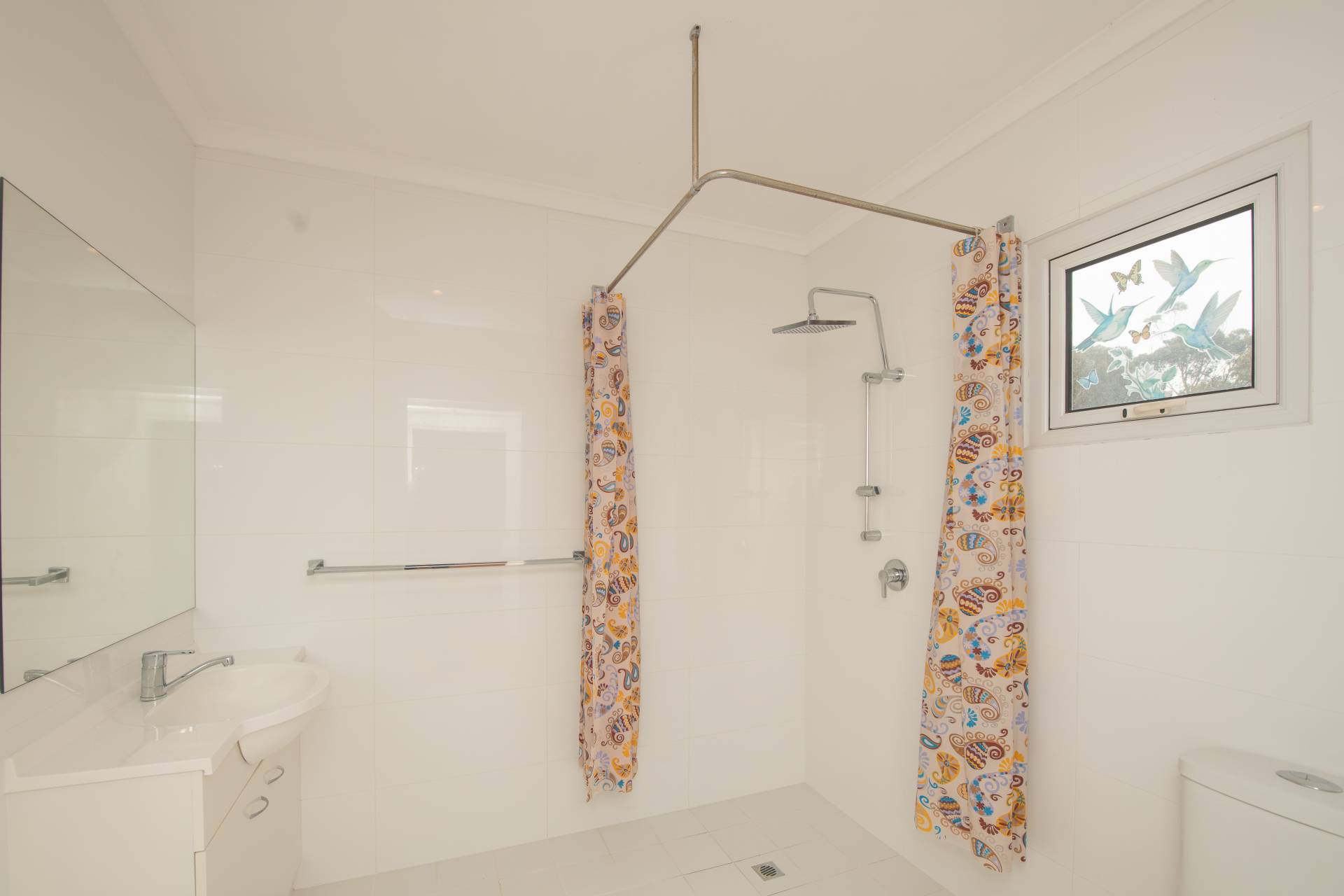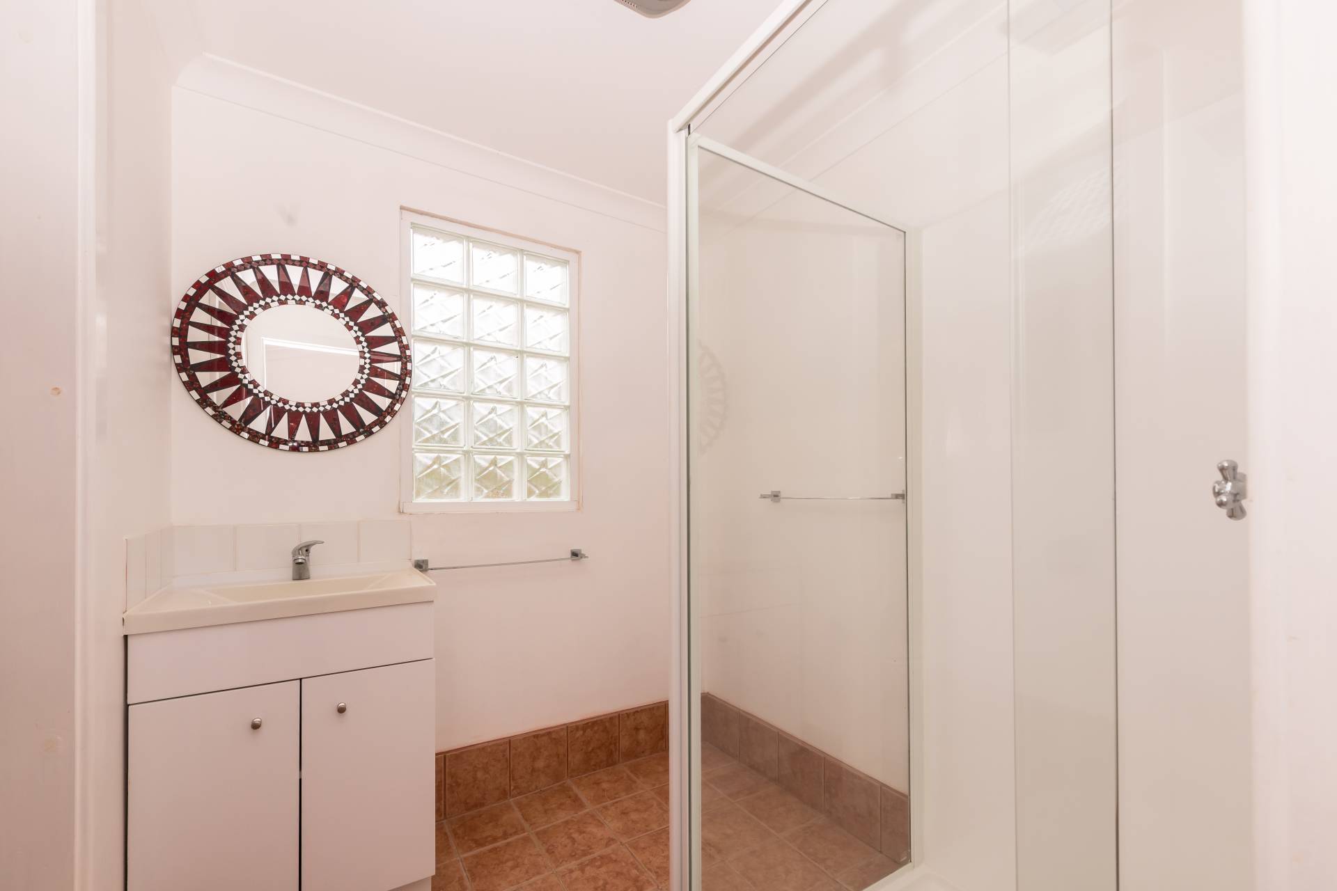 Through the laundry is the main bathroom. This space is simply complete with a glass corner shower and vanity unit. The toilet is through this space and is separated using a wall hub.
