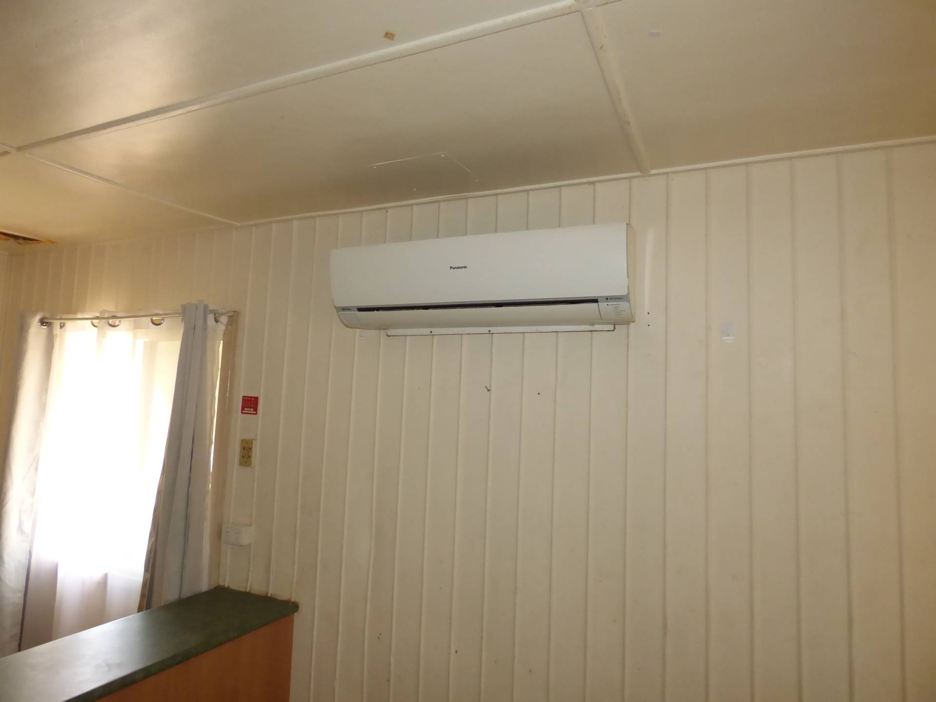 The kitchen has an electric oven and basic cabinetry. There is a split system air conditioner in the kitchen dining area.