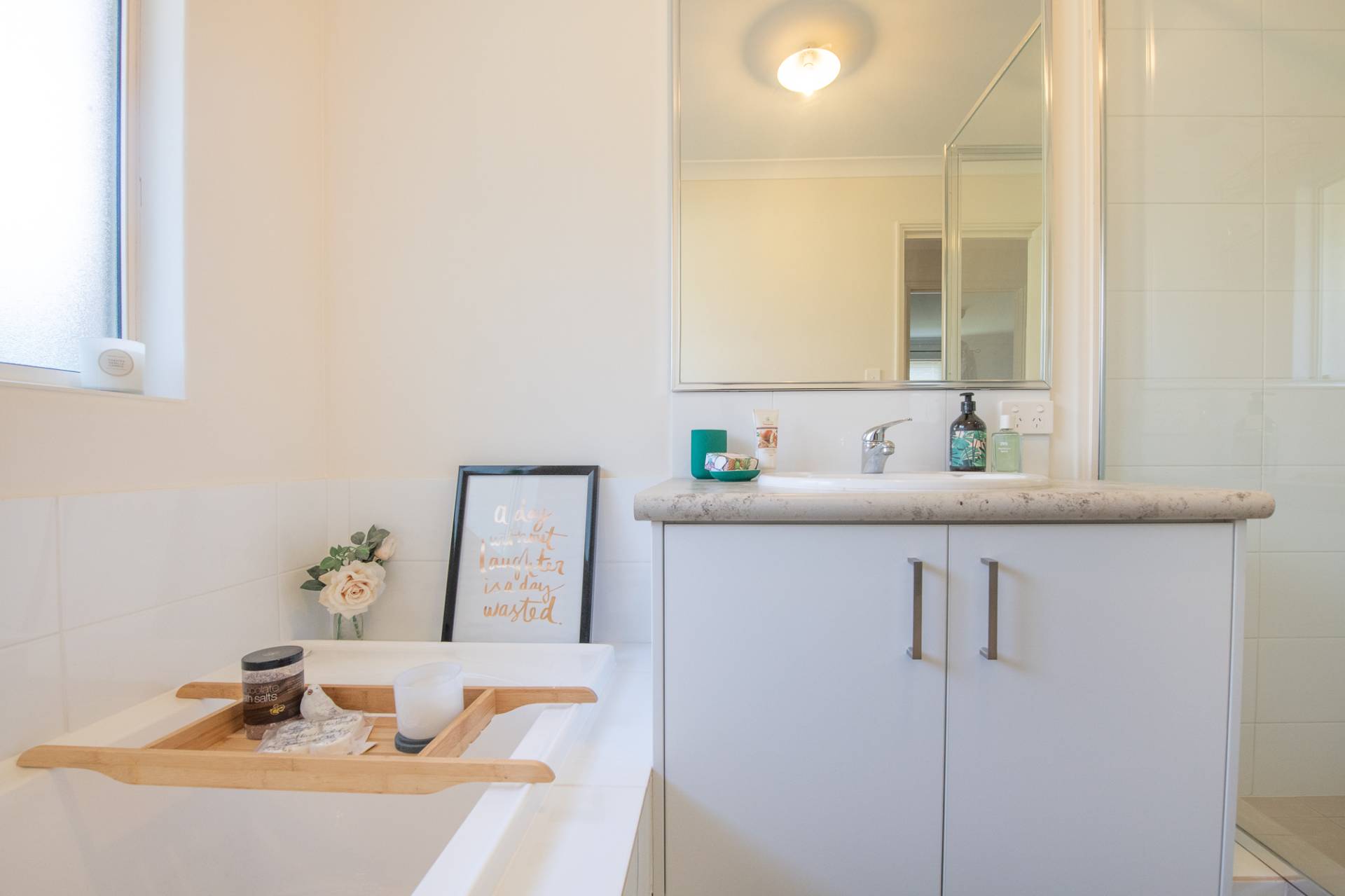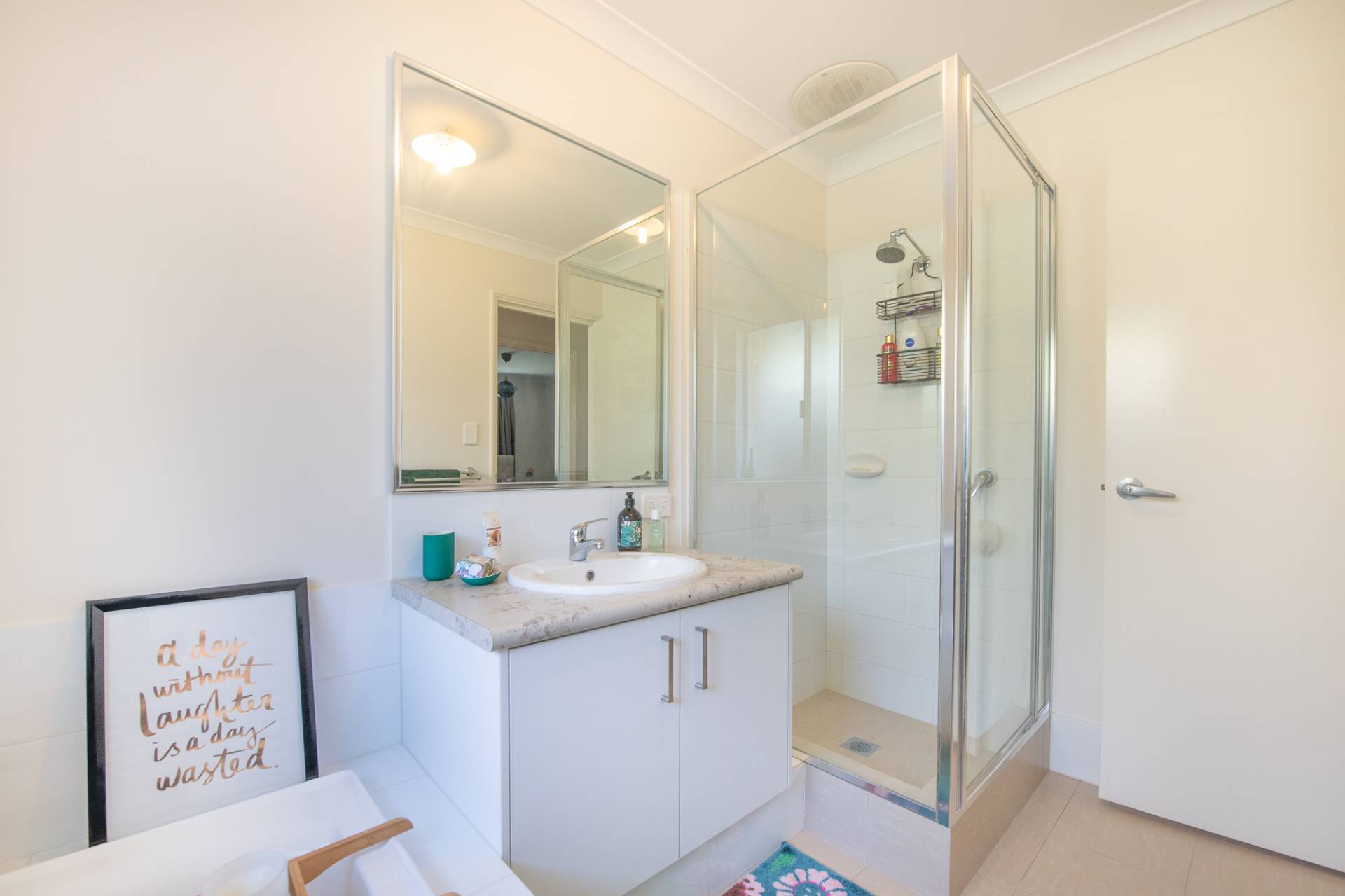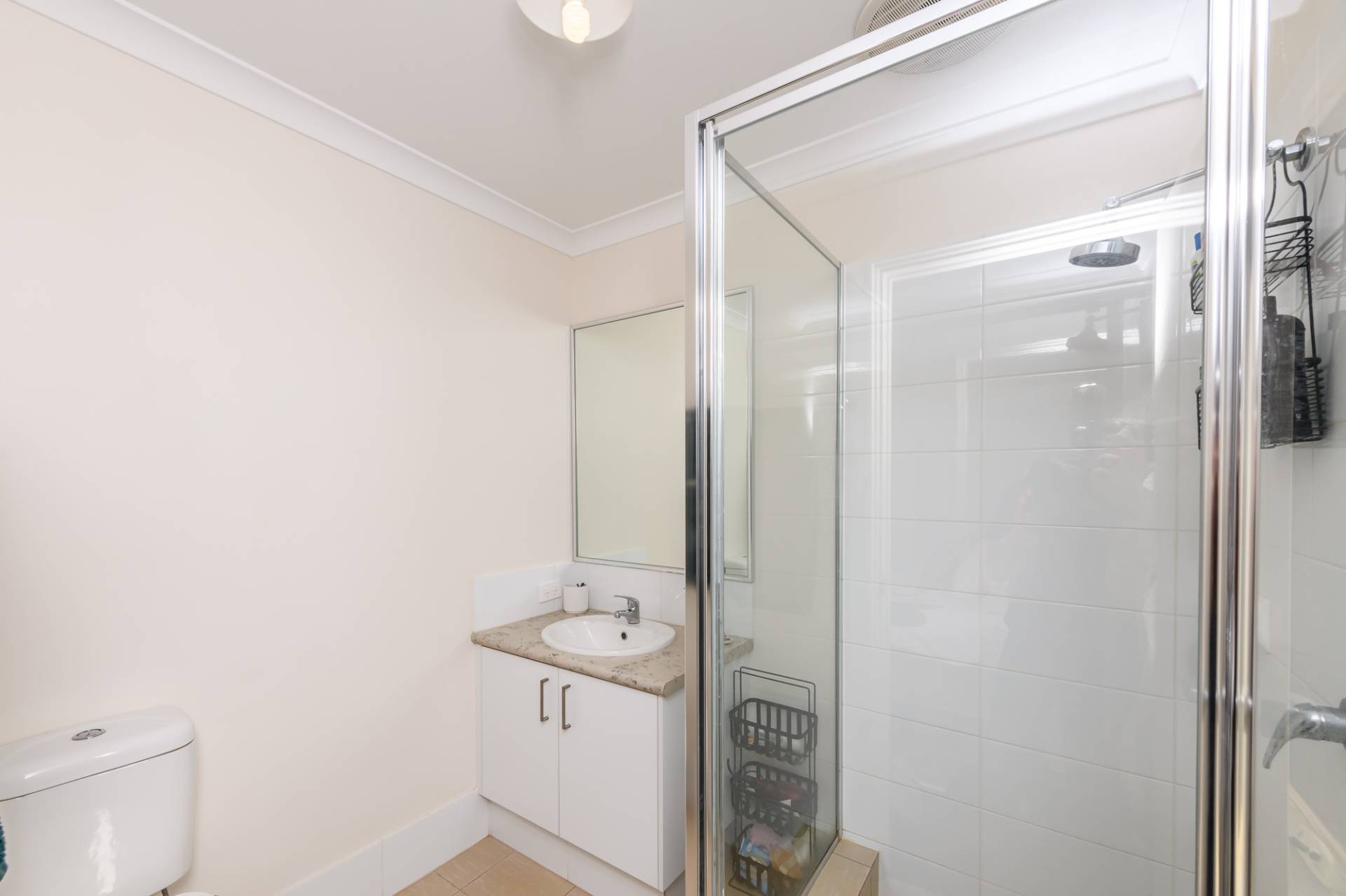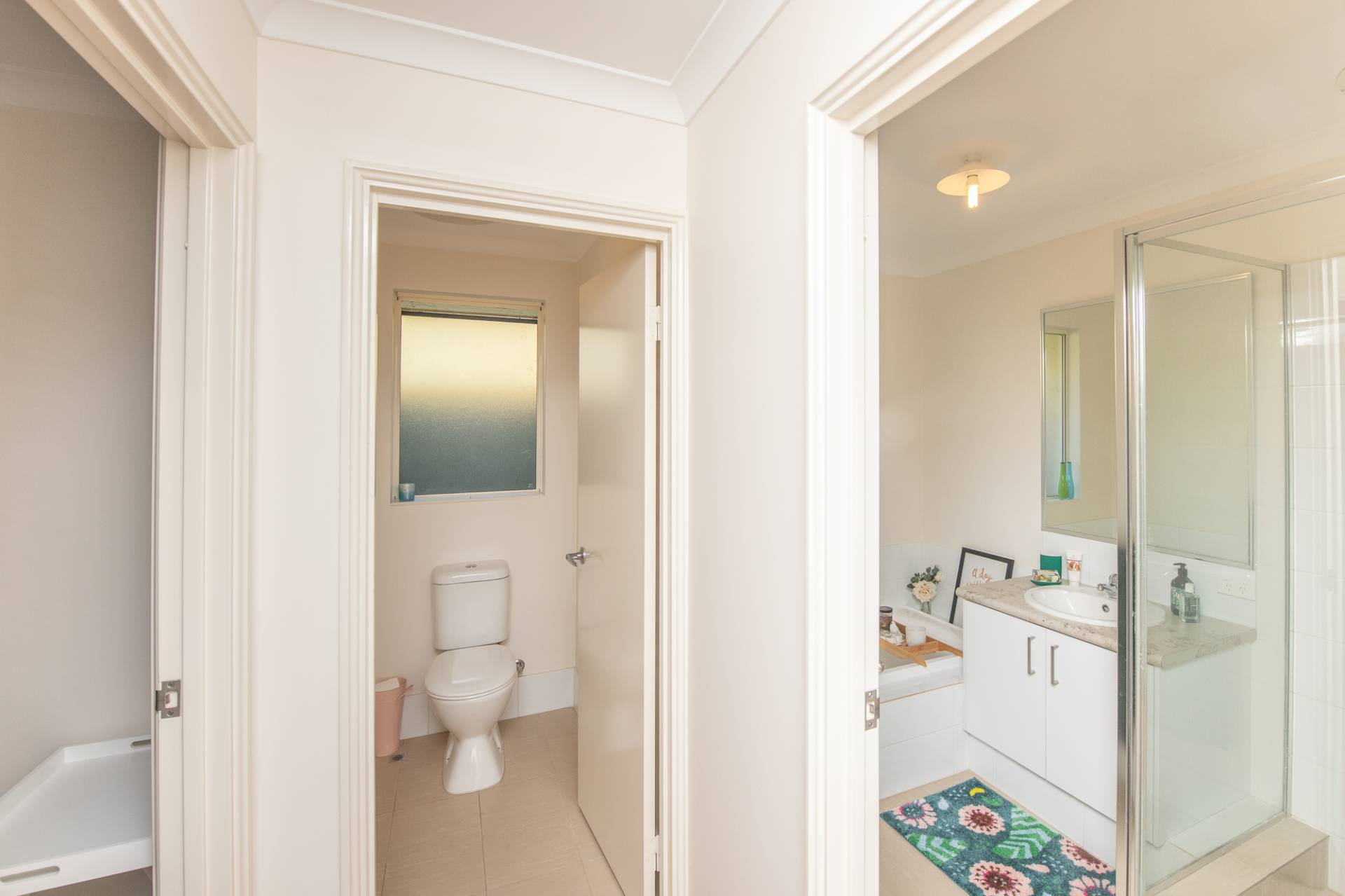 The main bathroom and separate toilets are sharing this space with the bathroom holding a glass corner shower, bath and vanity unit.