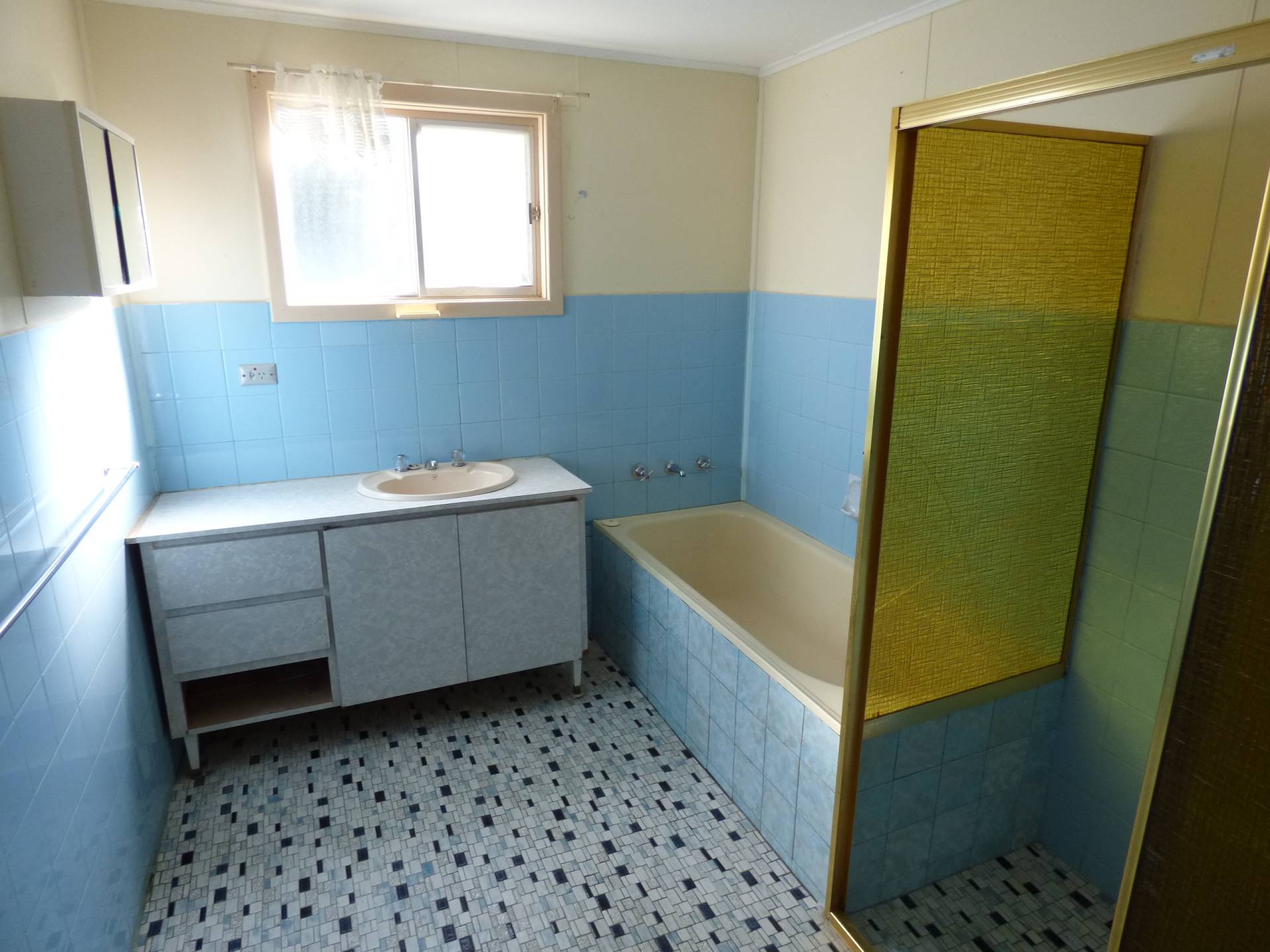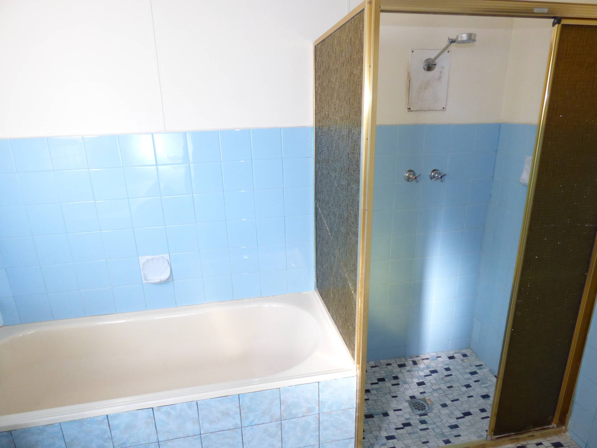 The bathroom has a glass corner shower, separate bath tub and vanity unit. Again, this space would also look great with a small amount of updating for the keen renovator/handyman!