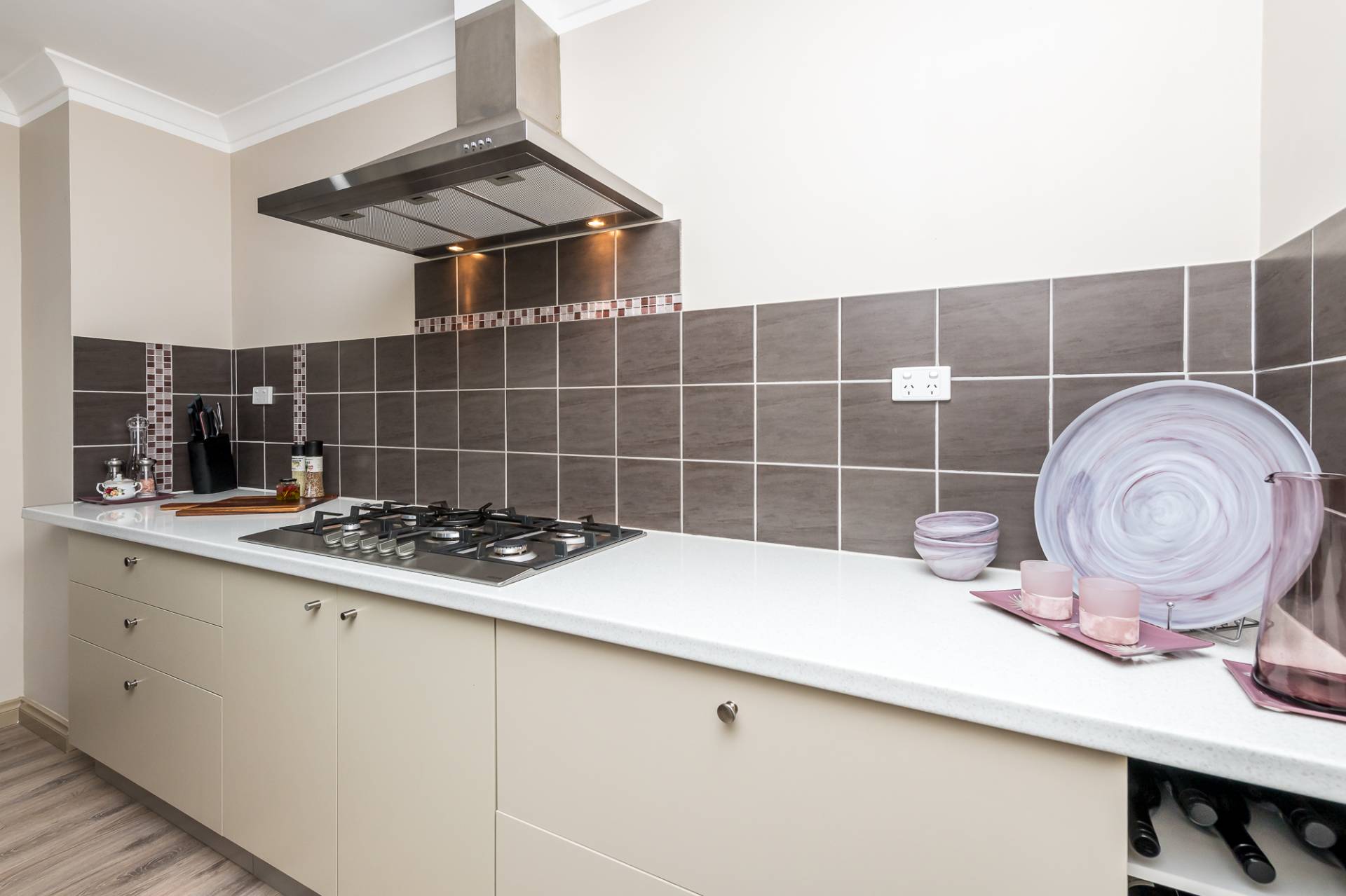 The living area is "open plan" with ample lounge, dining and informal sitting areas... french windows lead out onto the rear verandah. The gourmet kitchen features an island bench, lots of storage area and heaps of workspace. It includes a gas hob with an extraction hood over, an electric microwave-convection oven, a dishwasher and a front load washing machine as fixtures.