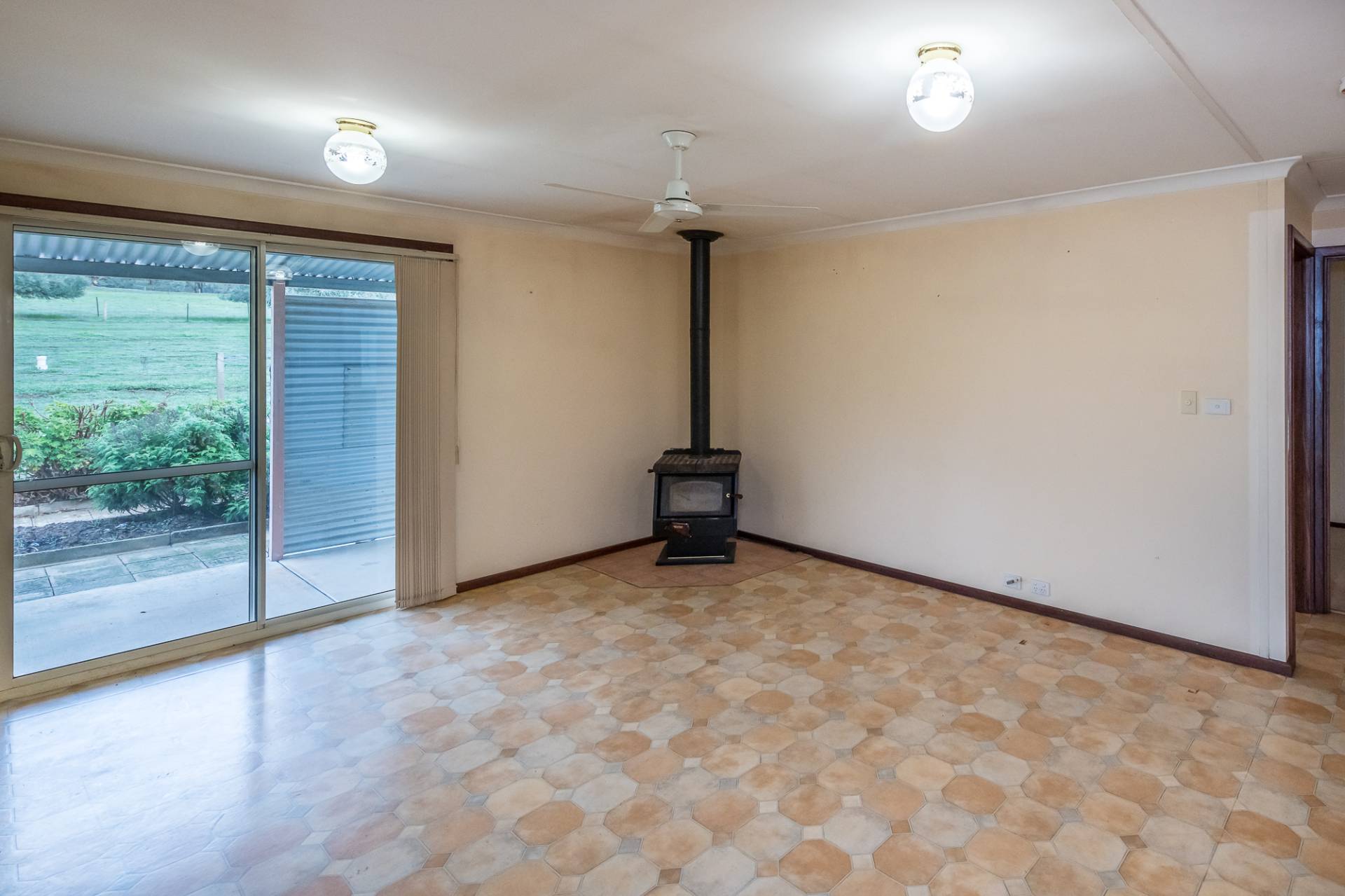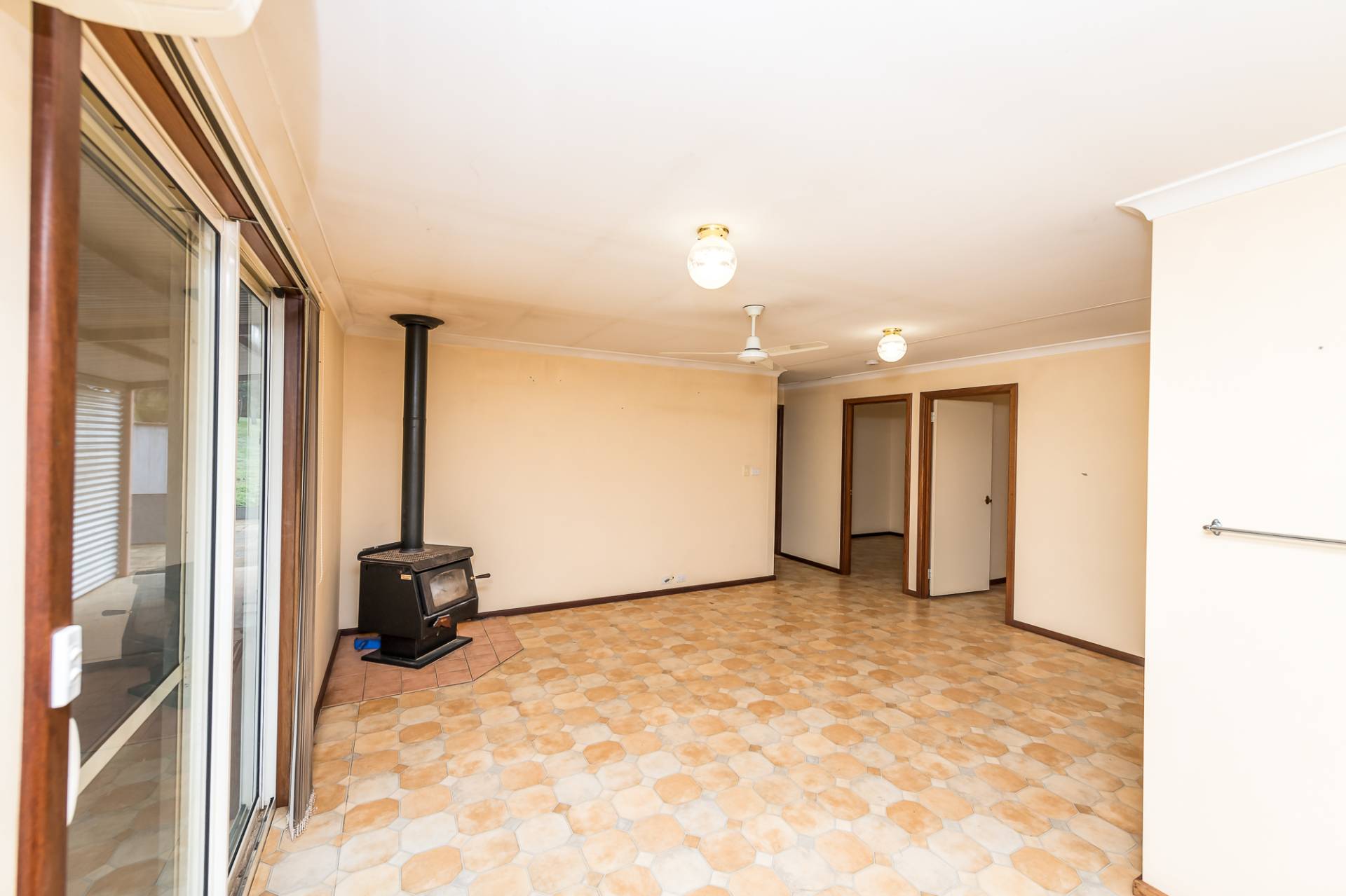 The main living area offers a great space with a fireplace in the corner, a ceiling fan, split system air conditioner and sliding doors giving access to  the backyard.