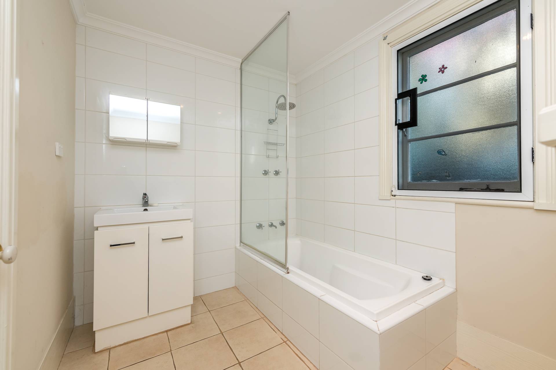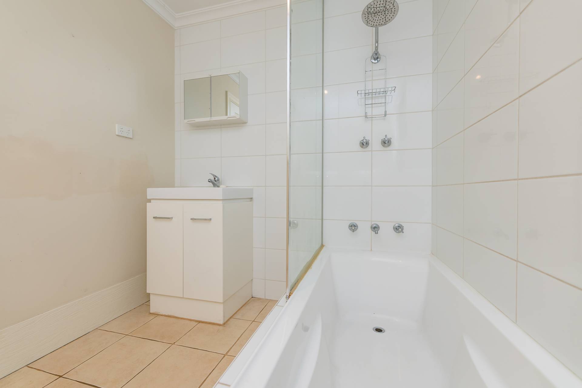 The updated bathroom features a shower over bath arrangement as well as a cleverly hidden toilet.