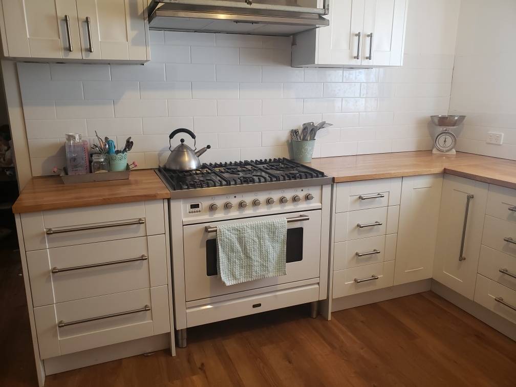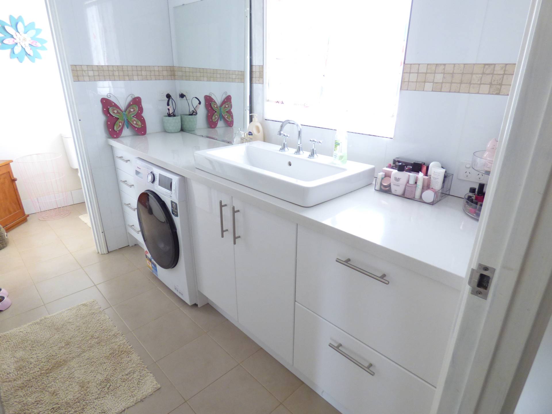 In the centre of the home is the open plan lounge dining area, complete with ceiling fans in both areas. The hub of the home has to be the large kitchen which has a 900mm gas oven, a farmhouse  sink,  and loads of  bench and cupboard space and a very large walk in pantry. No matter how many appliances you have you will definitely be able to store them here!!