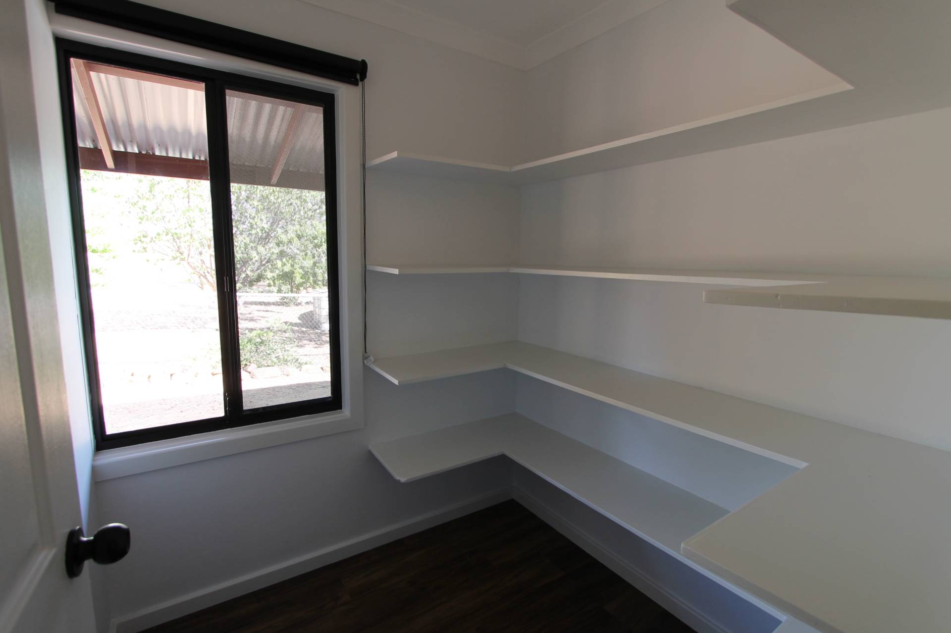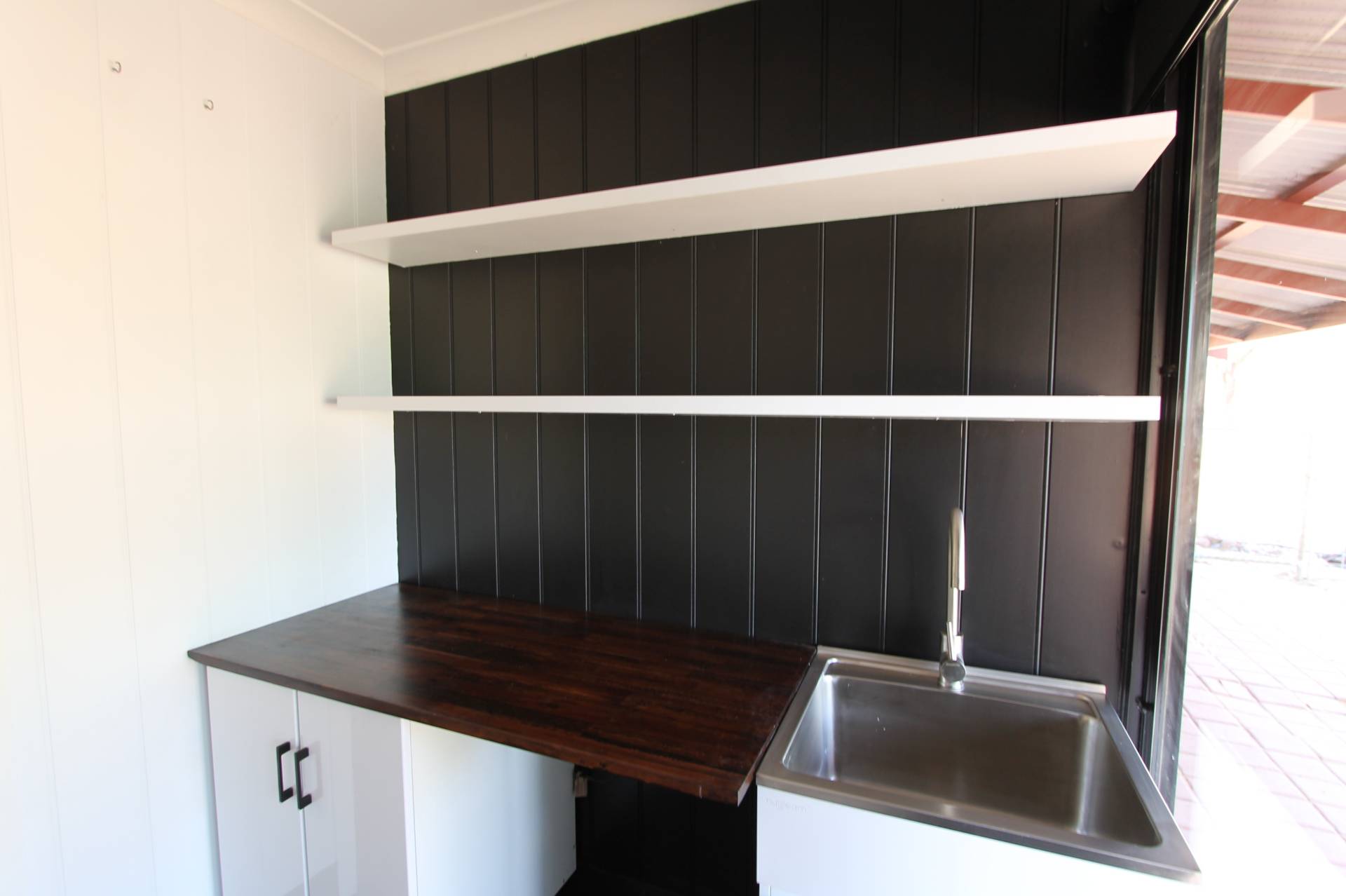 The laundry has been updated with new cupboards, a bench, and floating storage shelves. Side access to the house is also available through a sliding door.