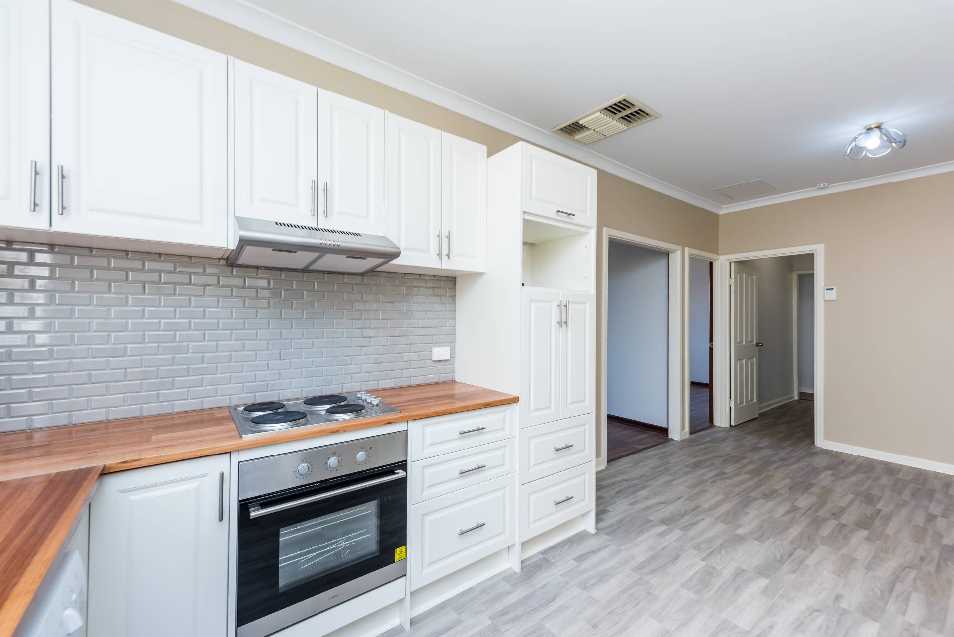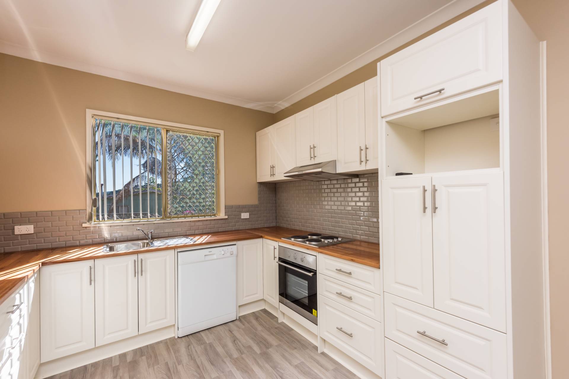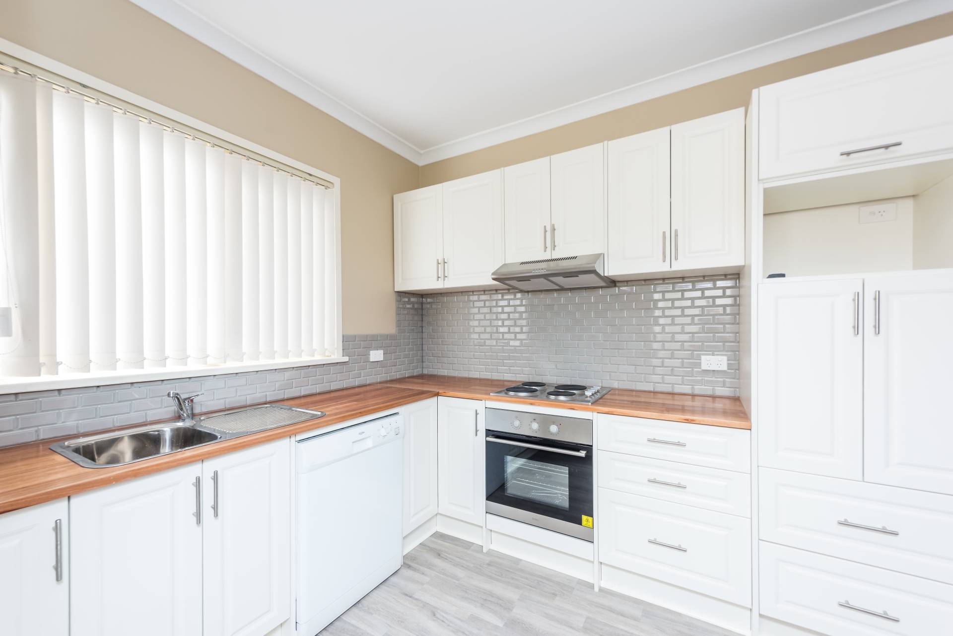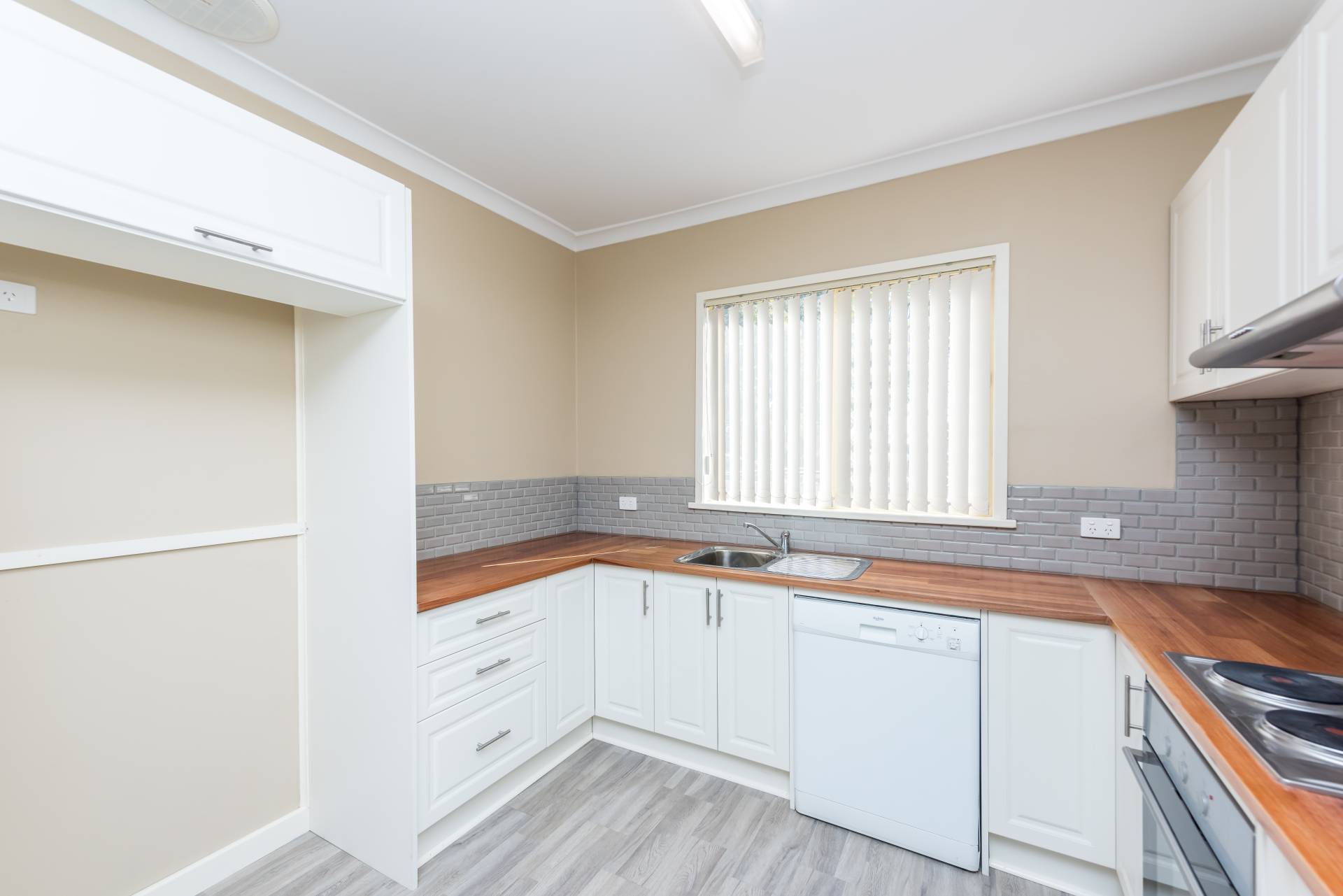 Updated kitchen with stainless steel under bench oven, cook top and range hood and a Dishlex dishwasher