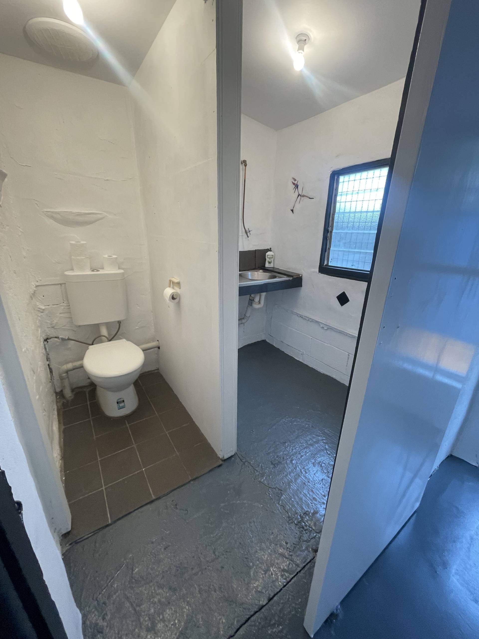 A separate toilet and wash basin is at the rear.