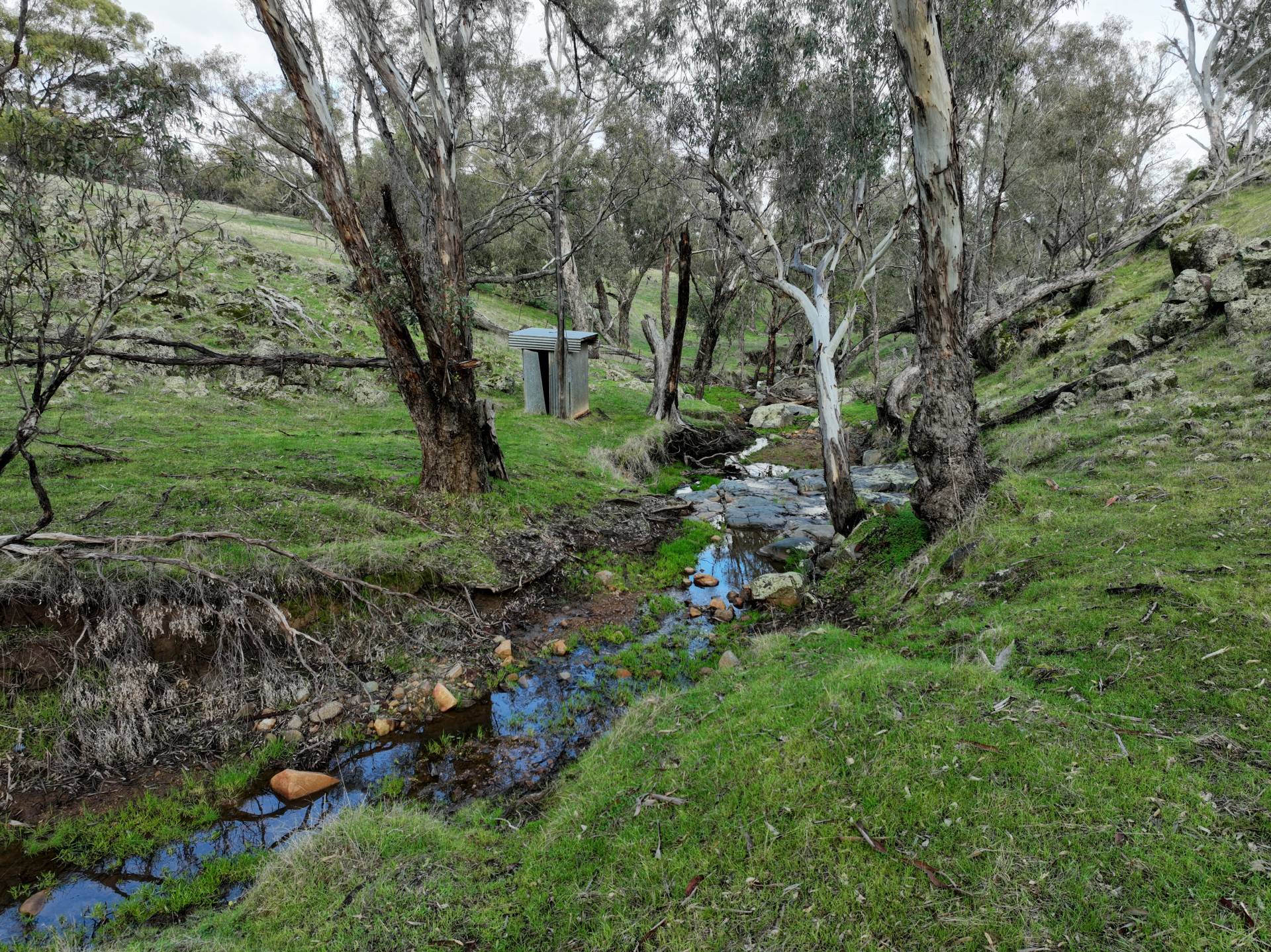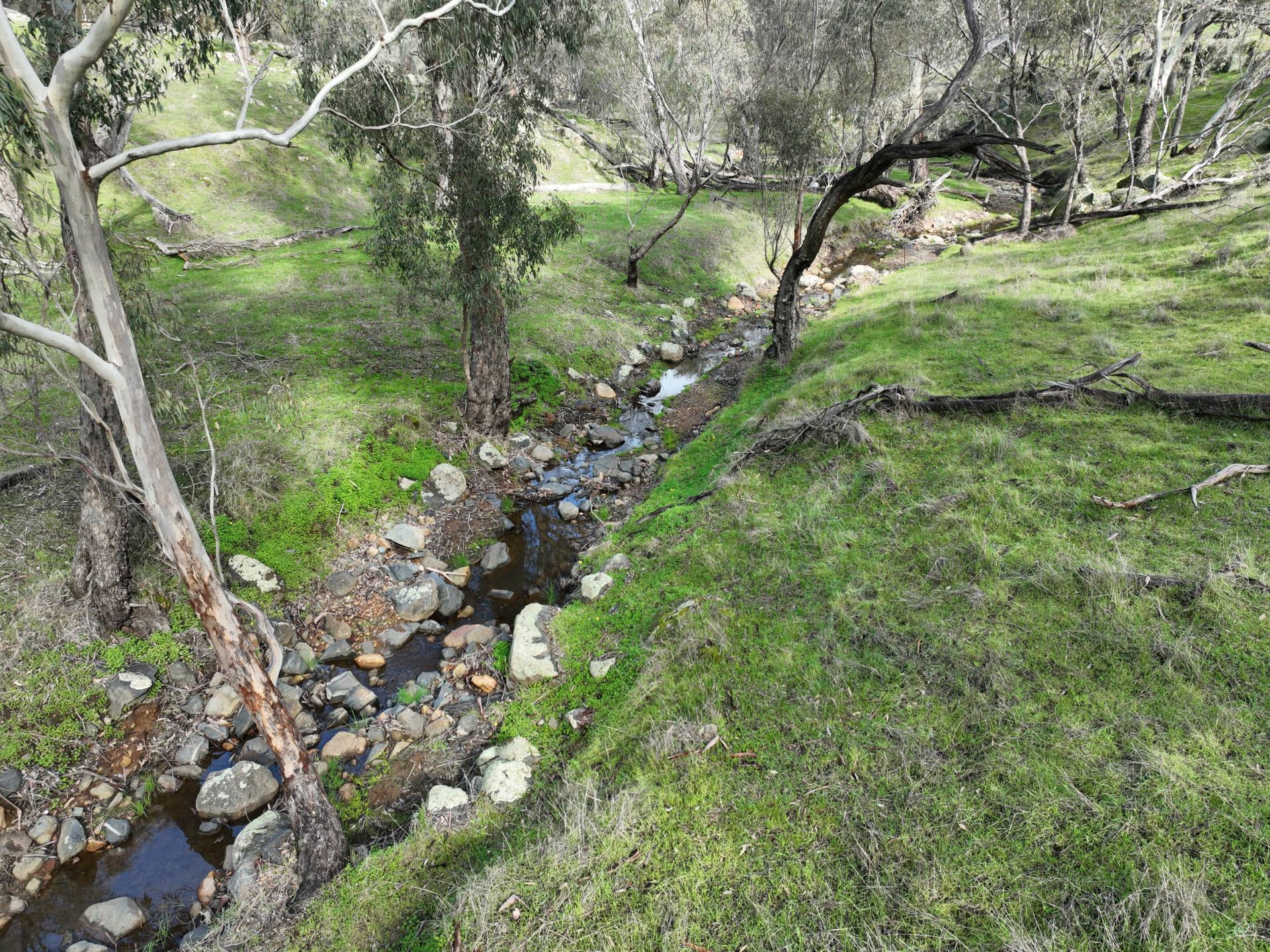 The property itself is a good mix of mostly cleared open paddocks and native bushland with majestic towering trees and natural rocky outcrops. A running creek comes from the property's right side and flows down to the lower end, with little waterfalls along the way. There's much to explore here, and you can’t see it all at once.