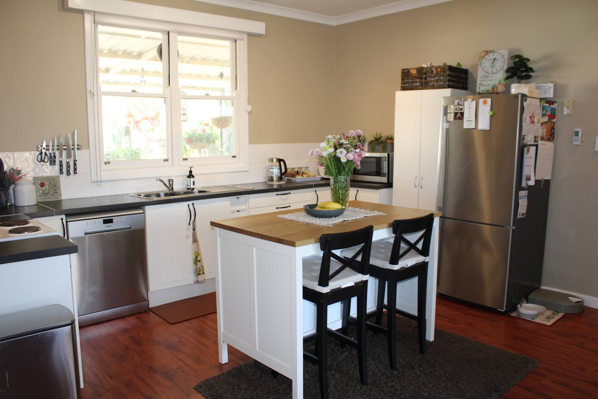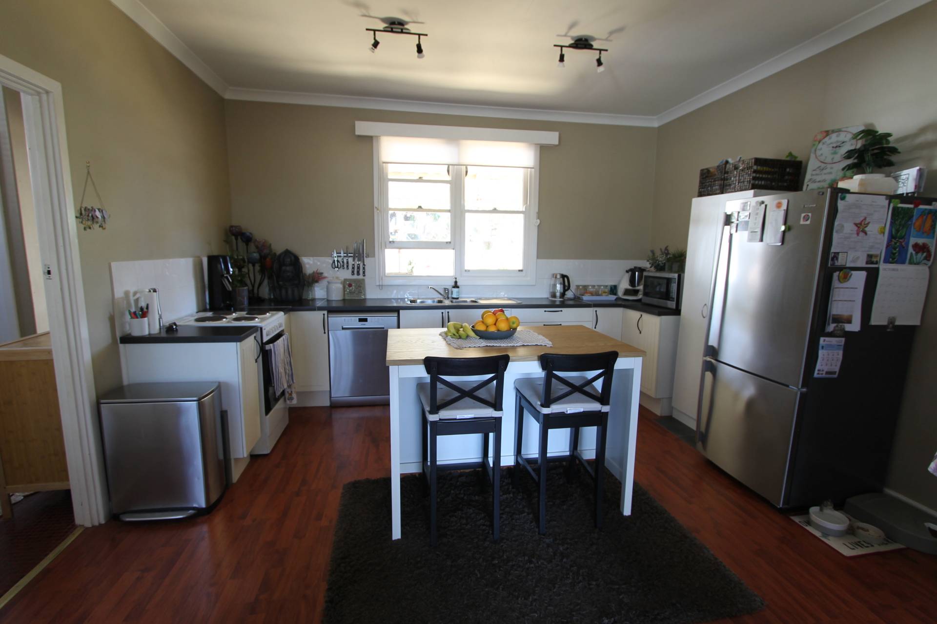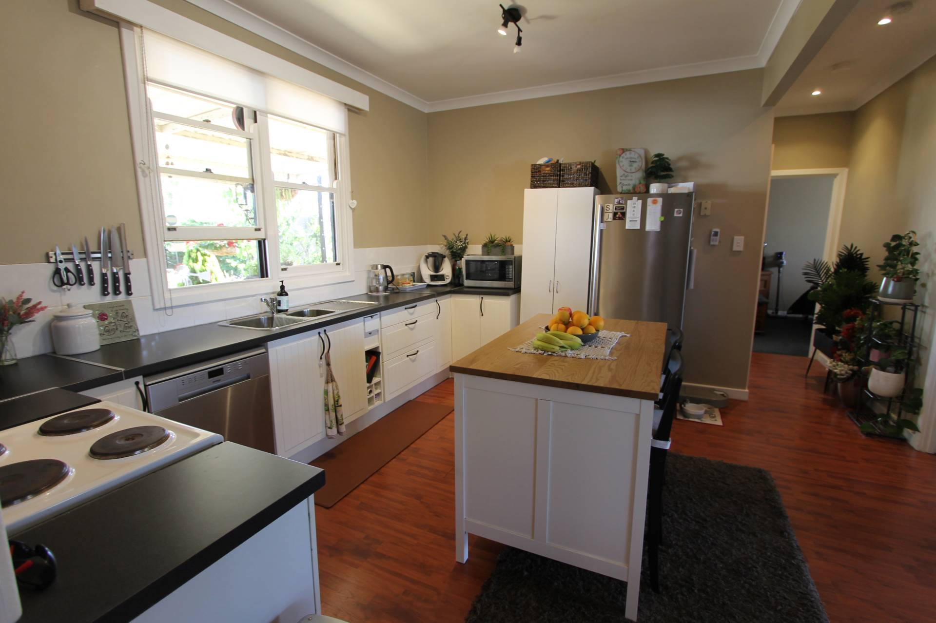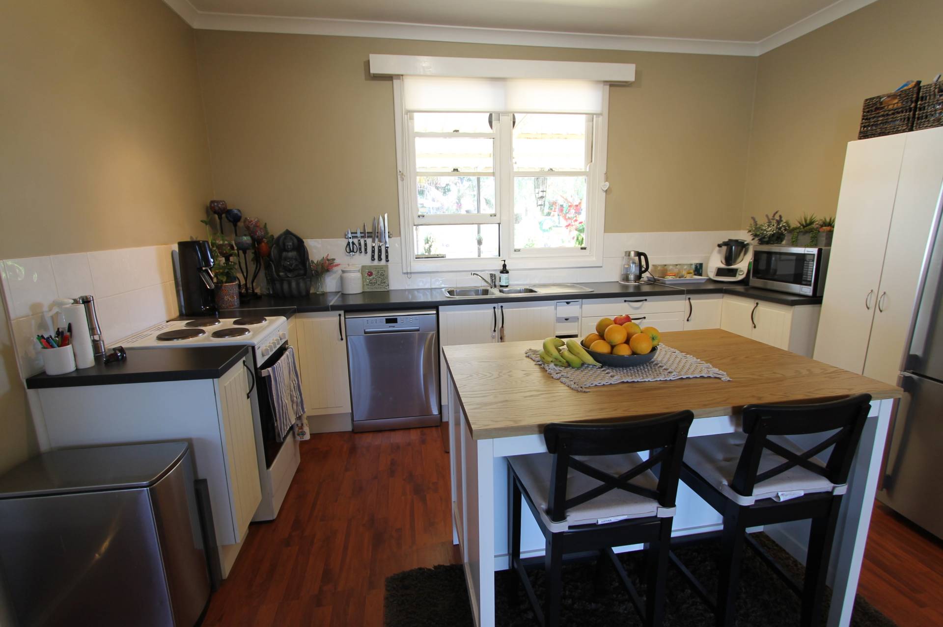 The modern kitchen is very productive with lots of storage and plenty of bench space. The island bench is an added bonus for ease of meal prepping and cooking. Featuring electric cooking and a dishwasher and views over your well-set rear patio and gardens.
