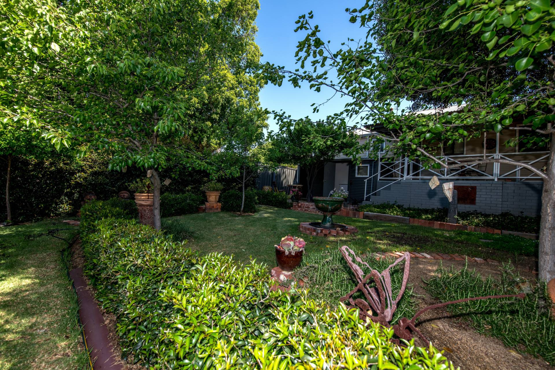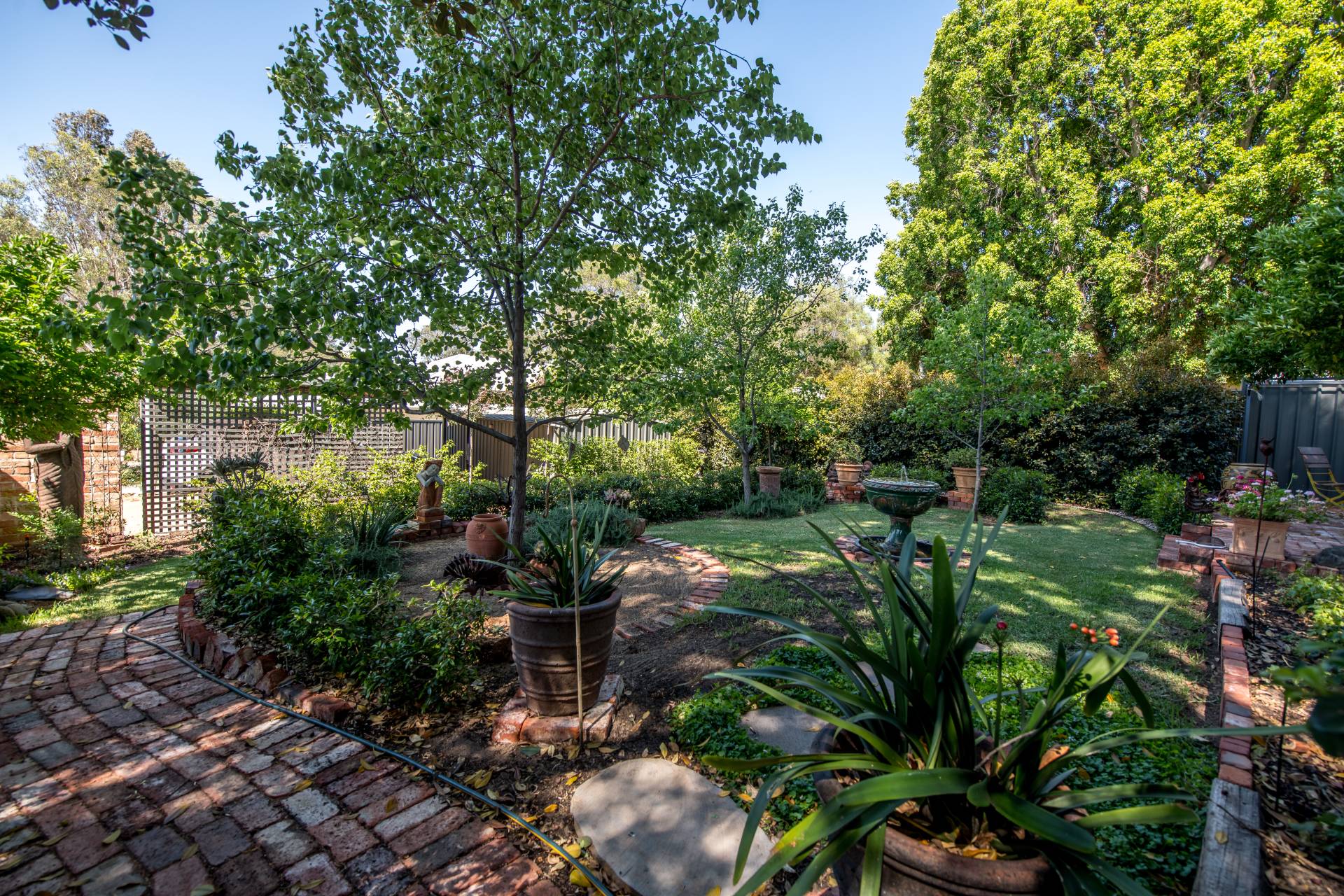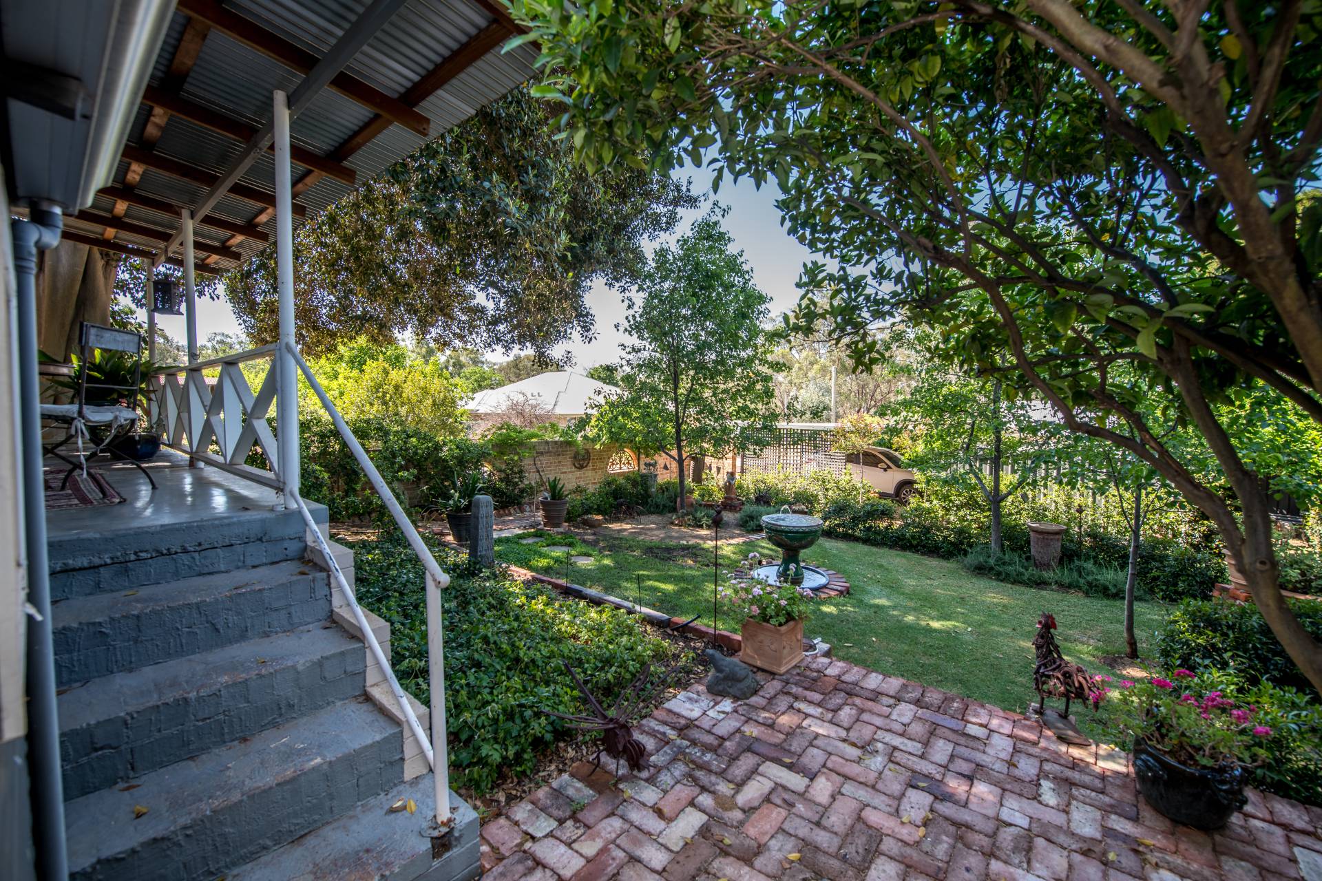 The back porch is where your morning tea and afternoon drinks should be spent! From this cozy spot, you can keep an eye on the neighbourhood while overlooking your lush garden with a green lawn, various plants and trees, and stunning brickwork, including an external feature brick wall and water fountain.