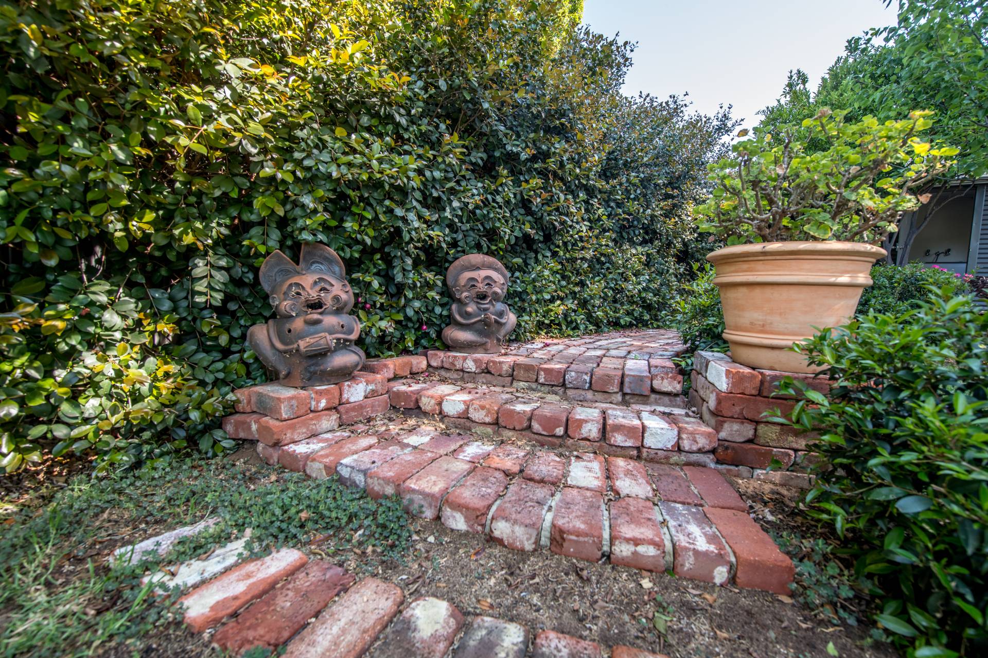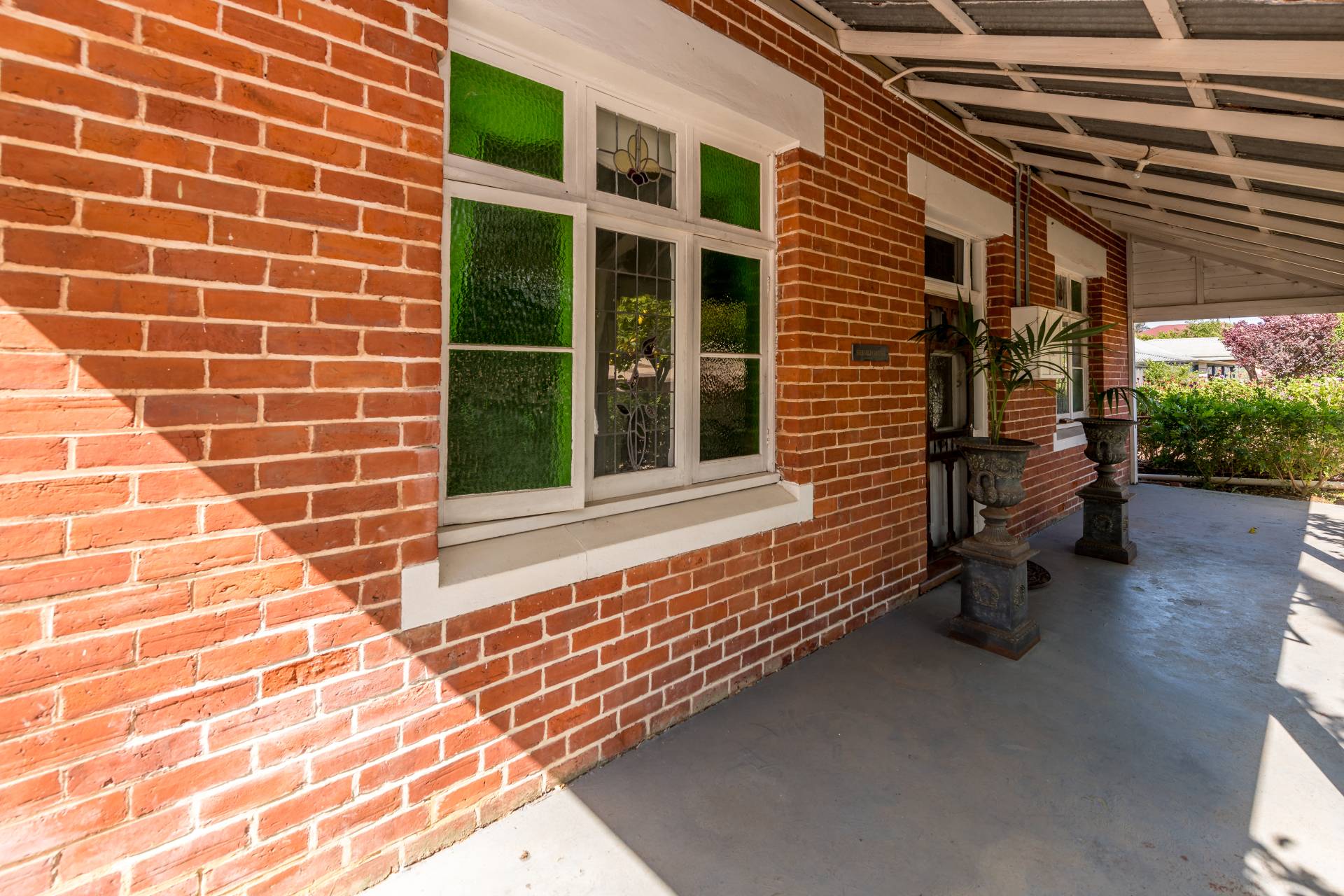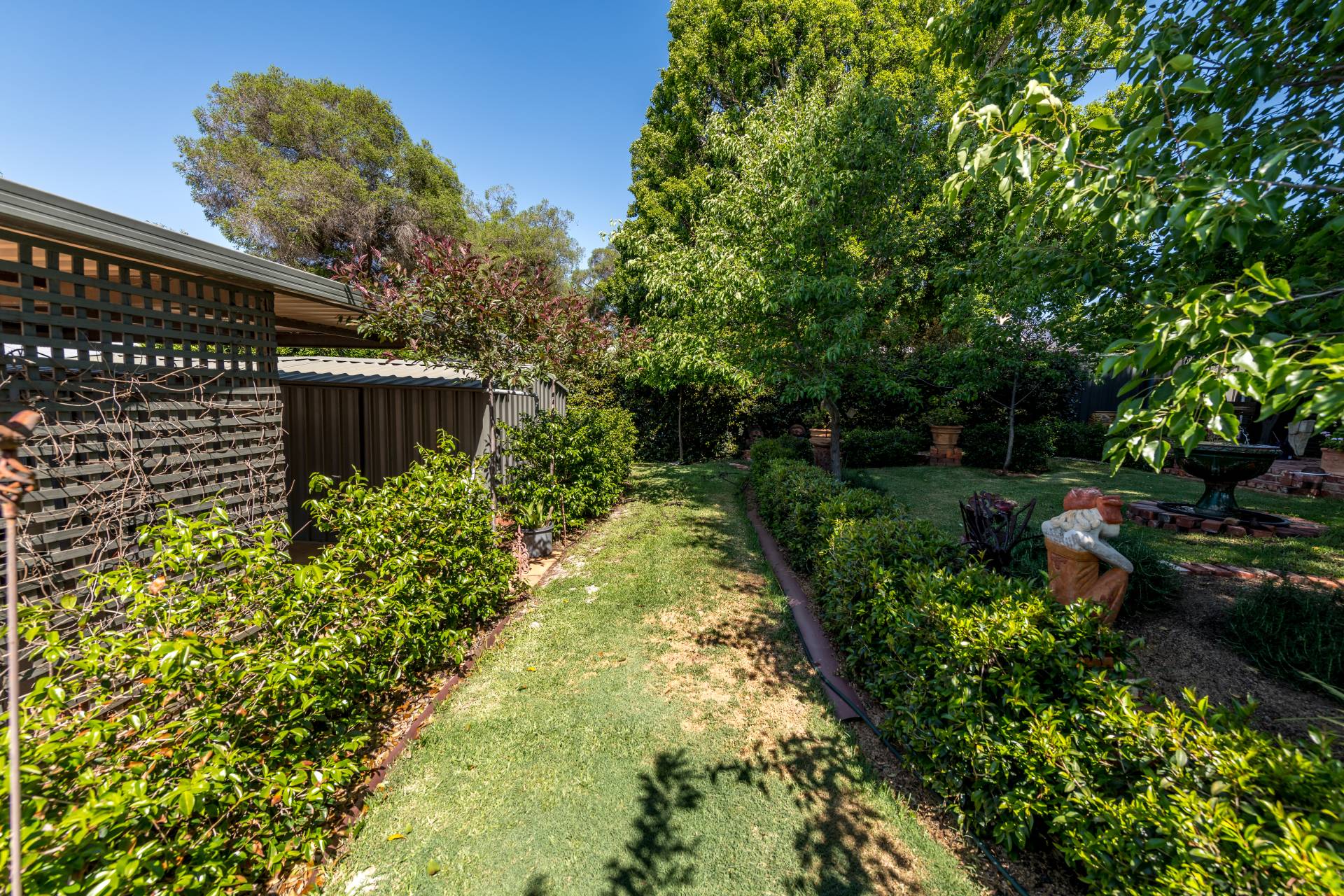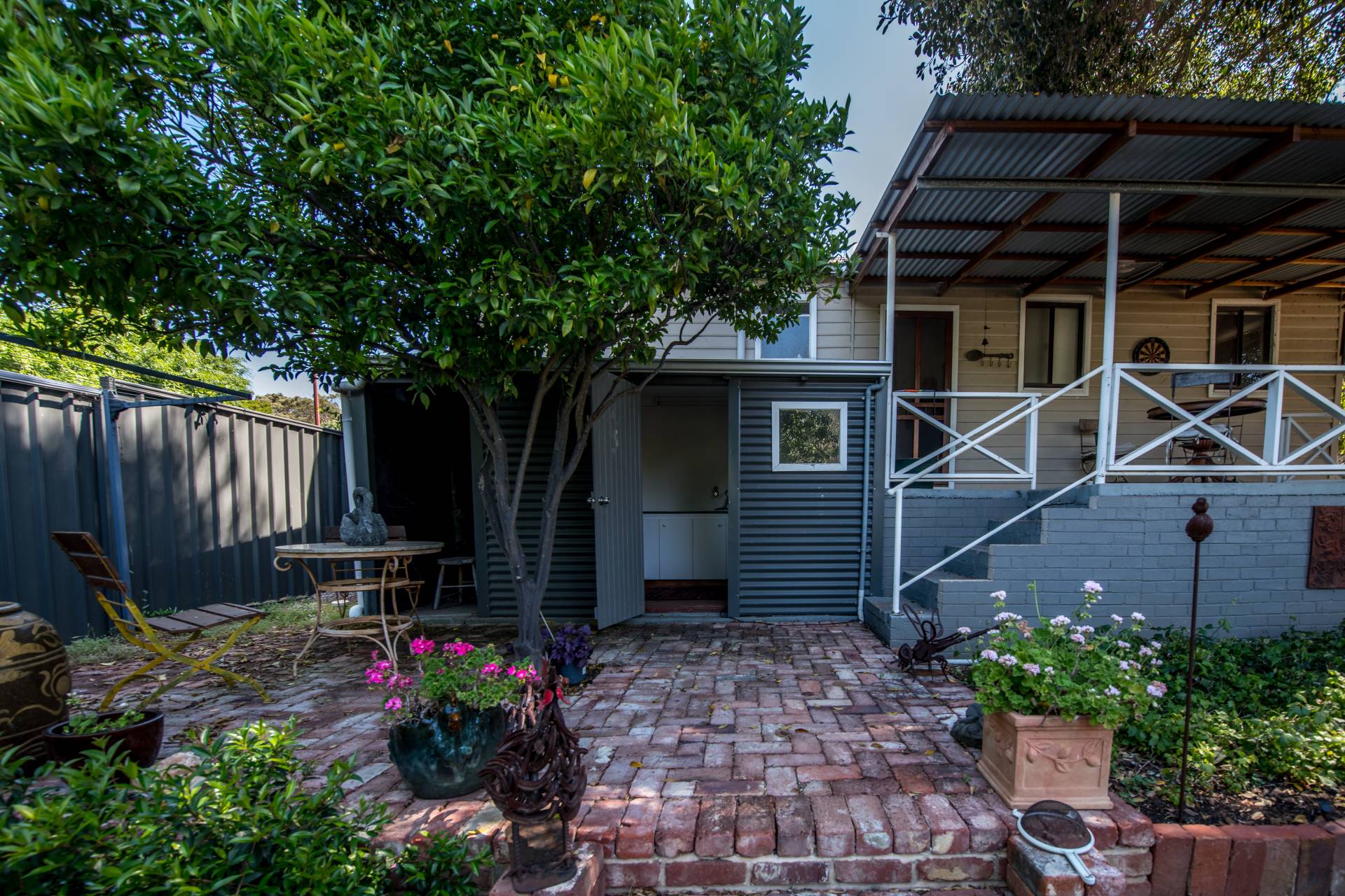 The back porch is where your morning tea and afternoon drinks should be spent! From this cozy spot, you can keep an eye on the neighbourhood while overlooking your lush garden with a green lawn, various plants and trees, and stunning brickwork, including an external feature brick wall and water fountain.