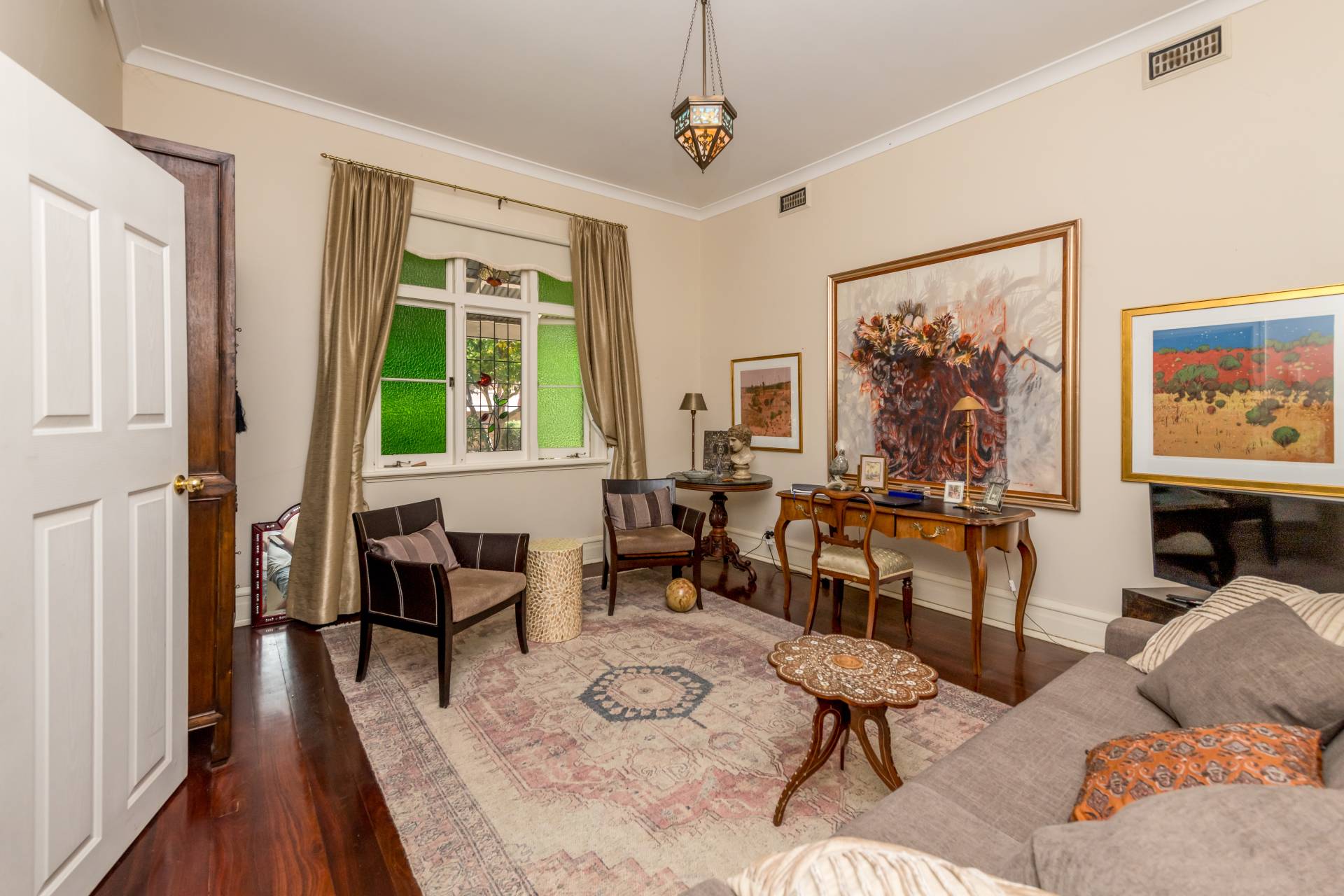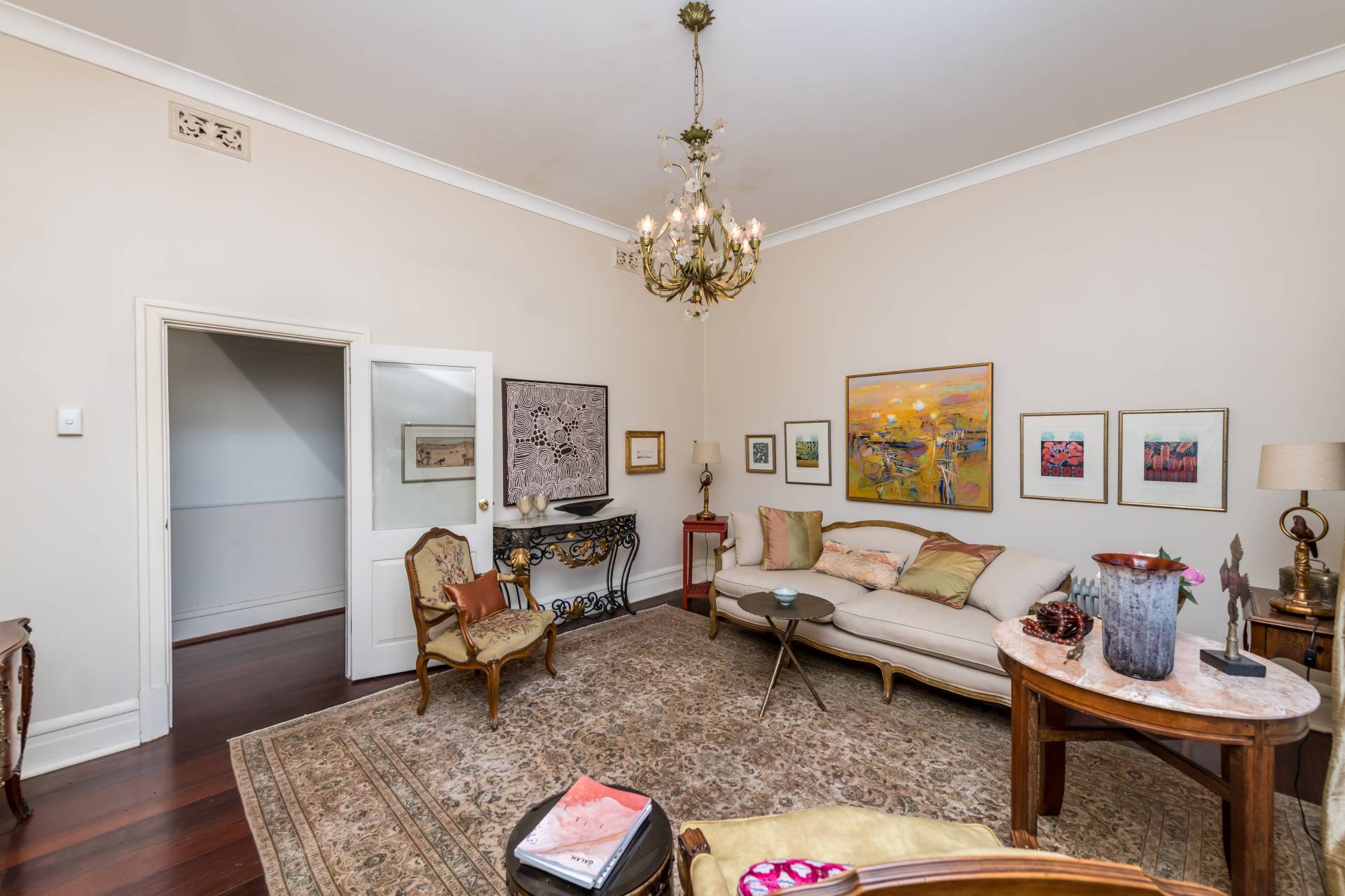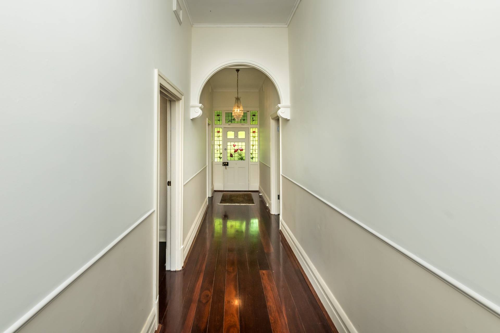 Stepping inside, we enter a traditional-style layout with a grand hallway boasting high ceilings and polished hardwood flooring. The hallway gives way to the 3 bedrooms, living room, kitchen/dining and bathroom. Almost every room in this home is enormous in size, creating a sense of grandeur space that you don't get in homes today.