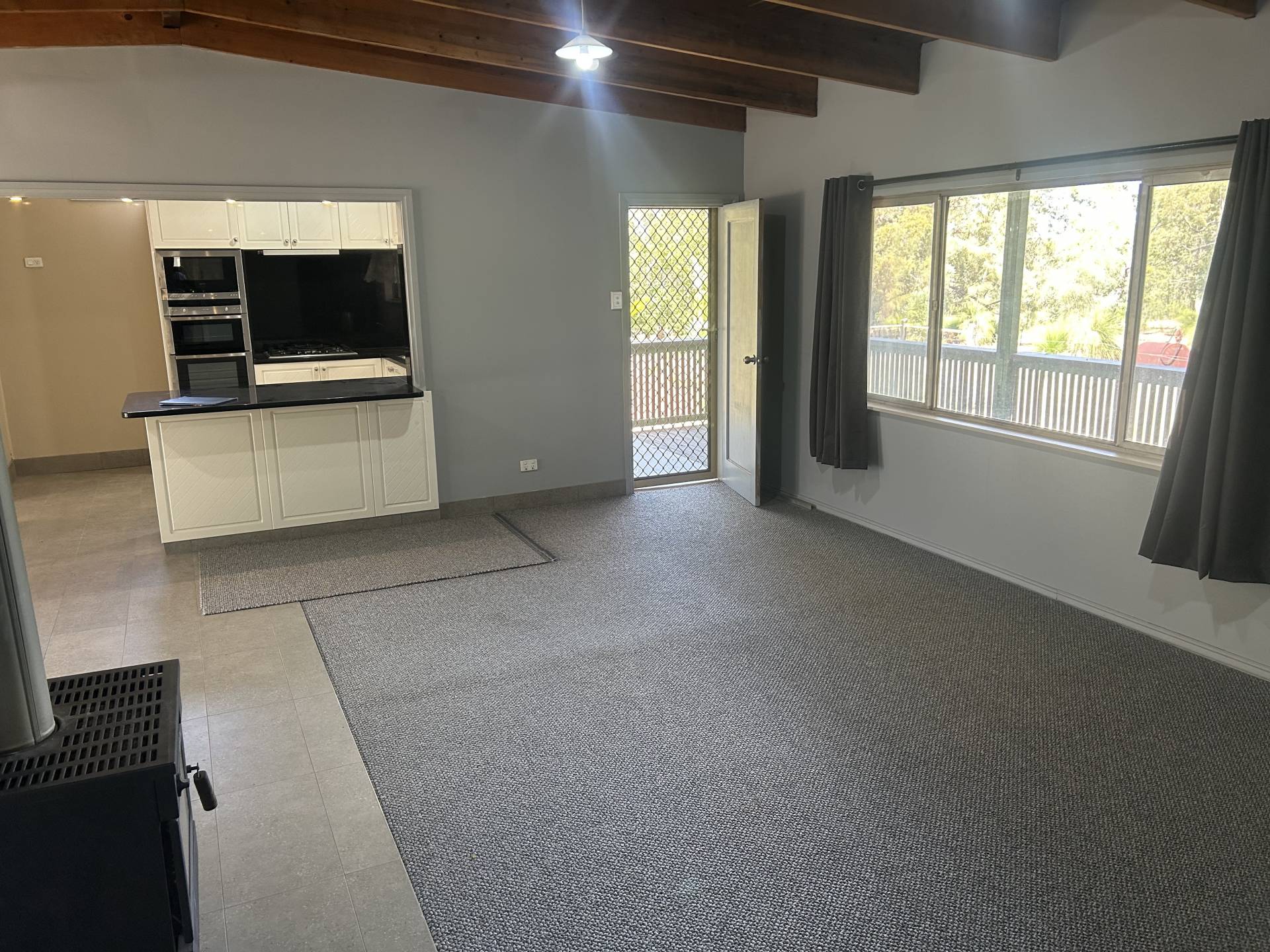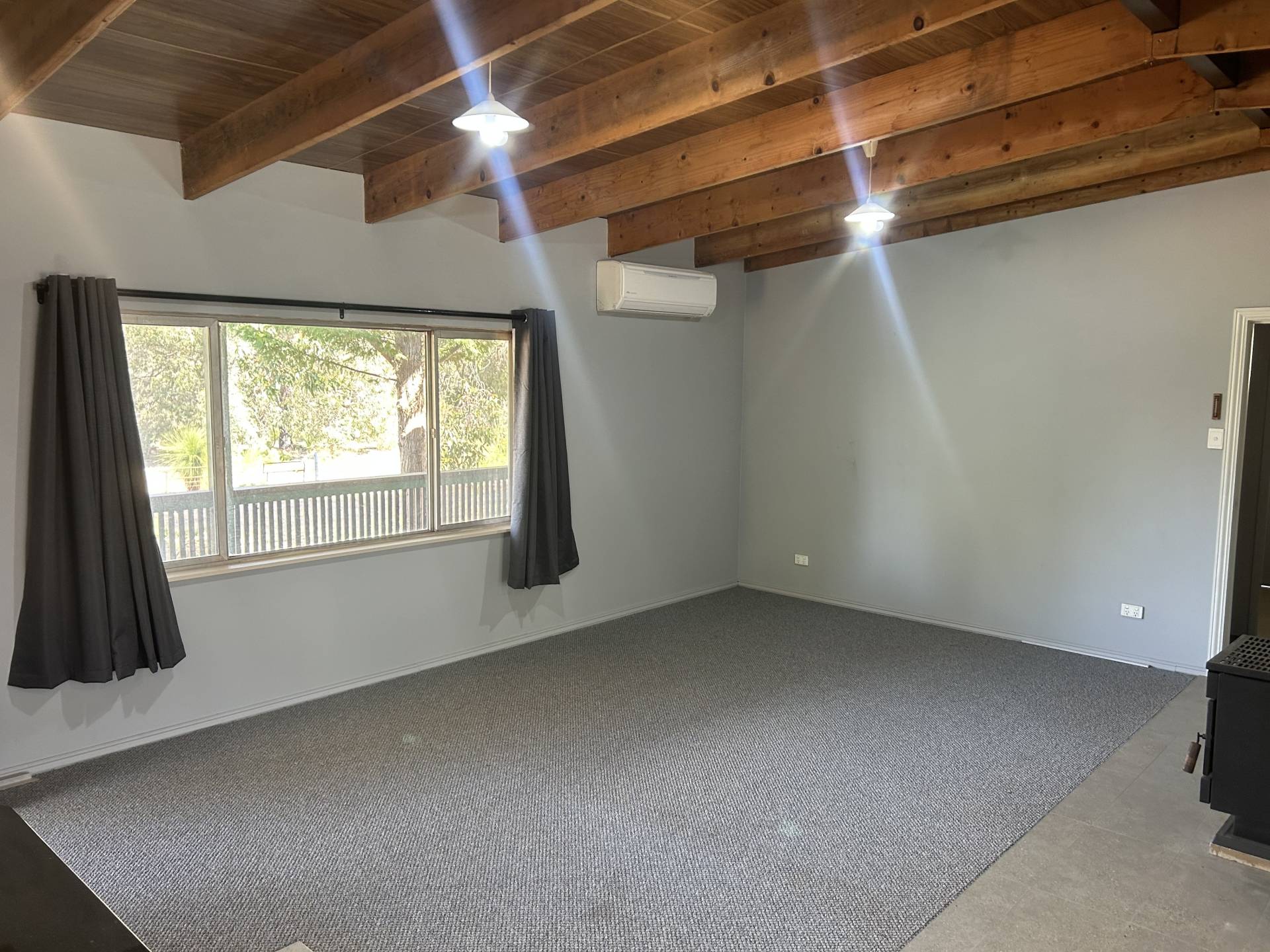From the front door, you enter the tidy living space featuring a split system AC and a wood burner fireplace. This section is mostly carpeted, with the exception of the dining area, which was recently renovated with grey tiling.
