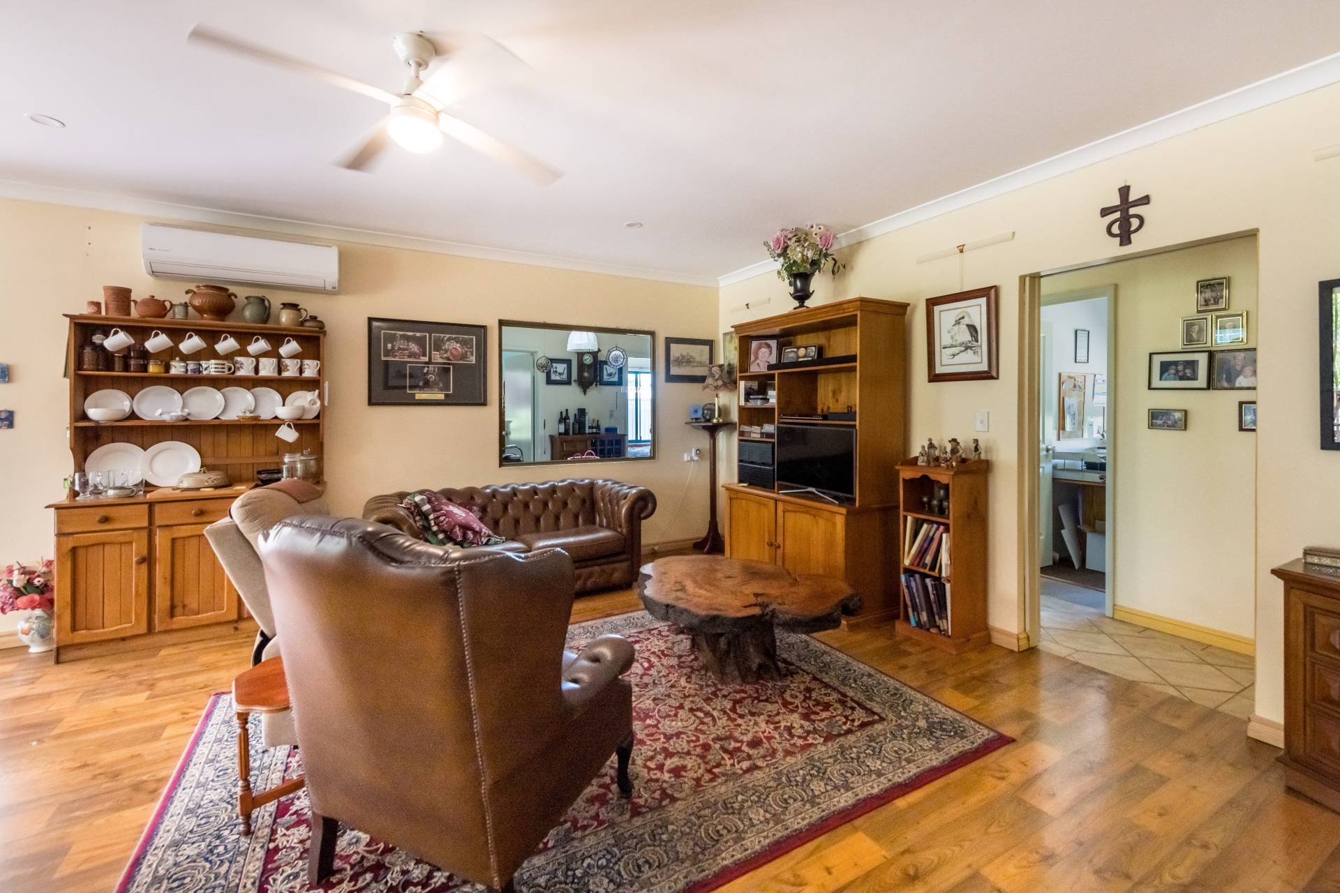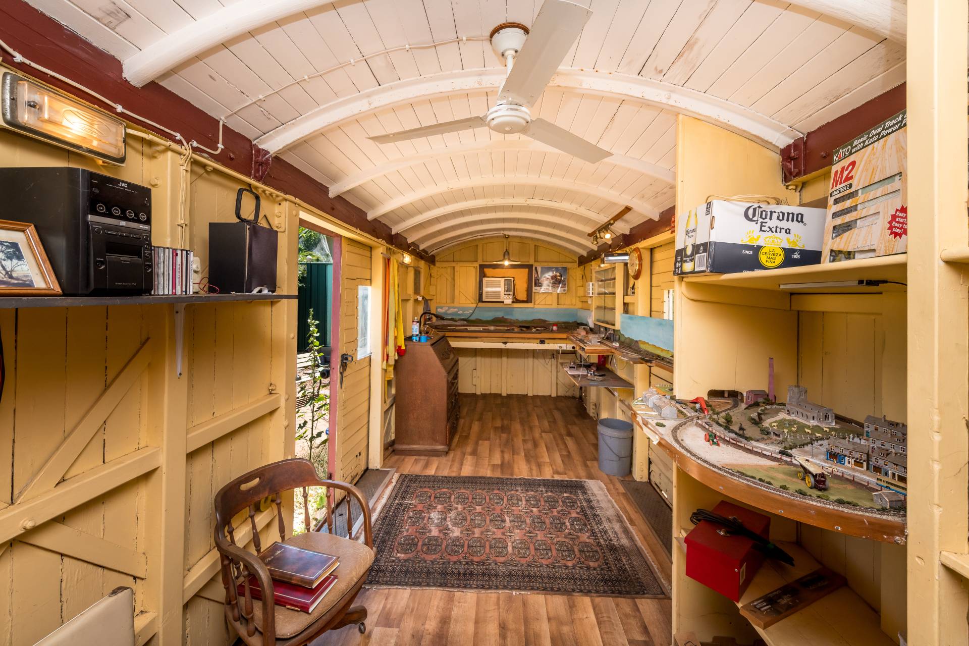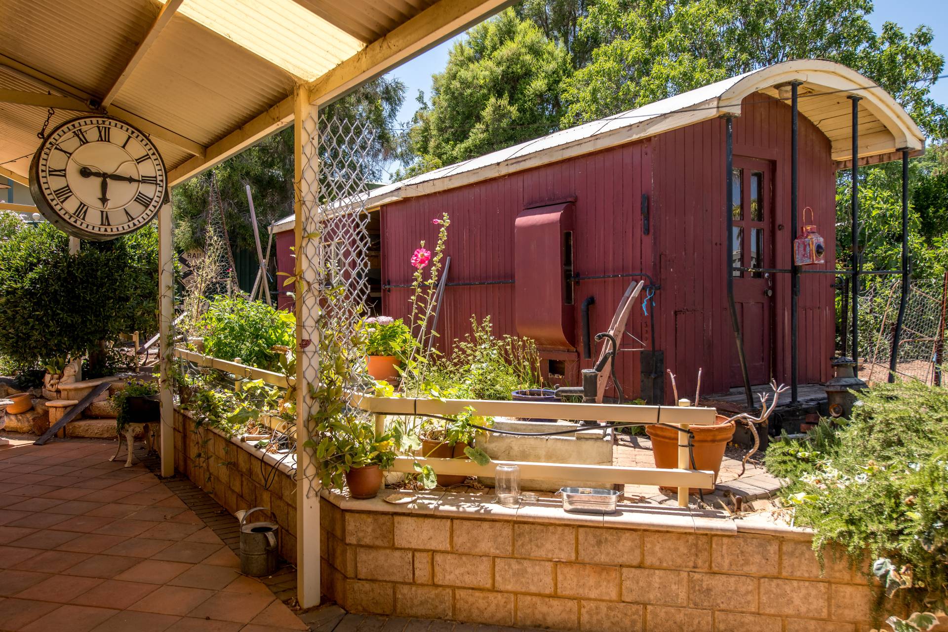 Outside is the alfresco and veranda, fully paved and ready for a barbeque; surrounding are lush established gardens and a gorgeous antique train carriage decked out with lights, Pot Belly Stoves and its own little model railway system. Truly a unique aspect of this property.