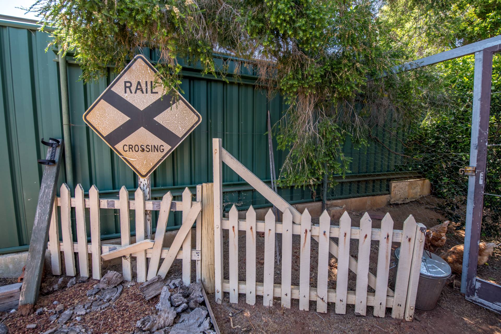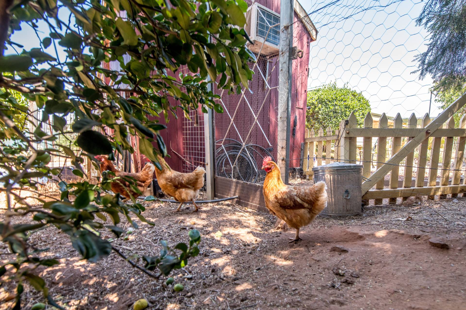Behind the train carriage, chickens run happily in a fully fenced enclosed pen, and chook run with various citrus trees and potential garden beds.