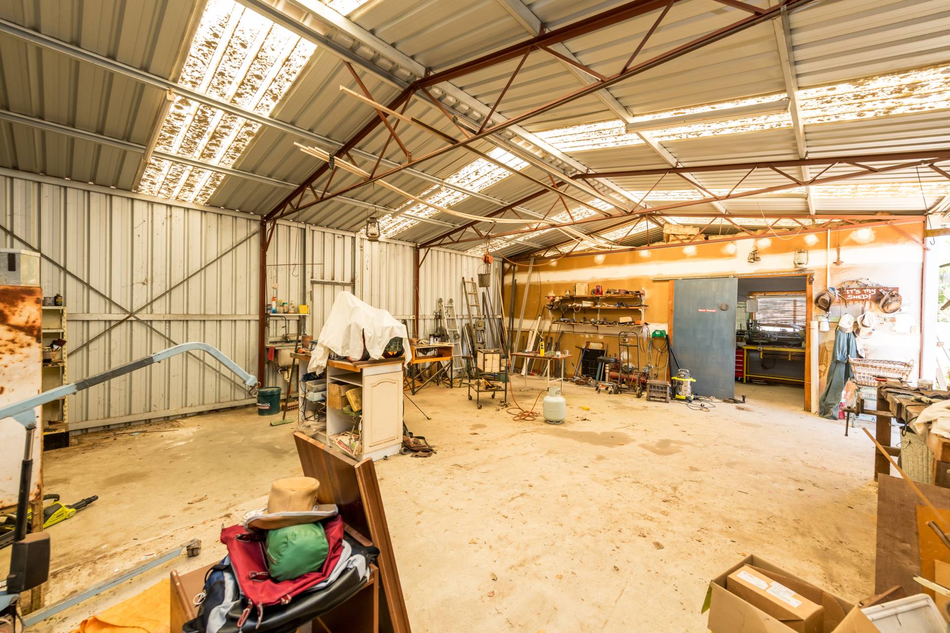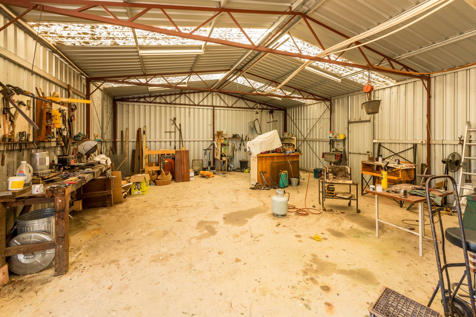 A large work shed is found down a level from the house and features a sliding door, power and concrete floor. It's divided into two sections: the main larger workspace and a separate storage room, ideal for designing and crafting.