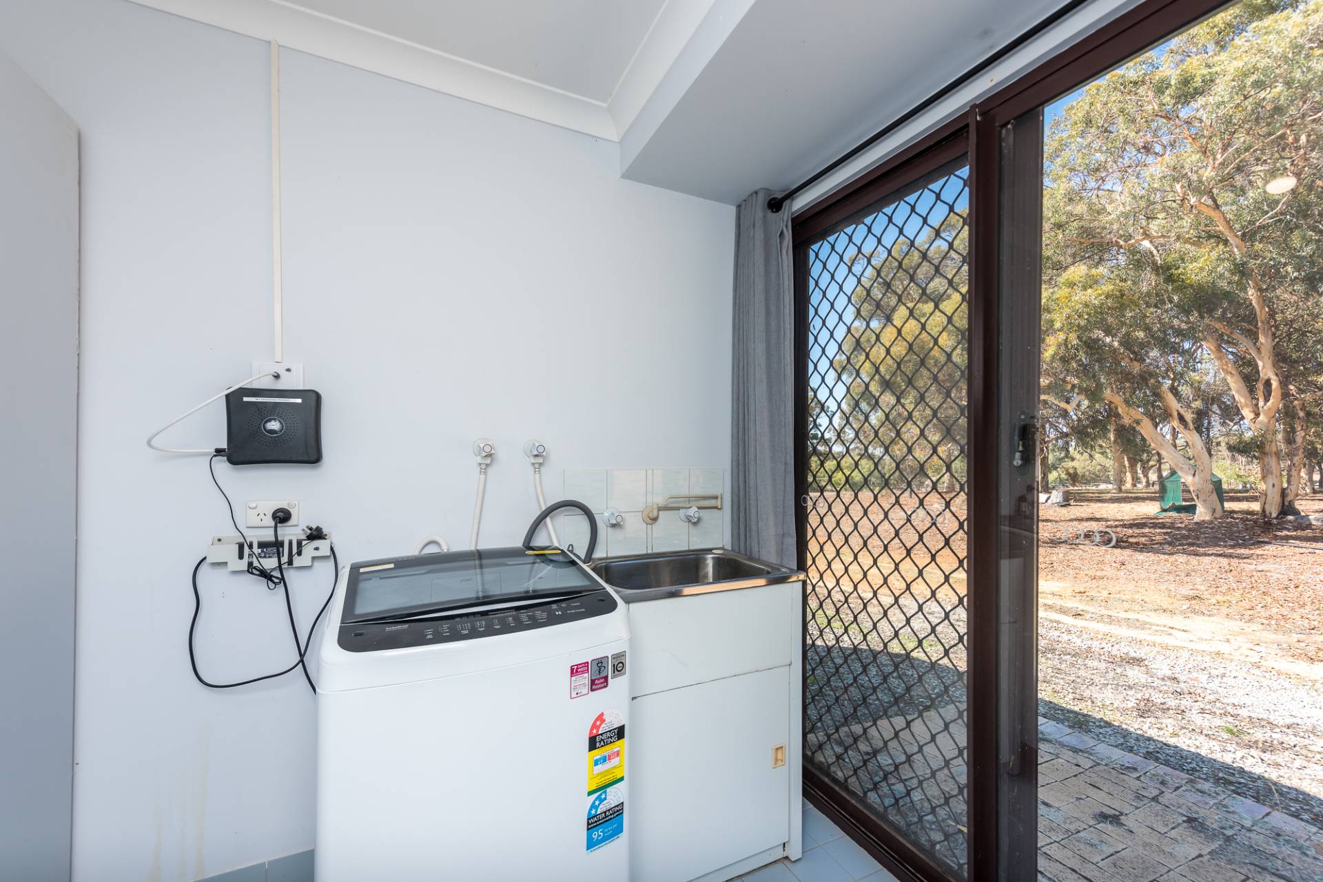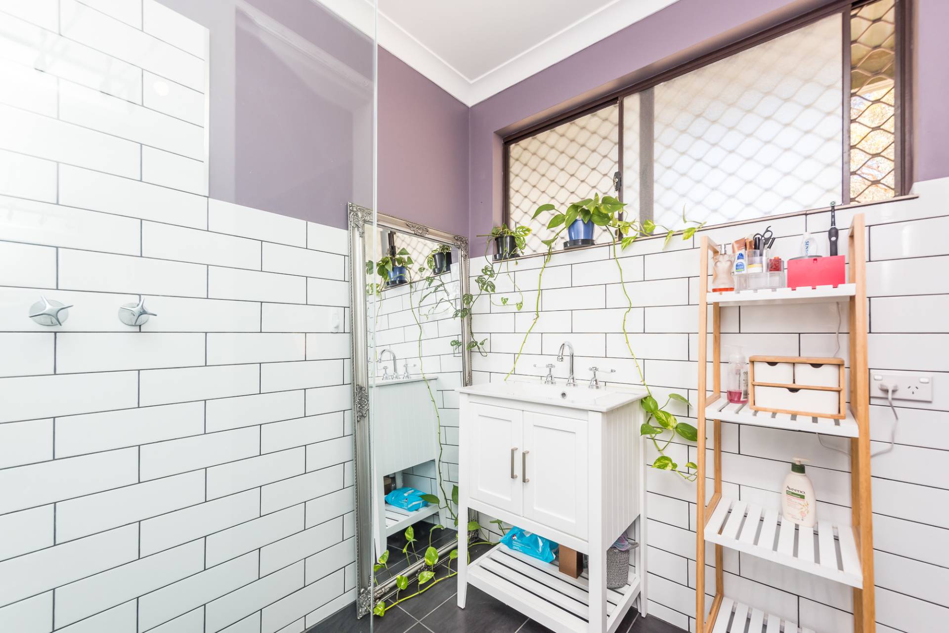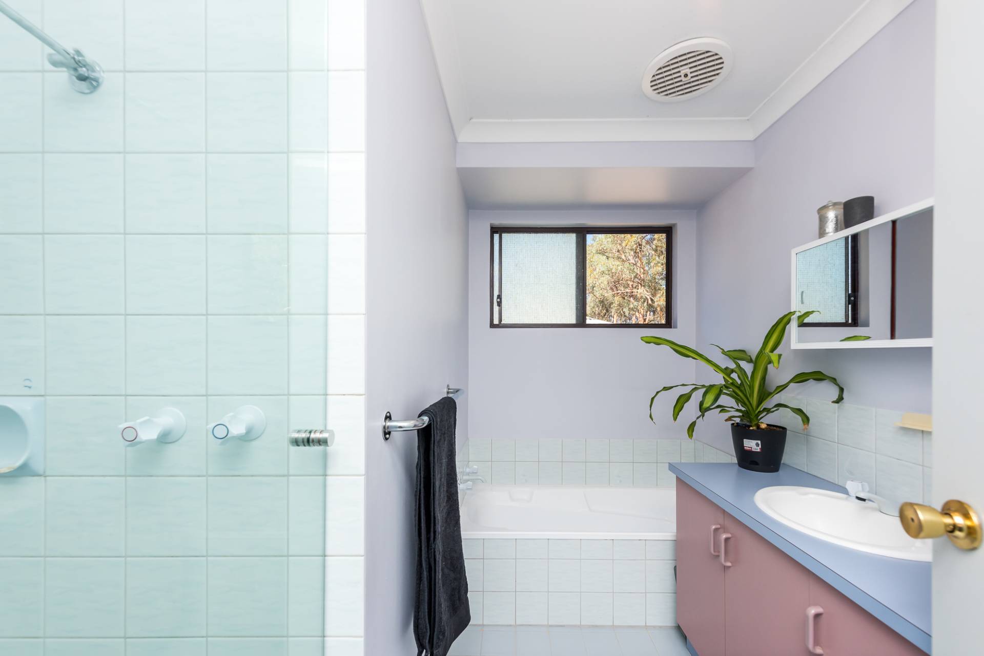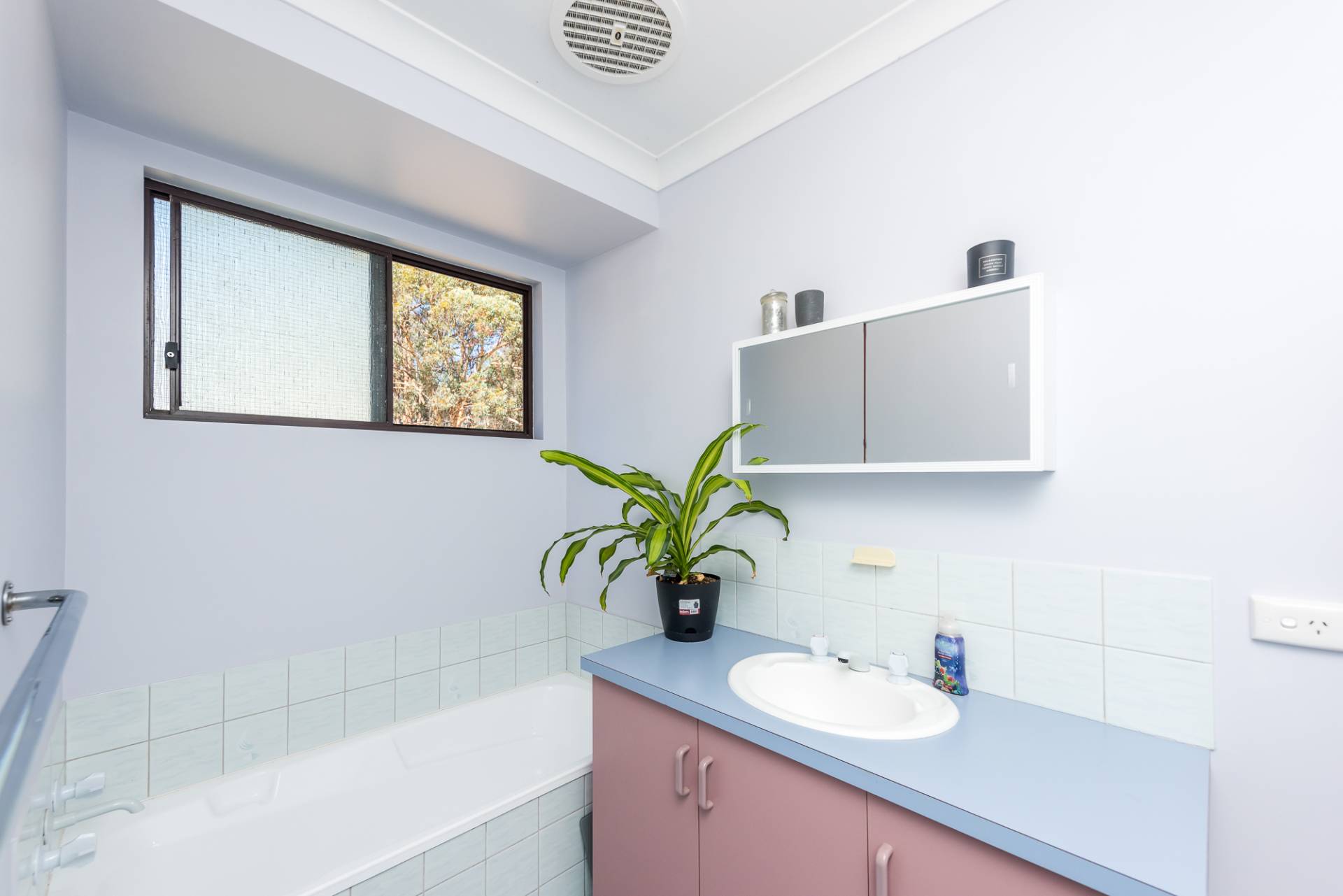 The main bathroom features a shower, separate bath tub and vanity unit, plus a wall cabinet for further storage. The laundry is well sized and has rear access through the sliding glass door. The separate toilet is off the laundry.