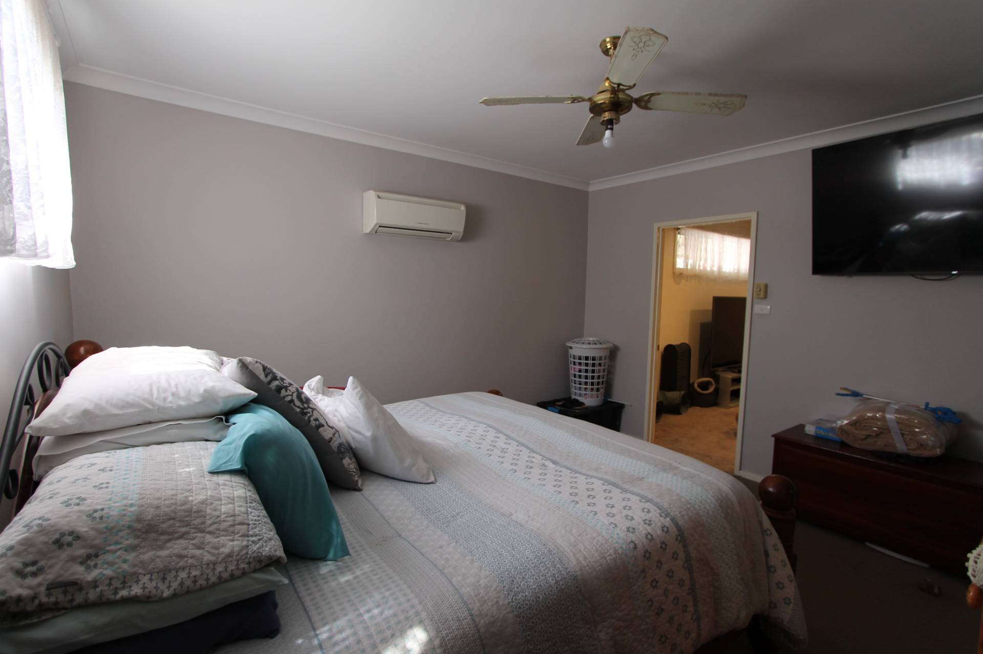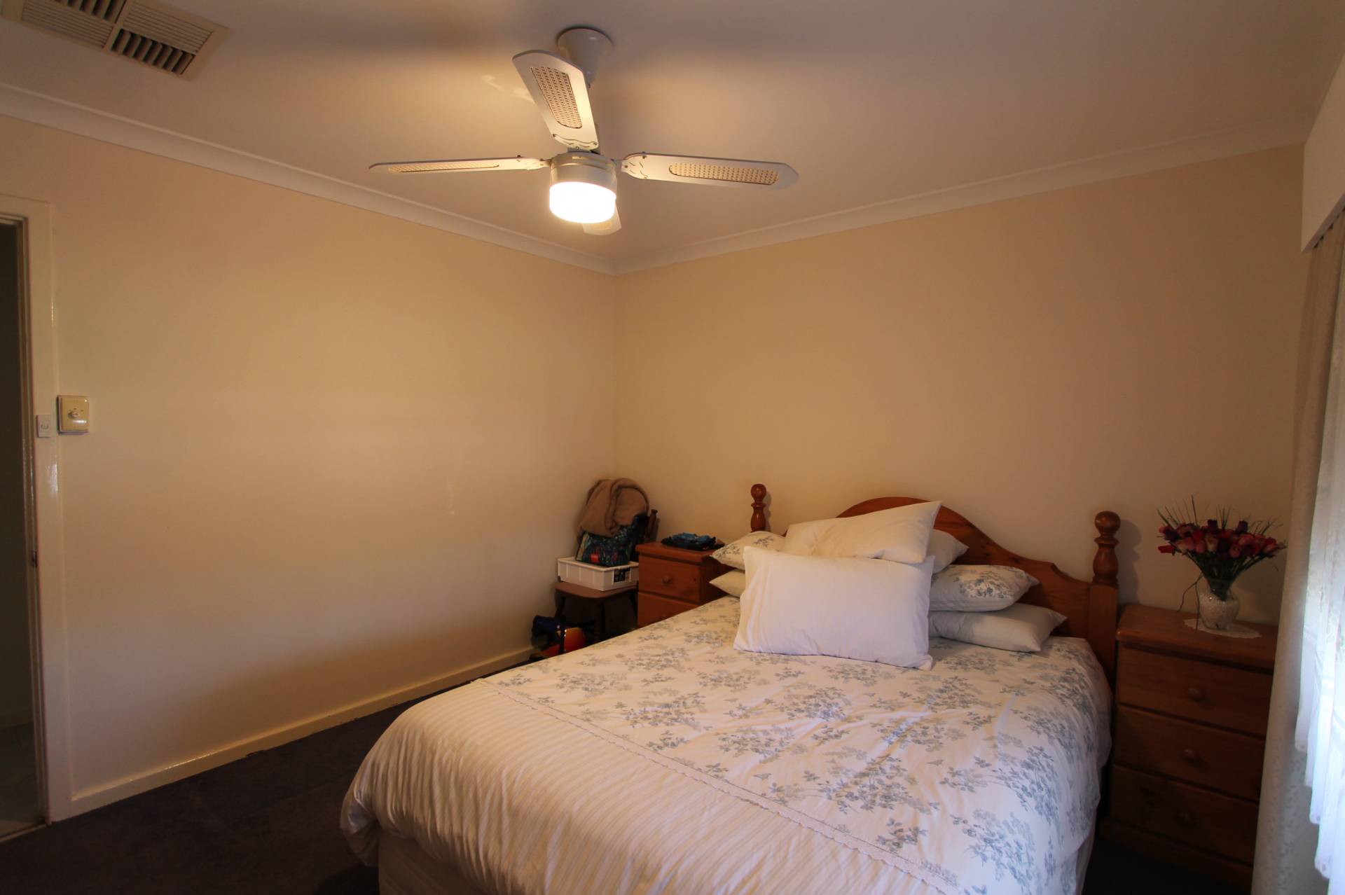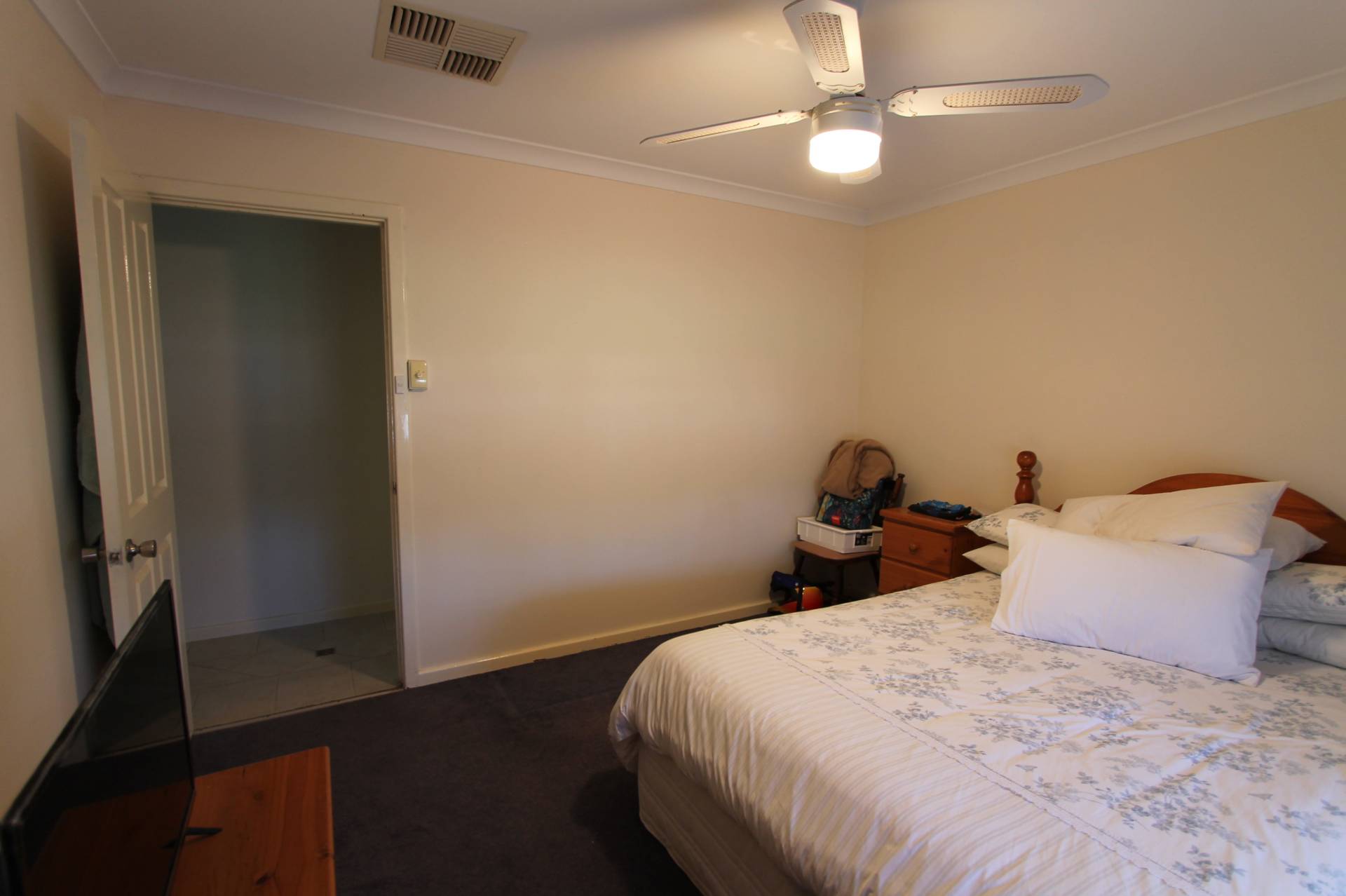 The master bedroom (4m x 6m)  is off the sunken lounge area (away from your minor bedrooms). Serviced by another split system (and ceiling fan), you’ll never feel the heat of summer or the cold winters! The large walk-in robe has plenty of space and the ensuite features a vanity, toilet, and large corner shower unit.