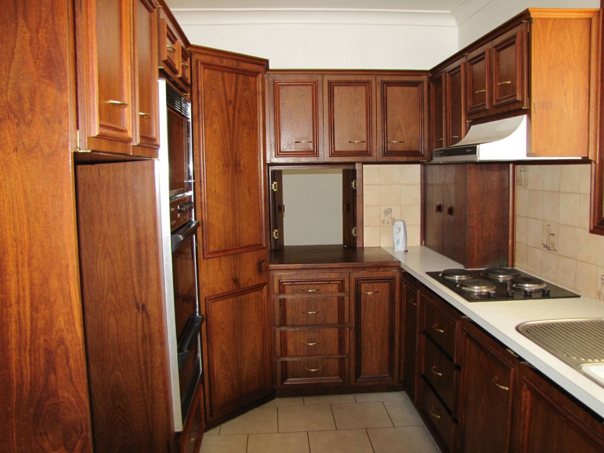 The kitchen has lots of cupboards and is very functional.