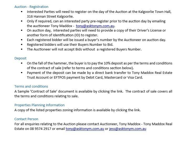 Auction will be at the KALGOORLIE TOWN HALL on the 30th of April 2024 at 9am - Please arrive by 8.30am with your Drivers License to register for bidding.