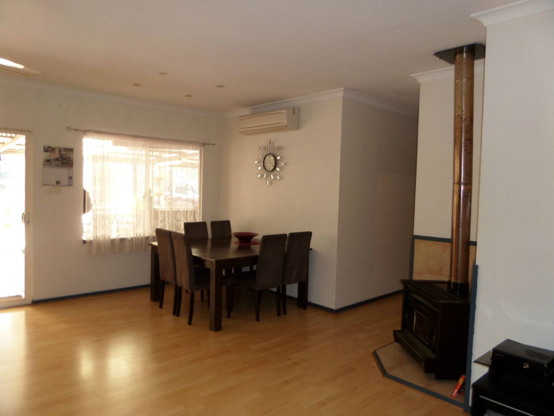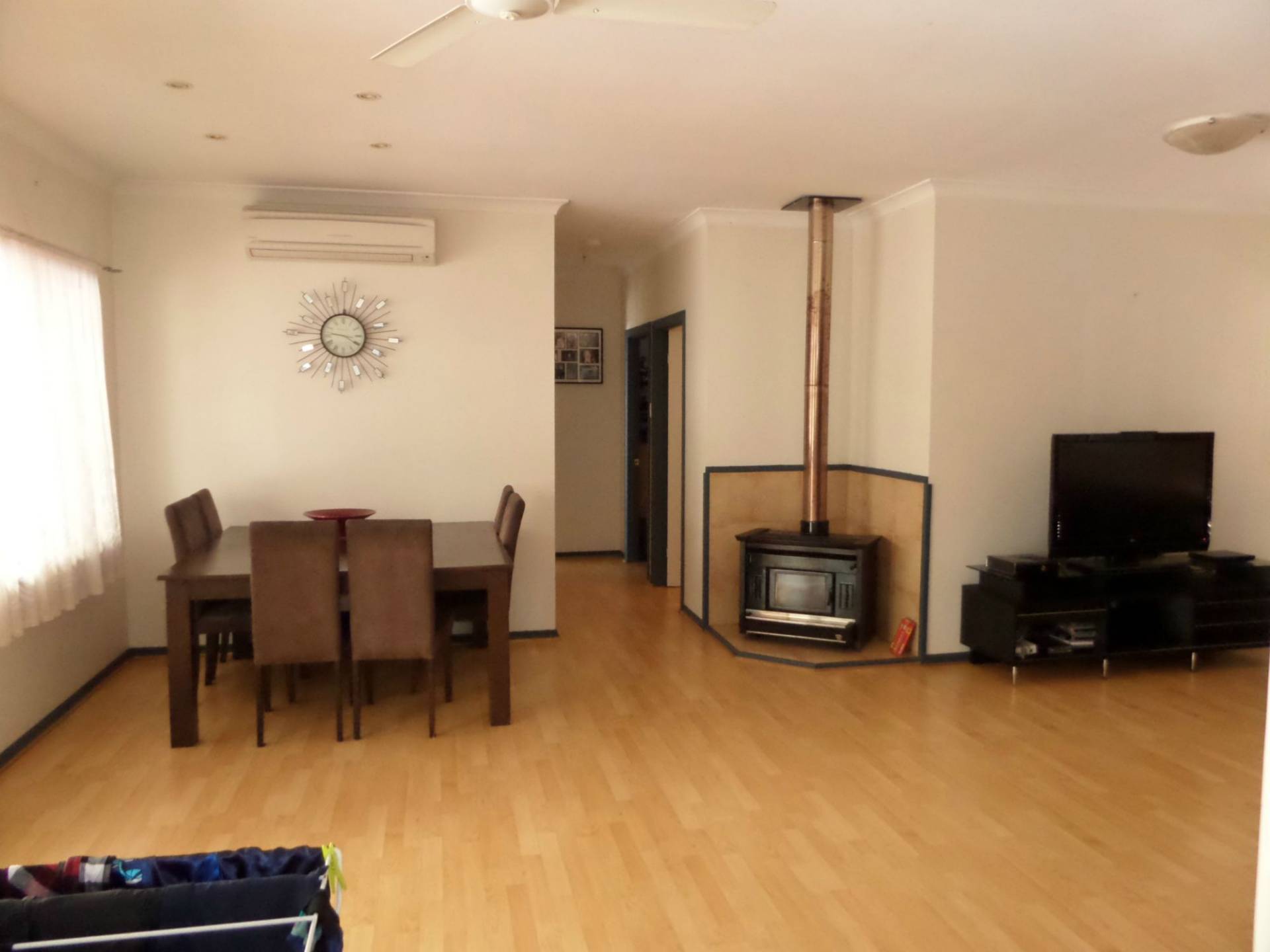 The open plan living and dining room features a slow combustion fireplace and split system air conditioner.