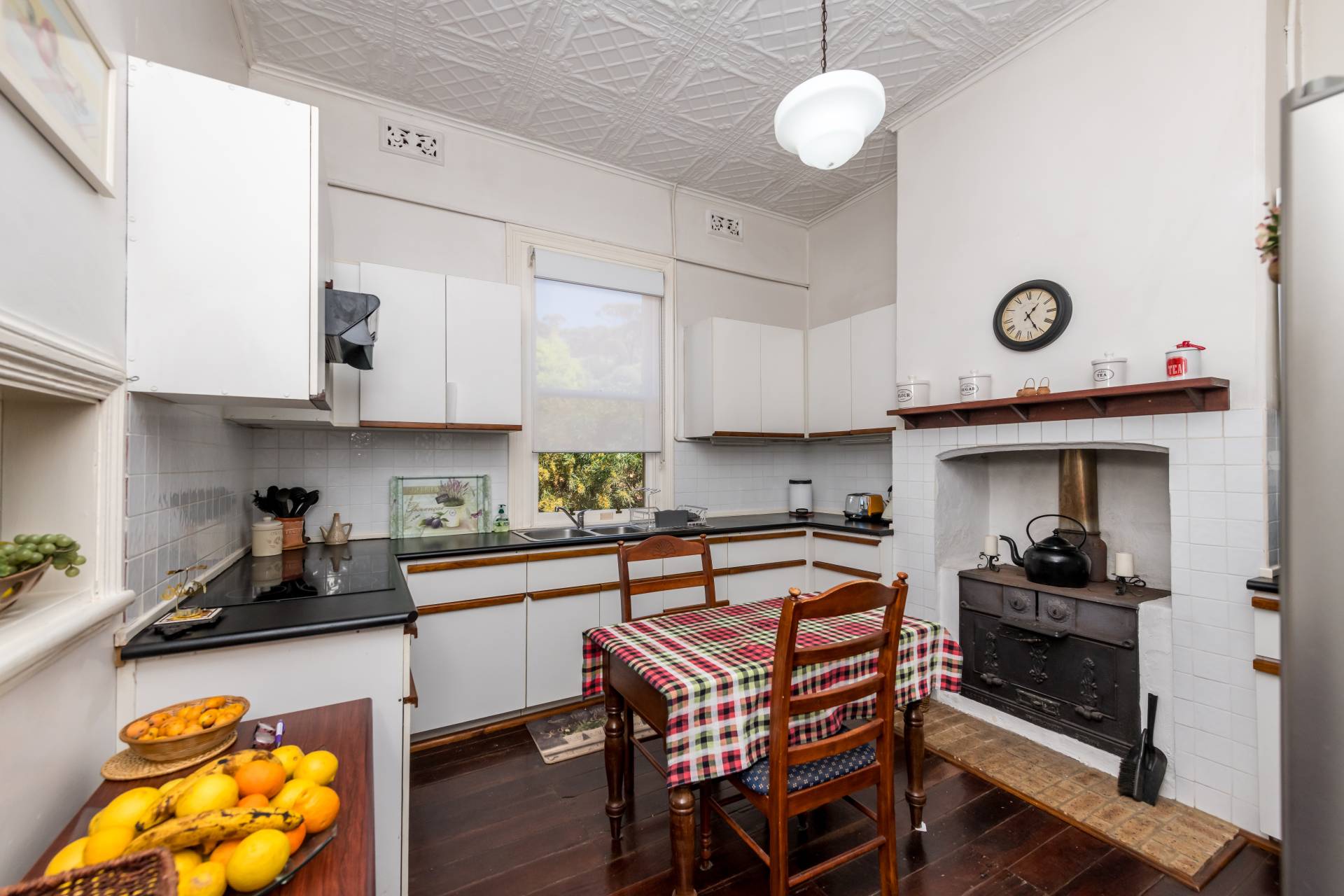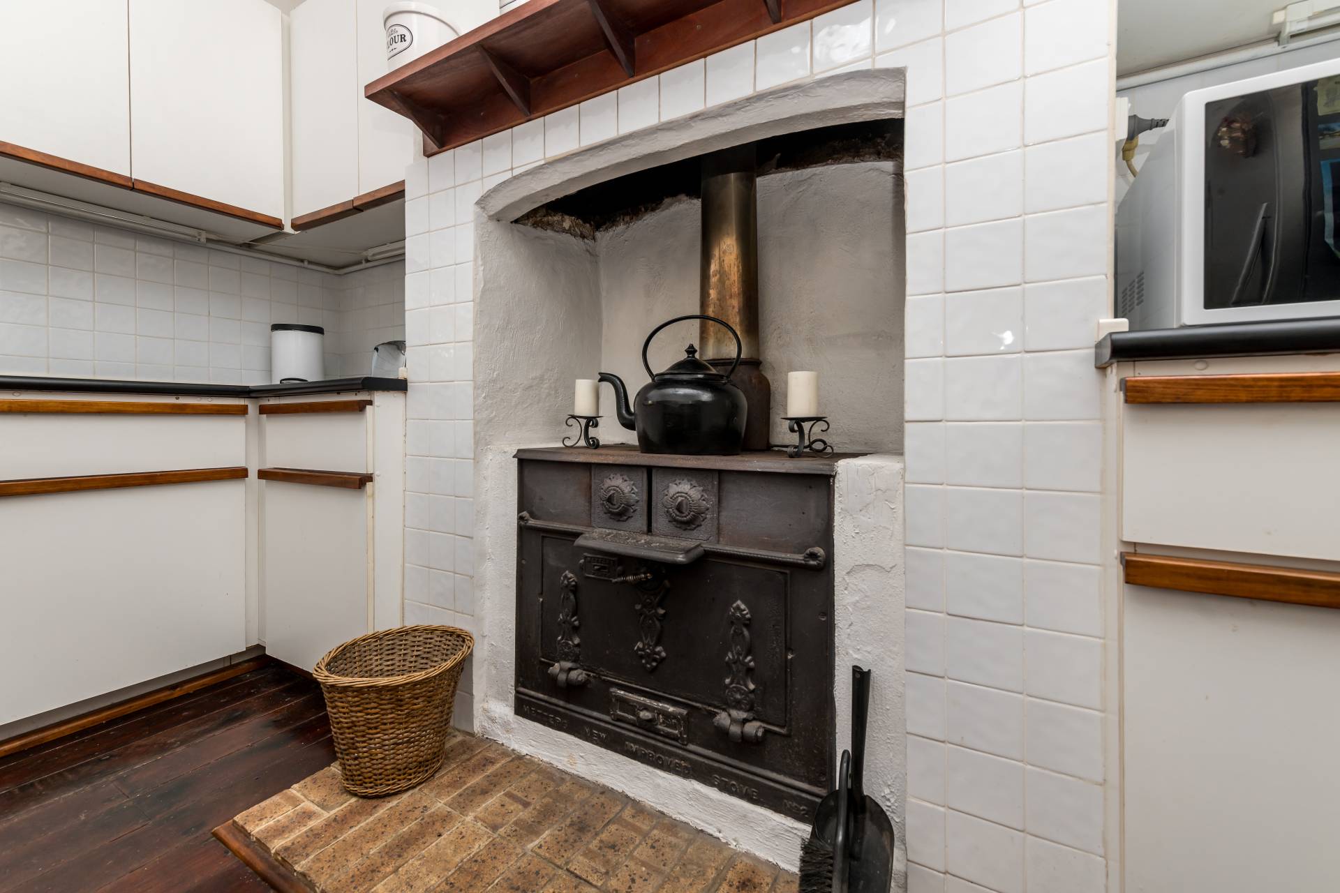 In the heart of the home, the kitchen retains its original wood stove alongside modern conveniences like an electric oven and separate hotplates. Abundant storage and a convenient servery to the dining room make this space as practical as it is charming.