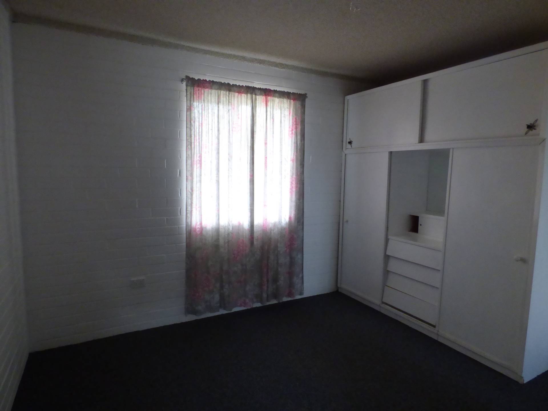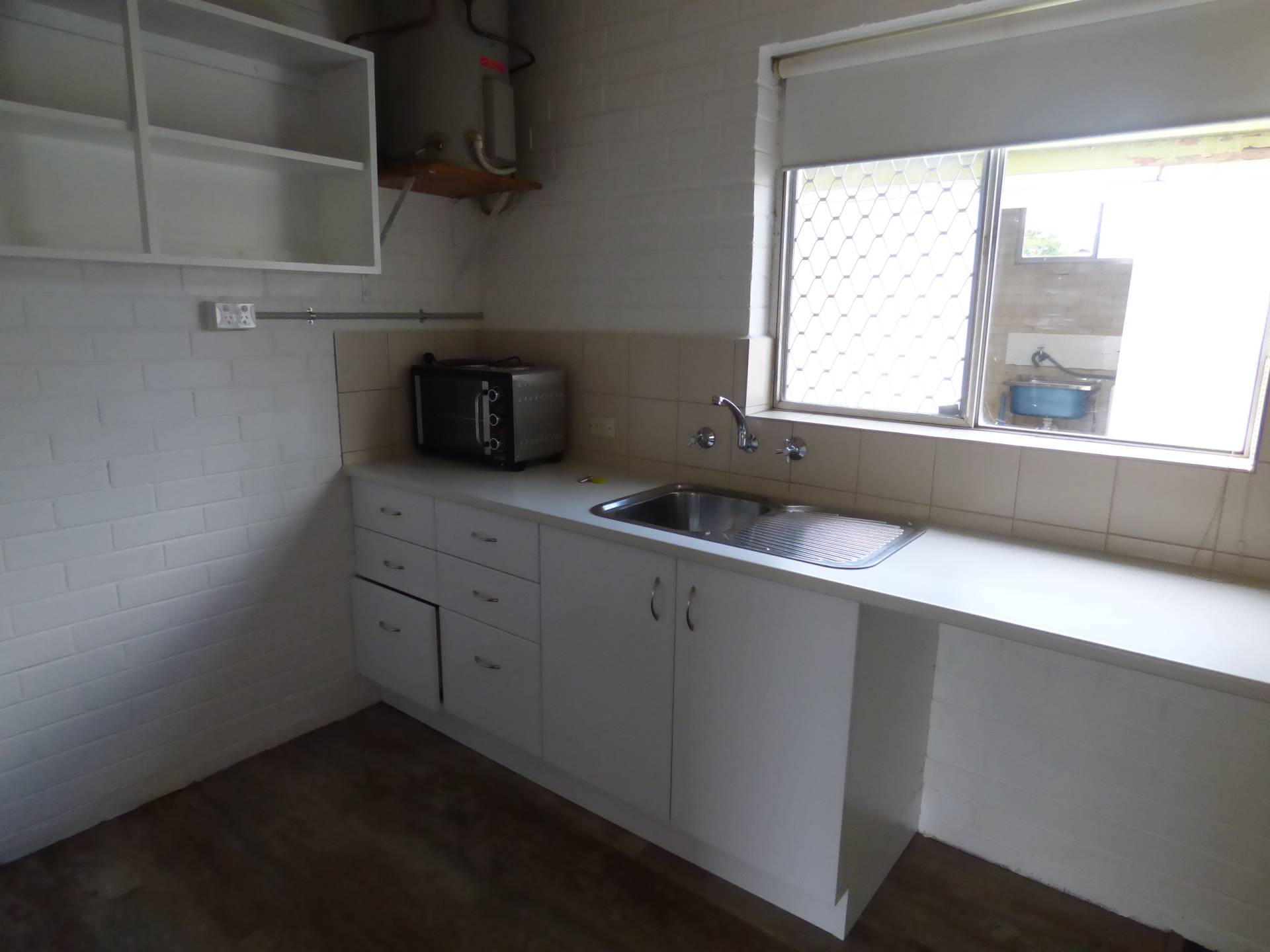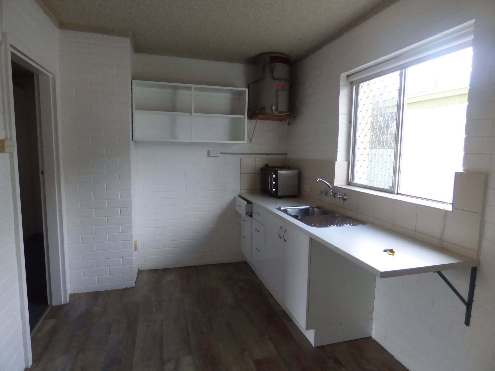 On entry, you walk into the carpeted lounge area which has a box unit air-con. This are wraps around into the kitchenette which features new cabinets and bench top and has a portable oven.