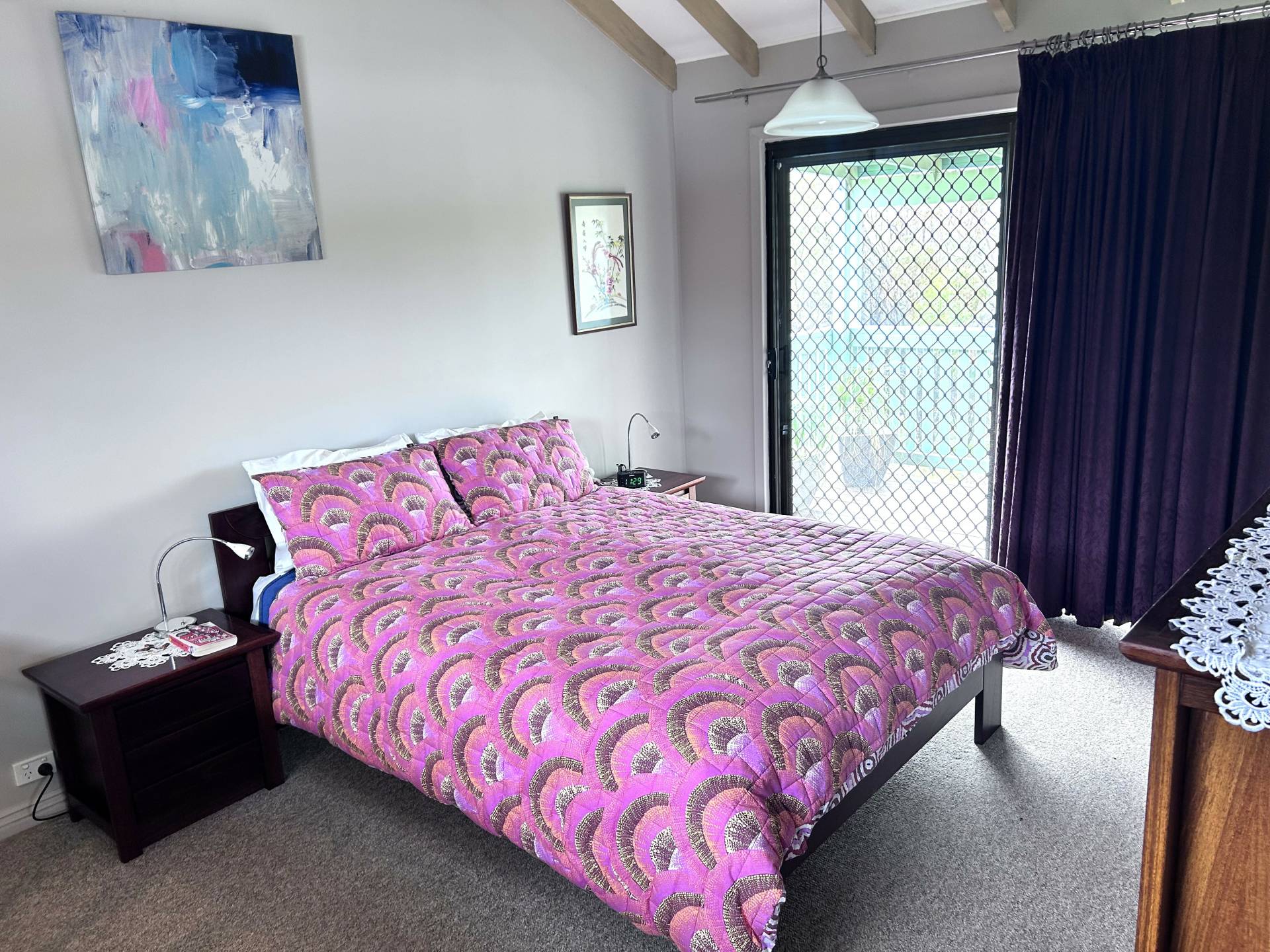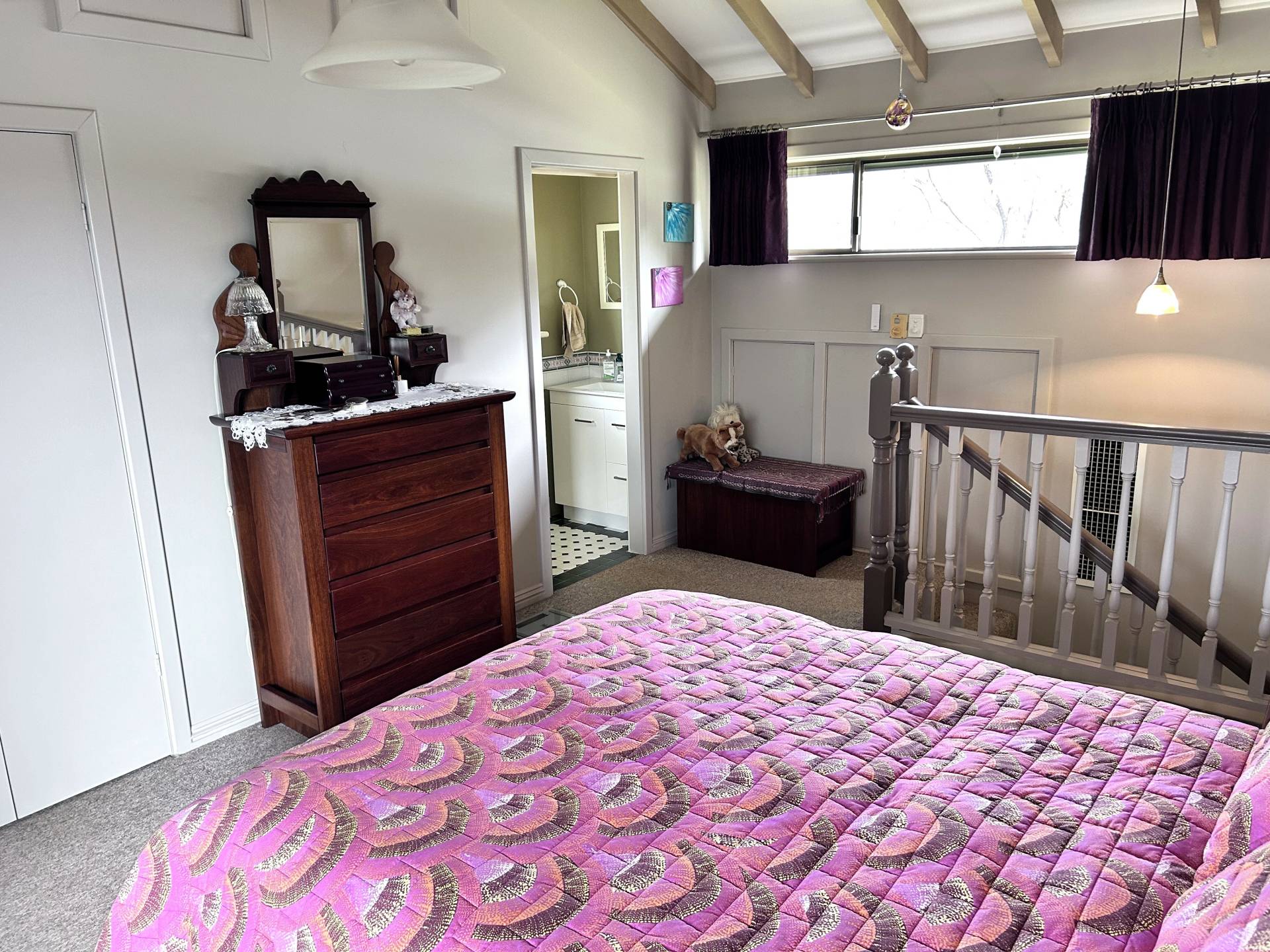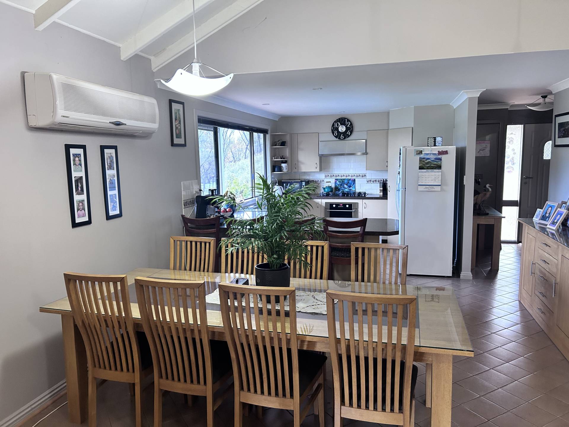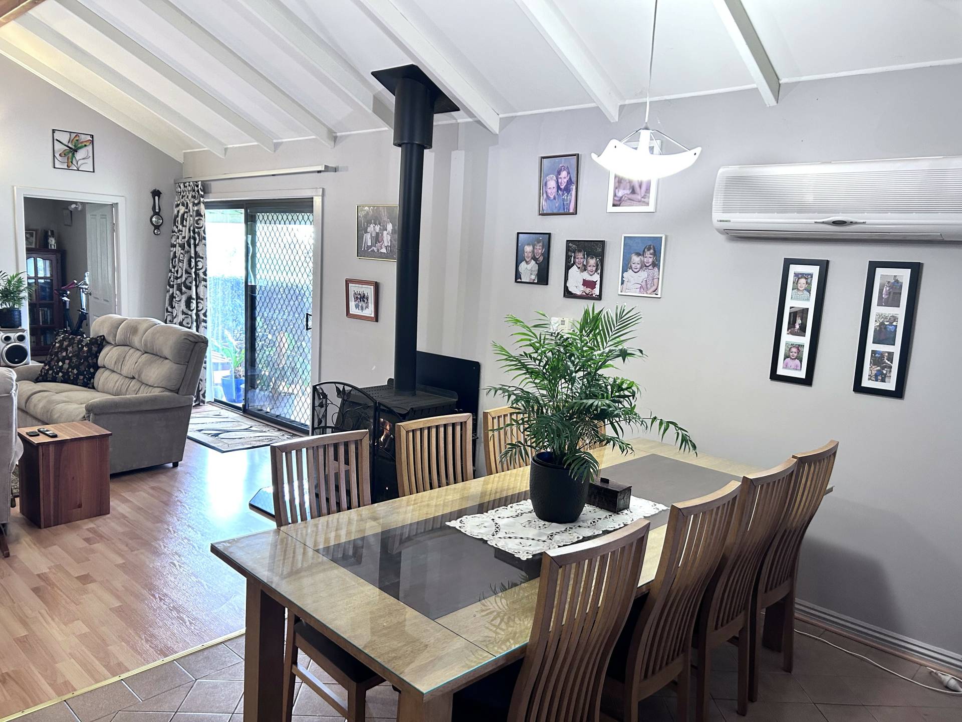 The house features four bedrooms, with three located on the ground floor and the main bedroom upstairs. There is one bathroom, complemented by an extra separate toilet for convenience. The spacious open-plan living area combines the kitchen, dining, and living spaces. It is highlighted by a wood burner fireplace, high-raked ceilings, and split system air conditioning, ensuring comfort throughout the year. Additionally, evaporative cooling provides extra relief during the warmer months.