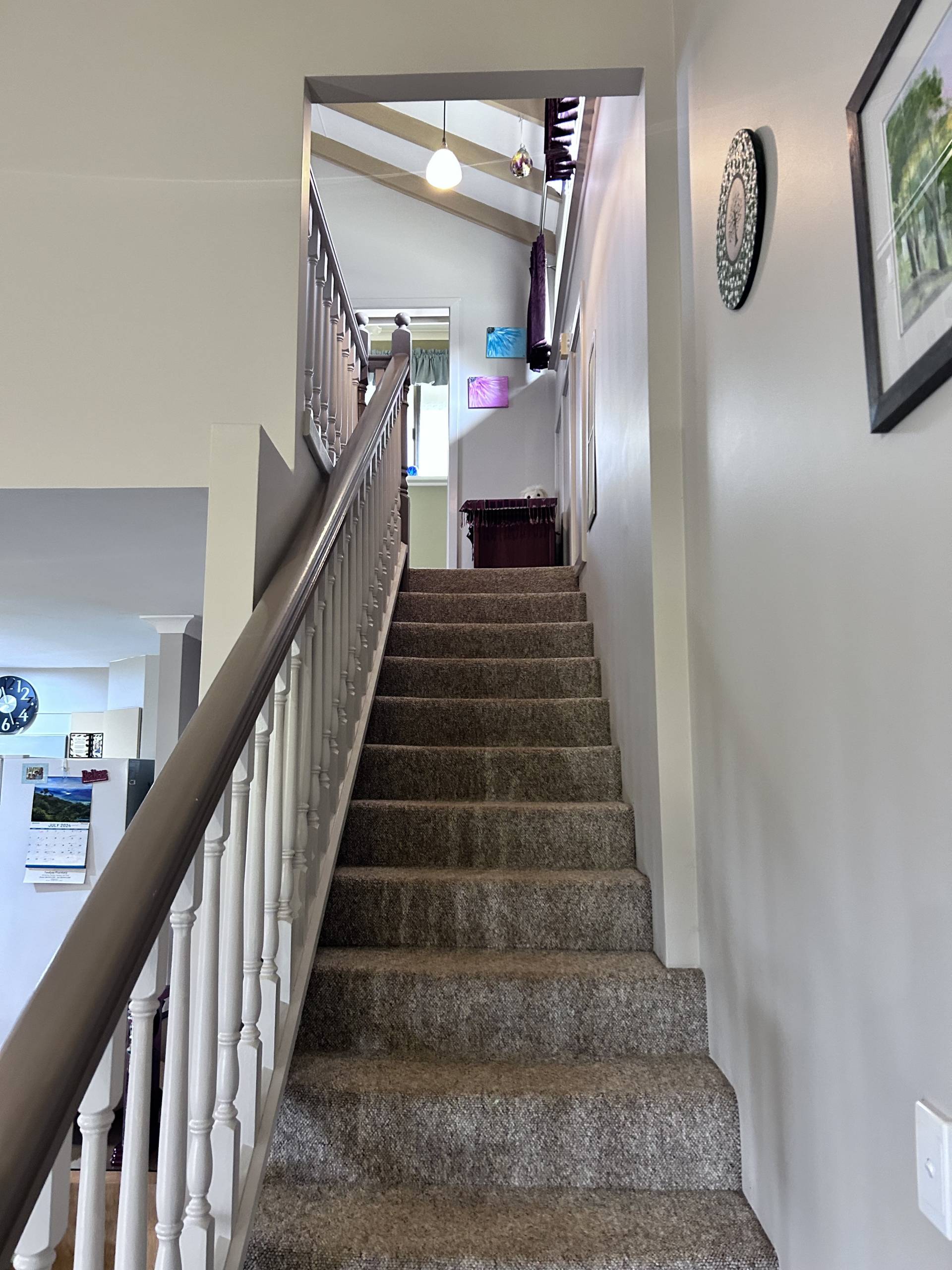 The main bedroom upstairs offers built-in robes, a separate toilet, and a private balcony that showcases stunning views of the property. The well-appointed kitchen is equipped with an electric oven and gas cooktop, a breakfast bar, and ample storage, making it a delightful space for cooking and entertaining. The kitchen also offers a lovely outlook over the gardens.