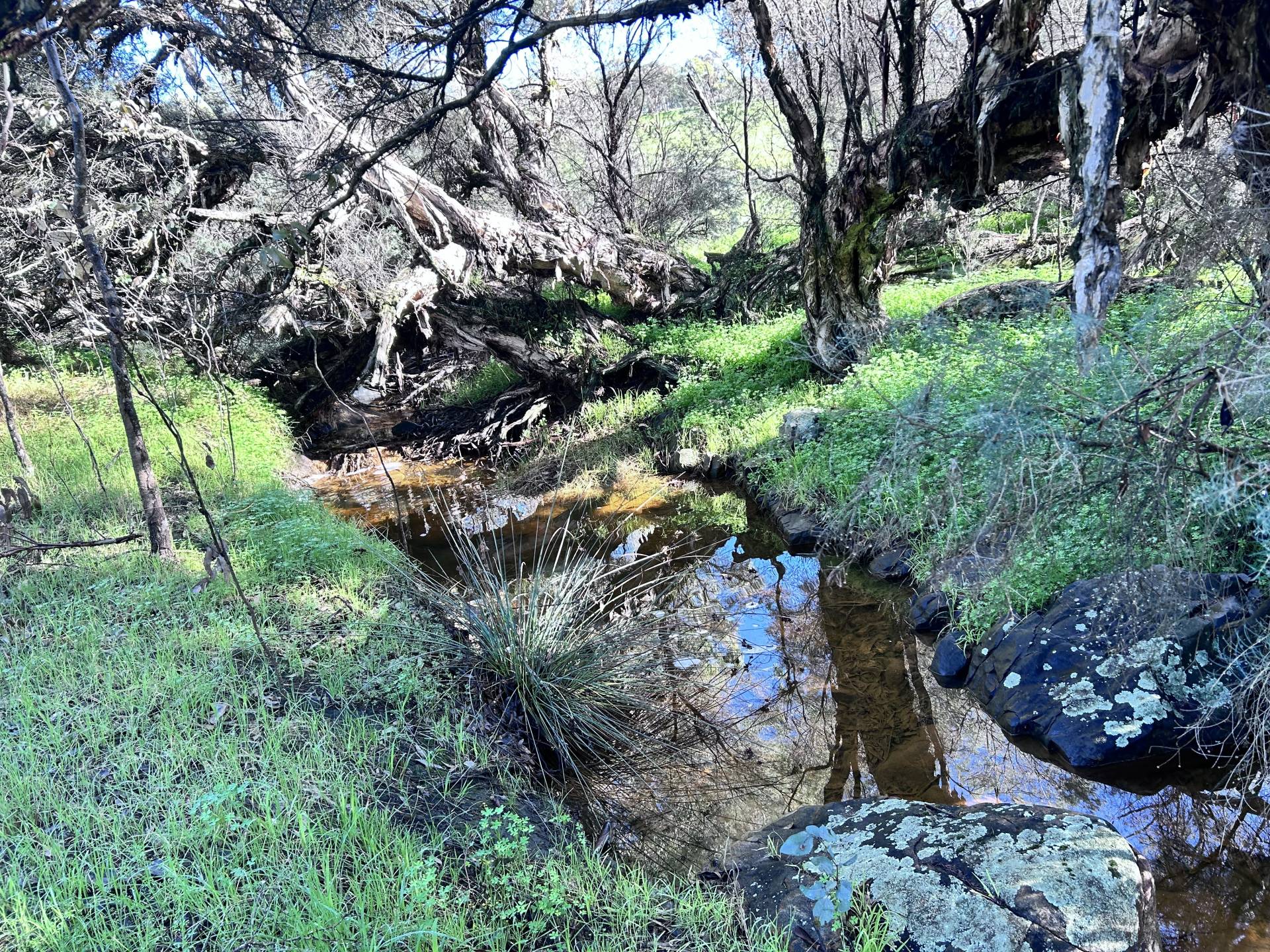 Water is plentiful on the property, with two dams providing water for stock and gardens, five rainwater tanks supplying the house, and a bore that can produce water for reticulated gardens. The long driveway leads from the no-through road, down to a creek crossing, past a dam, then up the hill to the house and sheds, emphasizing the property's sense of seclusion and privacy.