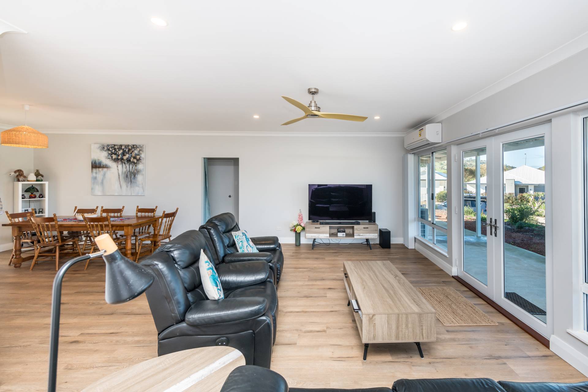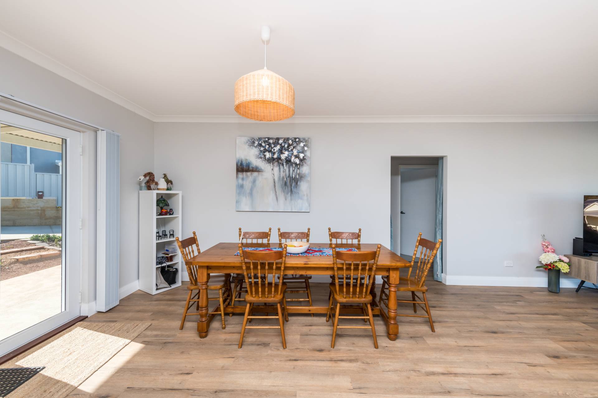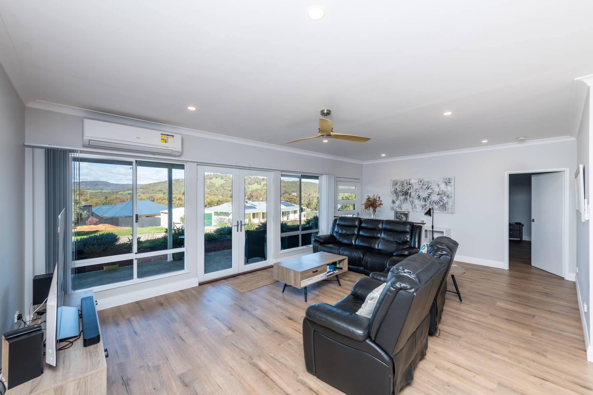 The heart of the home is the open plan living area, where the dining and lounge rooms seamlessly combine to create a spacious and welcoming environment. Enhanced by downlights throughout, split system air conditioning, a ceiling fan, and generous windows, this area is bathed in natural light and provides stunning views of the neighbourhood and Toodyay hills.