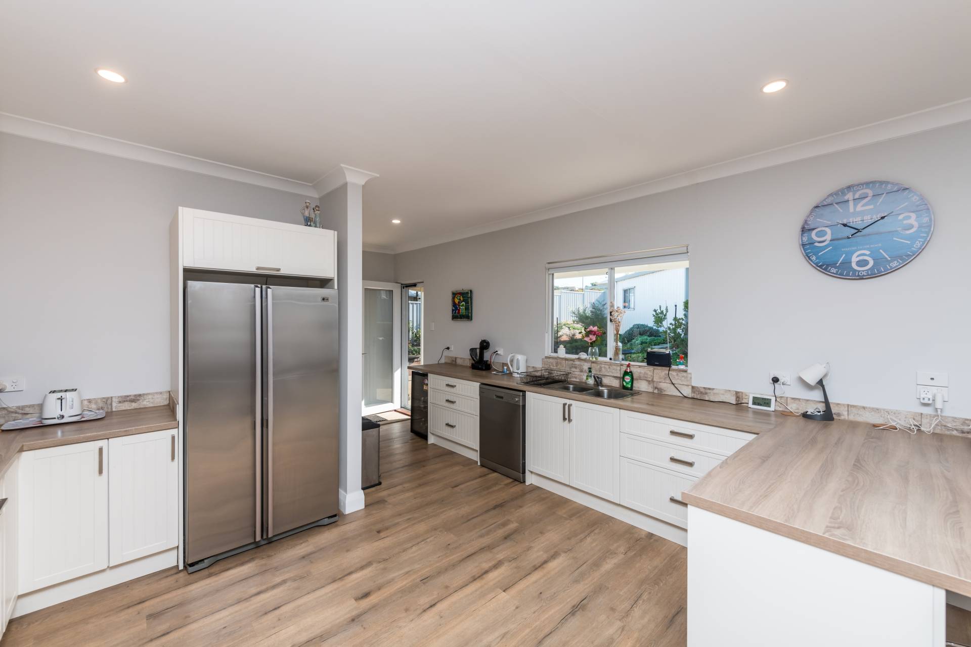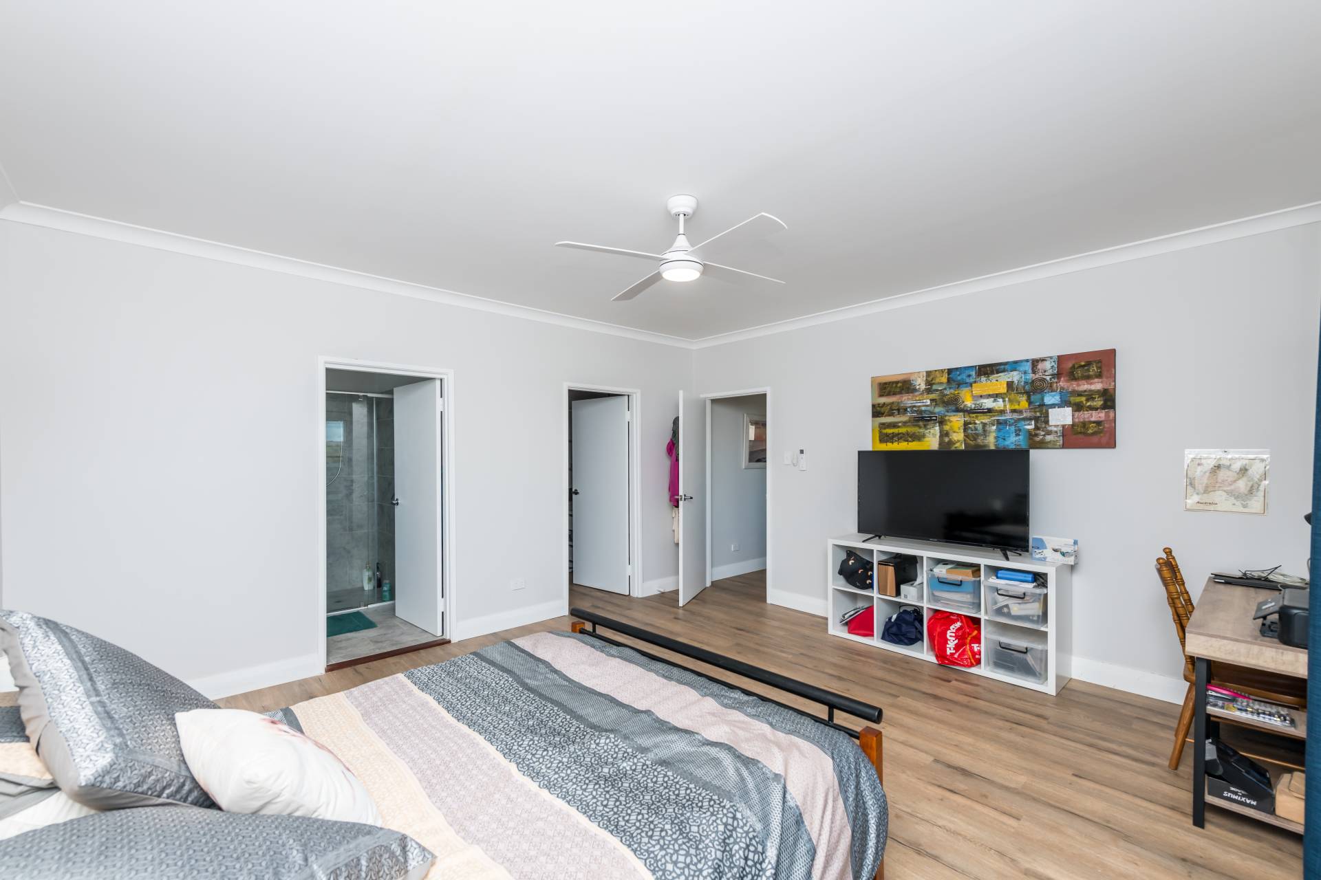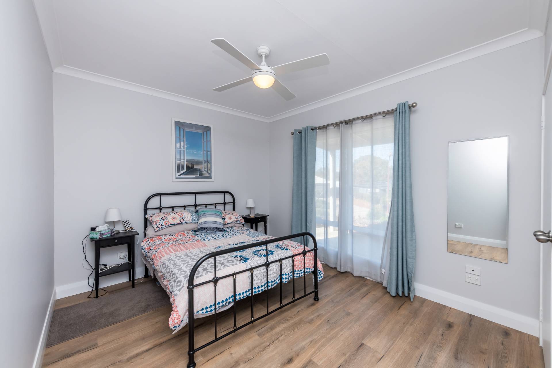 The heart of the home is the open plan living area, where the dining and lounge rooms seamlessly combine to create a spacious and welcoming environment. Enhanced by downlights throughout, split system air conditioning, a ceiling fan, and generous windows, this area is bathed in natural light and provides stunning views of the neighbourhood and Toodyay hills.