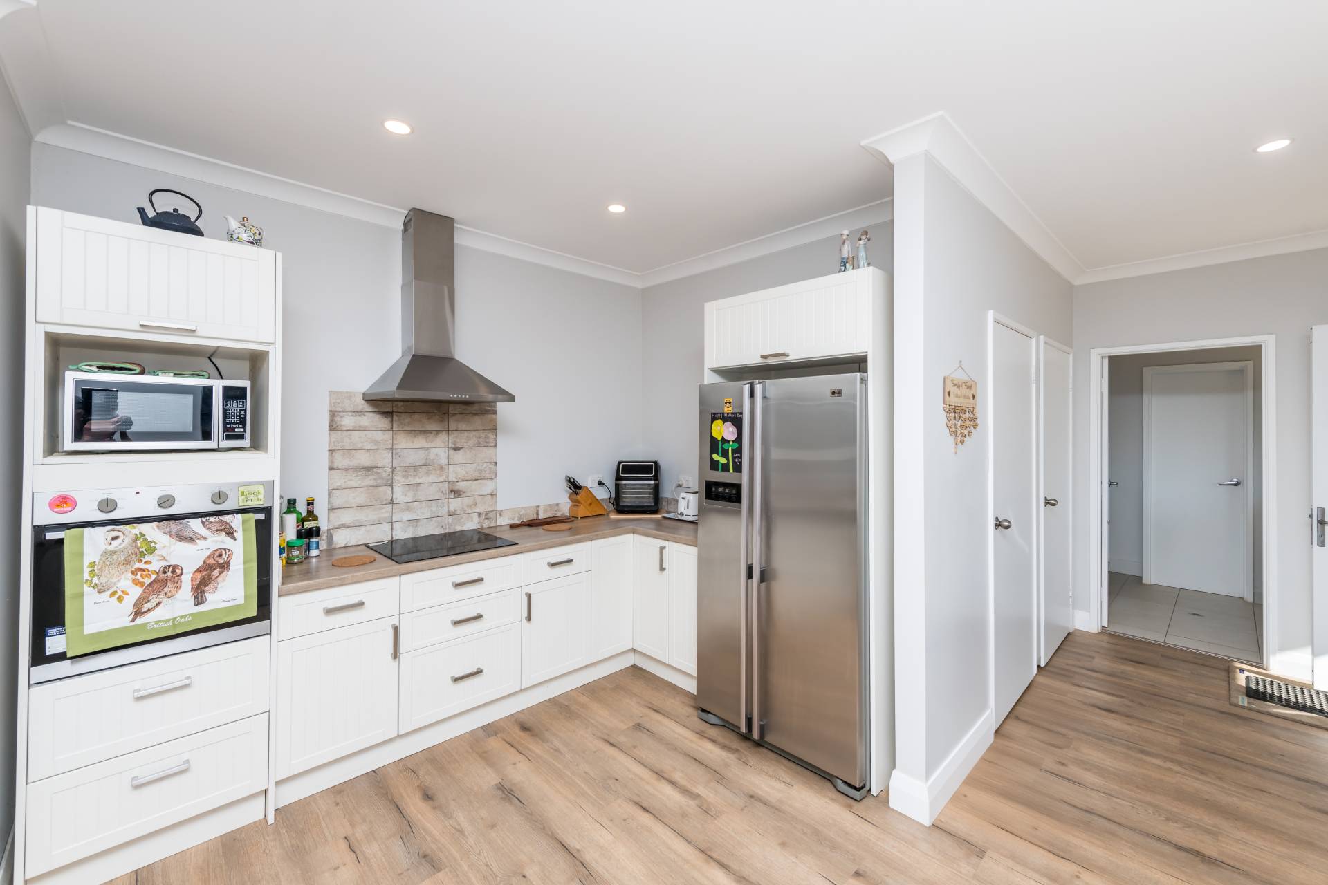 The gourmet kitchen features a breakfast bar, timber benchtops, ample cupboard space, an electric cooktop, and oven. The kitchen leads to a functional Scullery with good laundry space and a separate toilet, accessible from the back veranda.