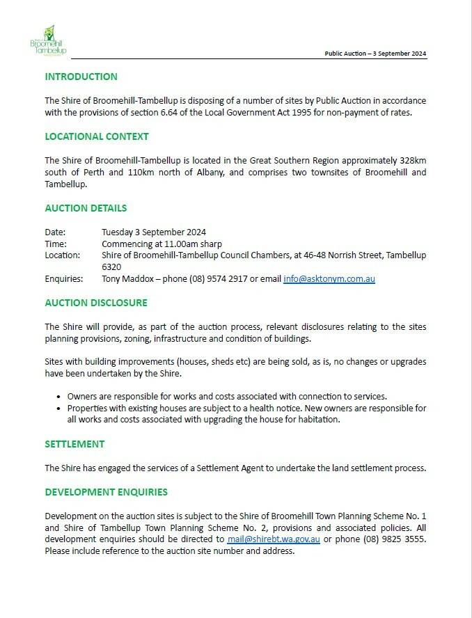 AUCTION OF LAND ON BELHALF OF SHIRE OF BROOMEHILL - TAMBELLUP