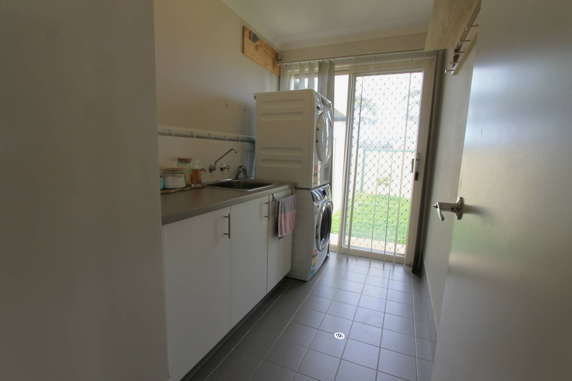 Down the hallway, you have the laundry which has direct access via sliding glass door to the side of the yard where your clothesline is. The laundry is functional with bench space, cupboards, built-in trough and room for your washing machine (both front loader OR top loader), plus brackets to install your dryer on the wall to assist with space saving.