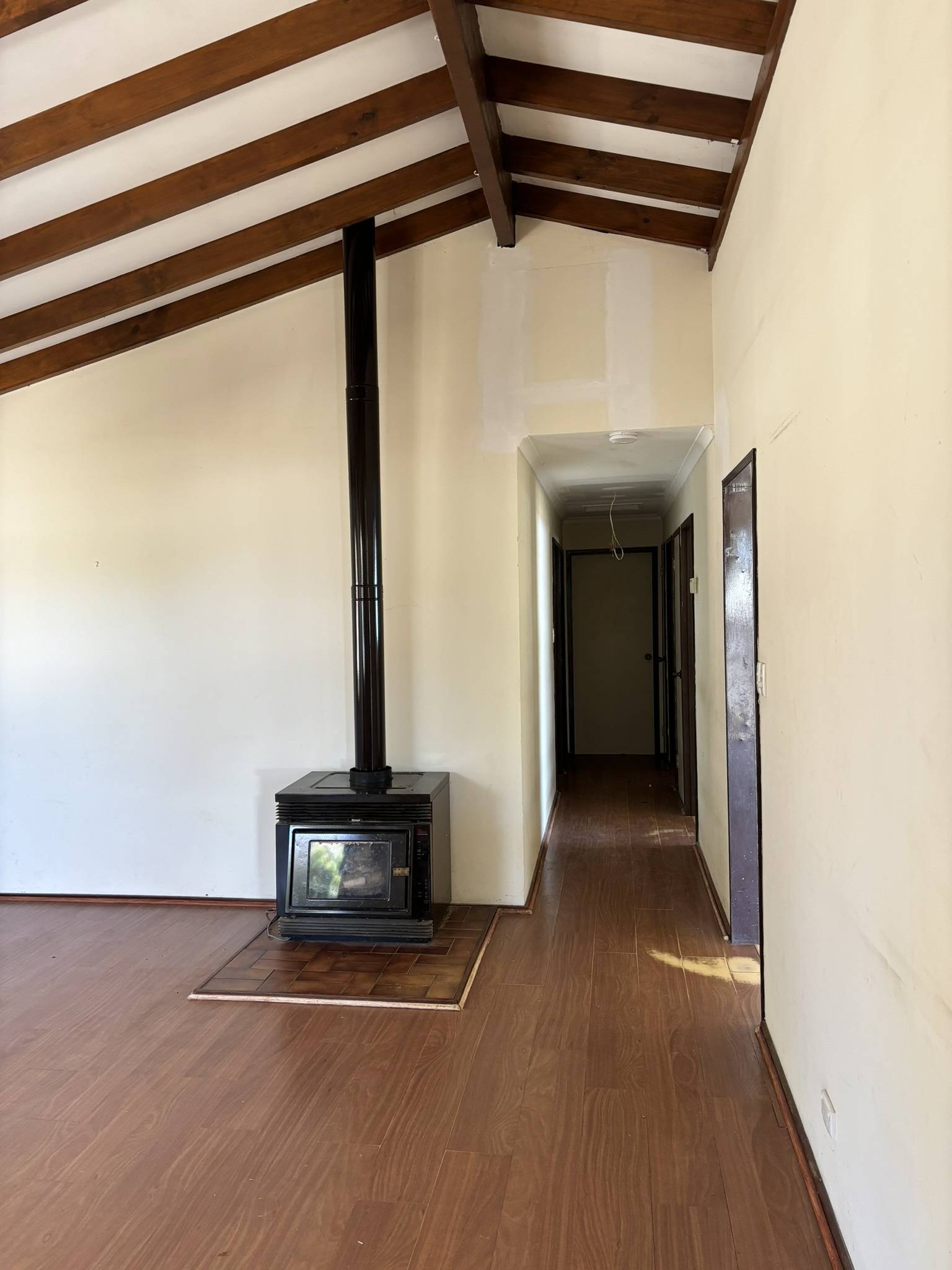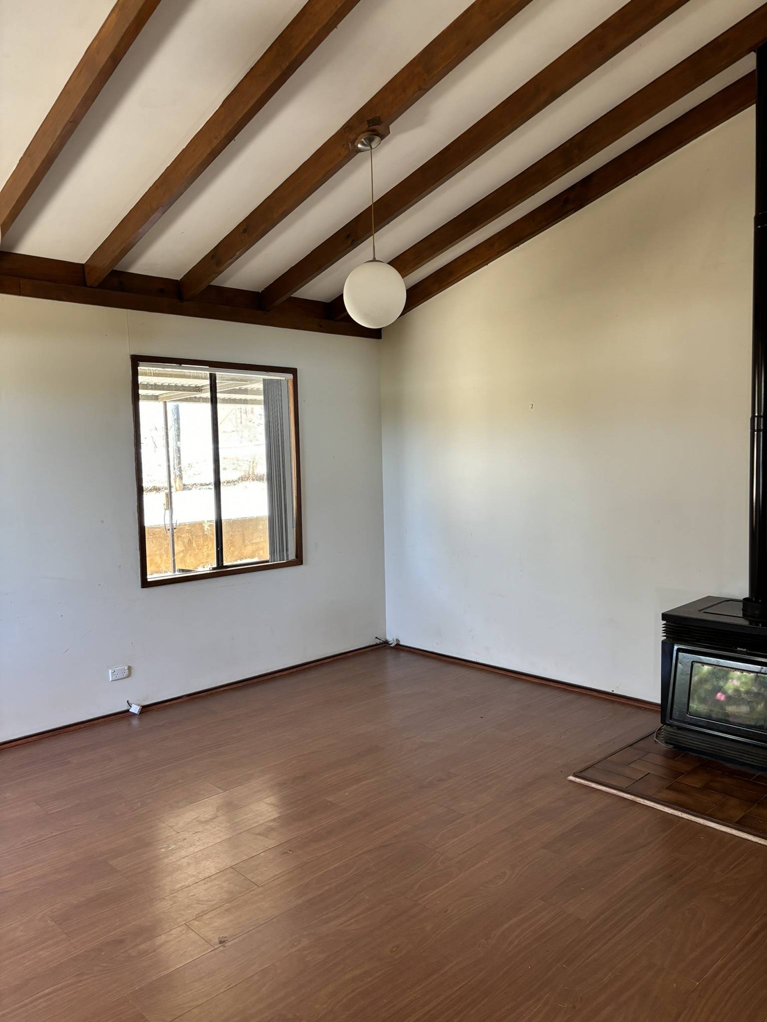 The main living area boasts stunning raked ceilings, wood floors, a cozy fireplace, and split system air conditioning, creating a warm and inviting atmosphere.