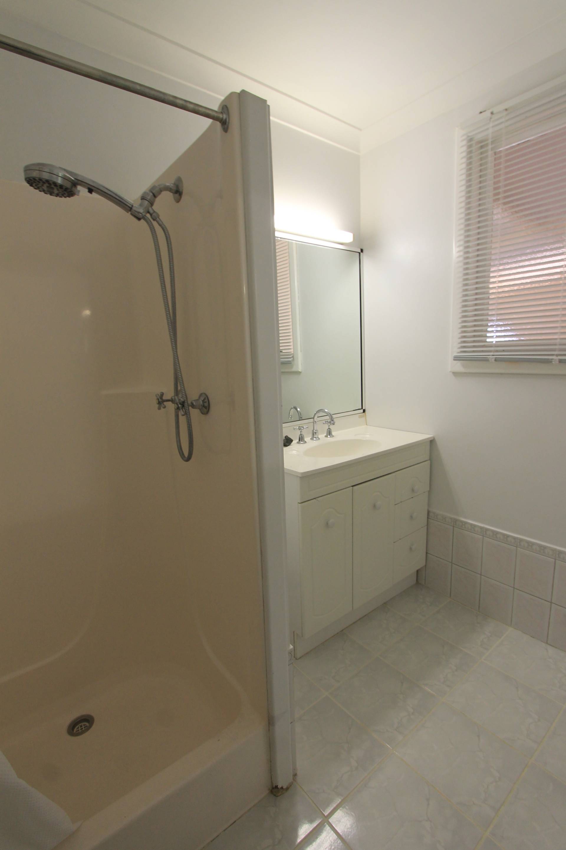 The bathroom is conveniently located in close proximity to your bedrooms and features a built-in corner unit with shower curtain and a vanity for storage.
