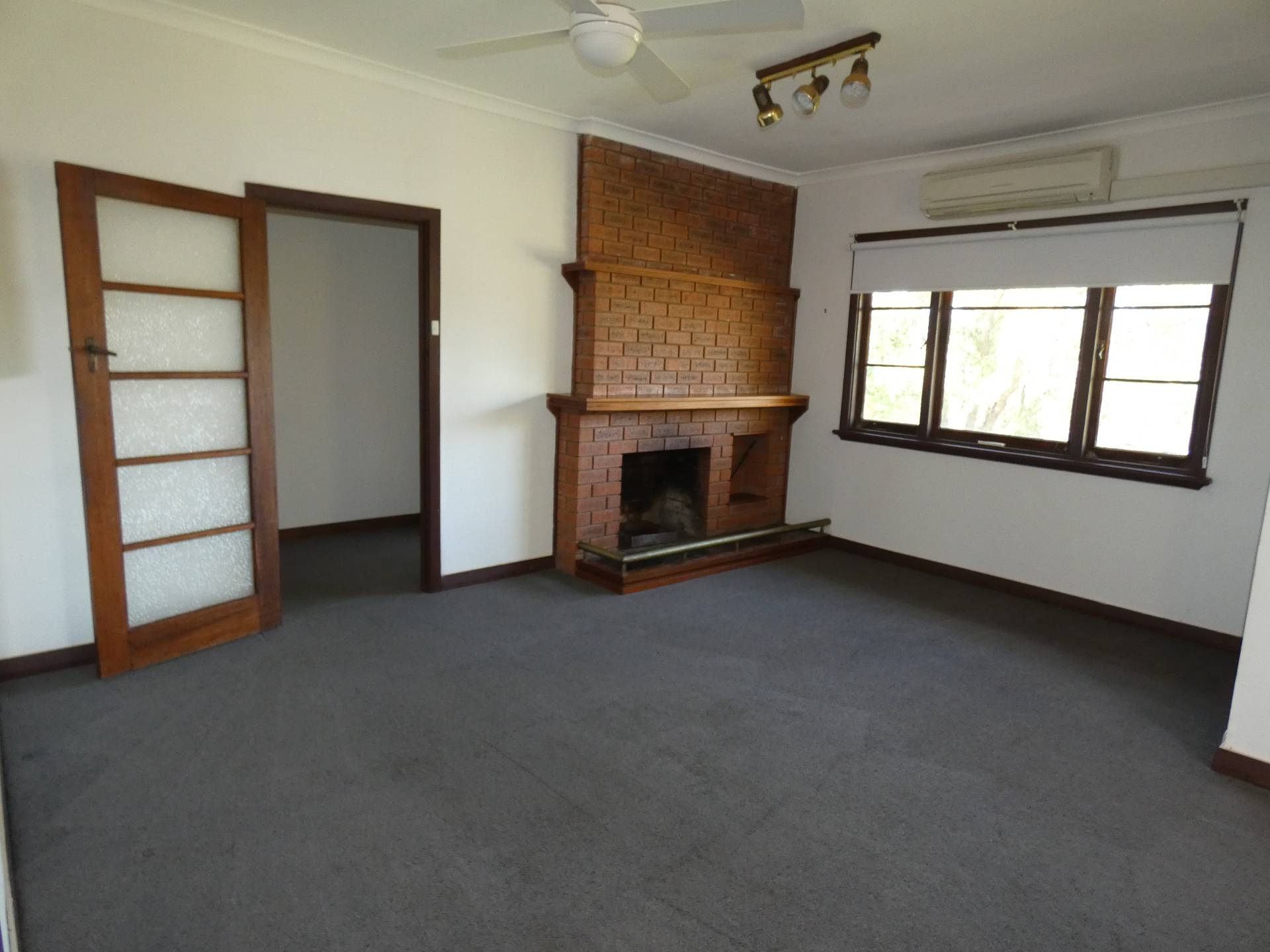 From the front verandah, you walk through the entryway and welcomed with the spacious lounge/living room, that is serviced by a split system air-con and an open fireplace.