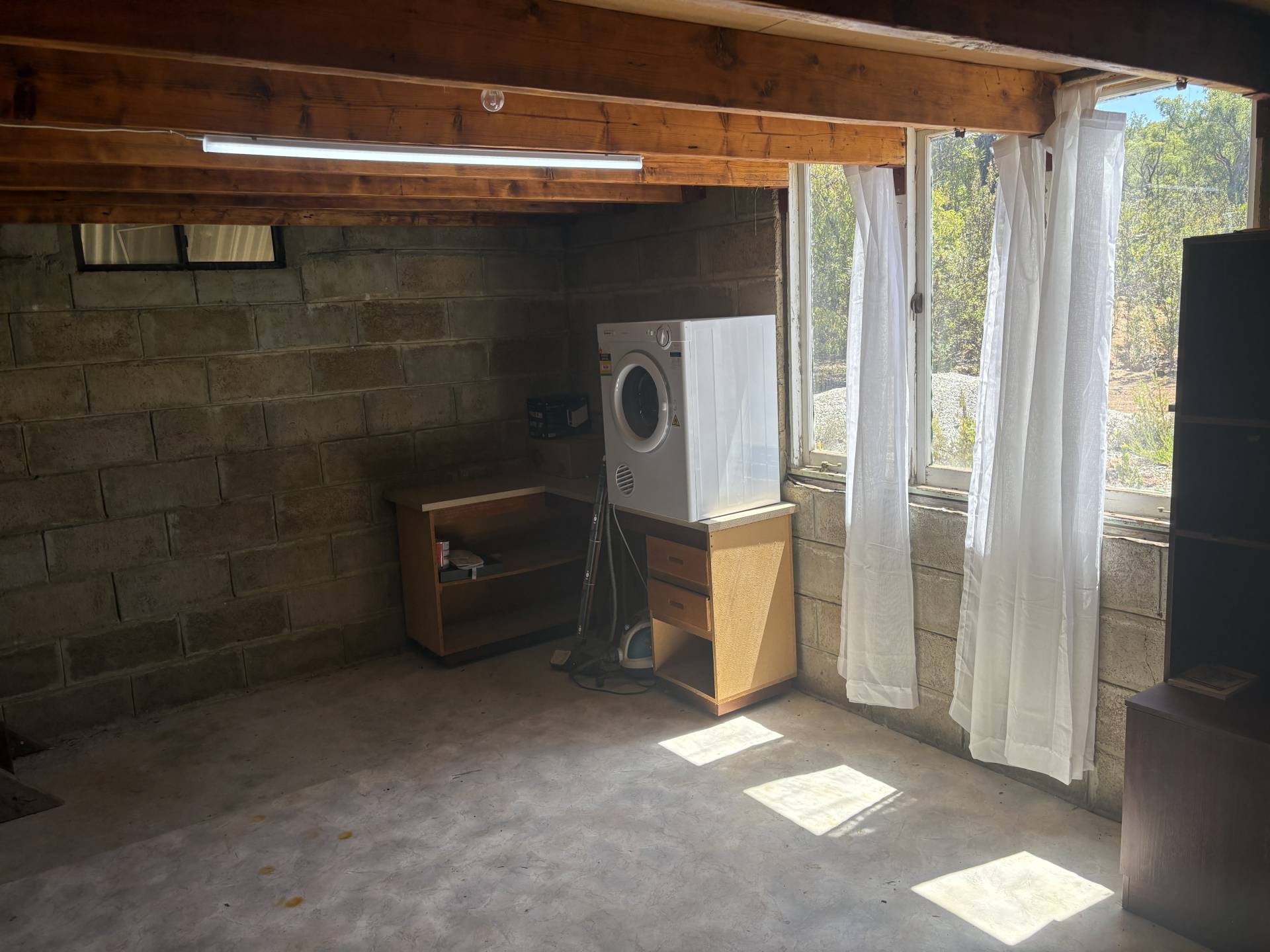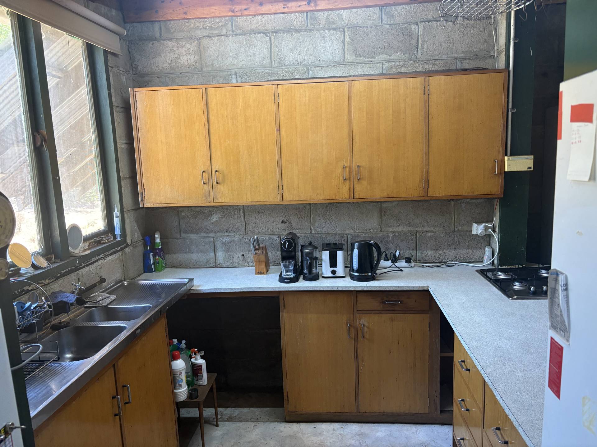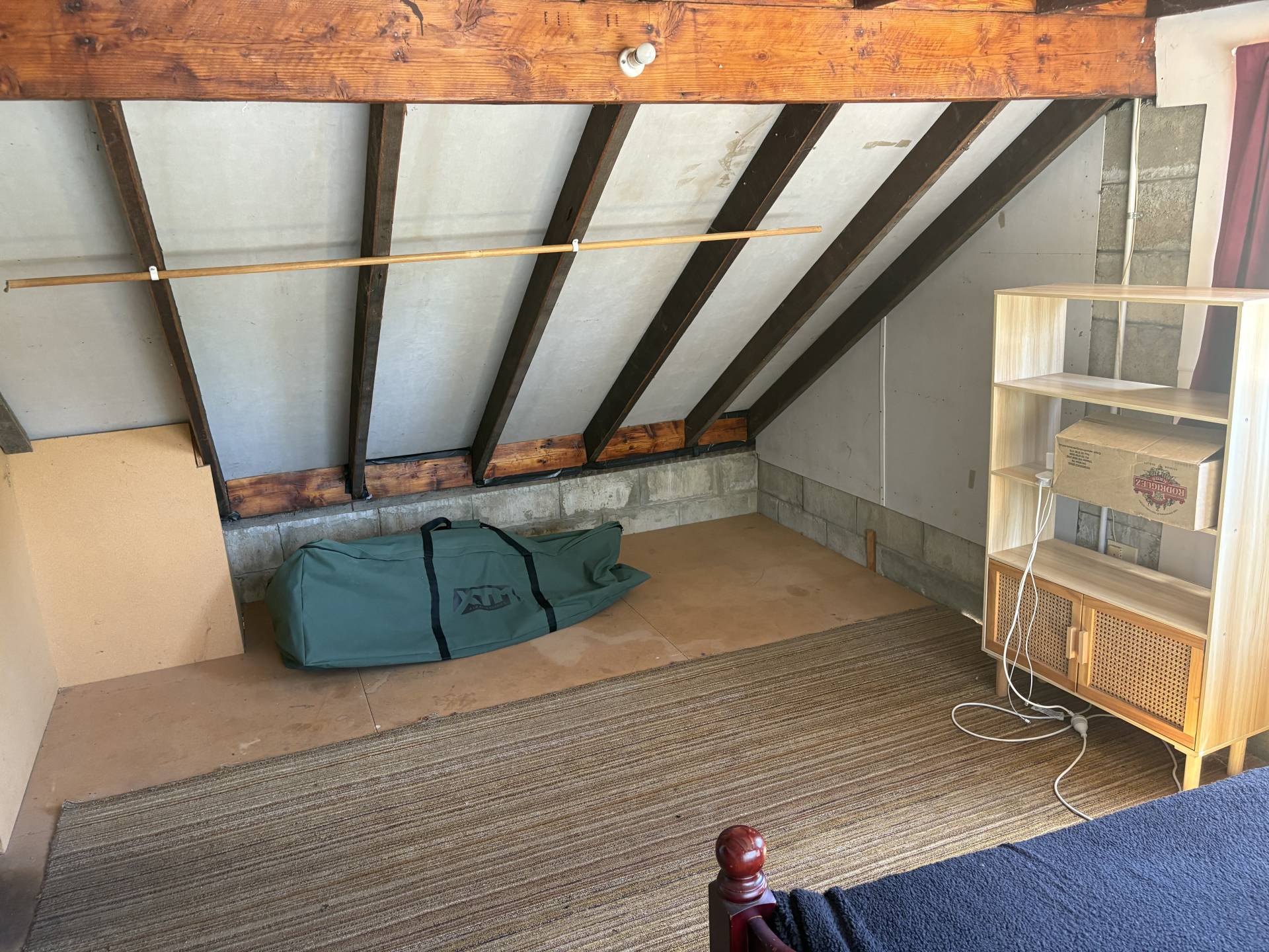 The house features a high raked ceiling, a fireplace, and a compact kitchen. There are two bedrooms—one upstairs and one downstairs. Outside, there’s a single carport plus an additional lean-to for extra undercover parking.