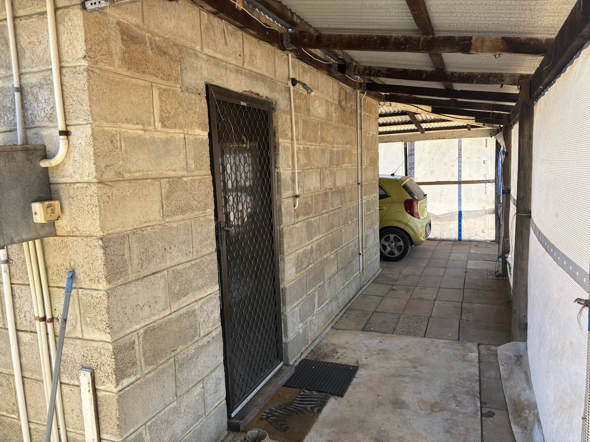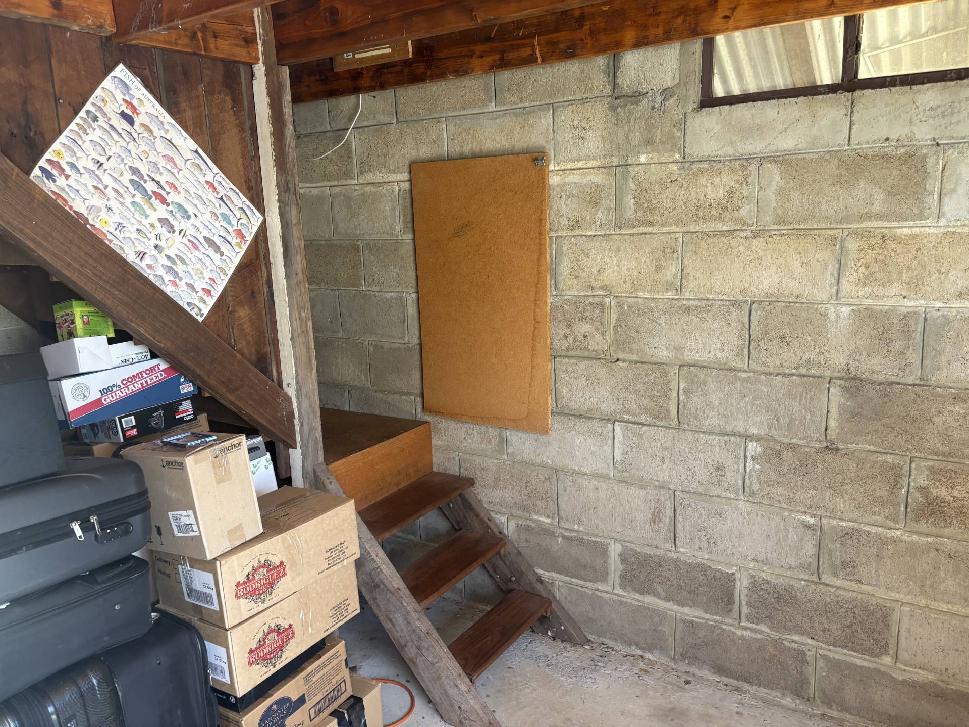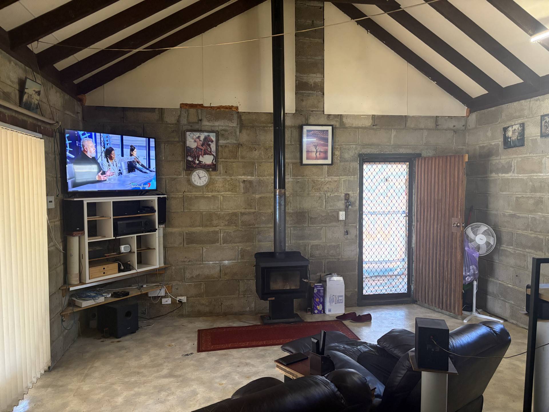 The house features a high raked ceiling, a fireplace, and a compact kitchen. There are two bedrooms—one upstairs and one downstairs. Outside, there’s a single carport plus an additional lean-to for extra undercover parking.