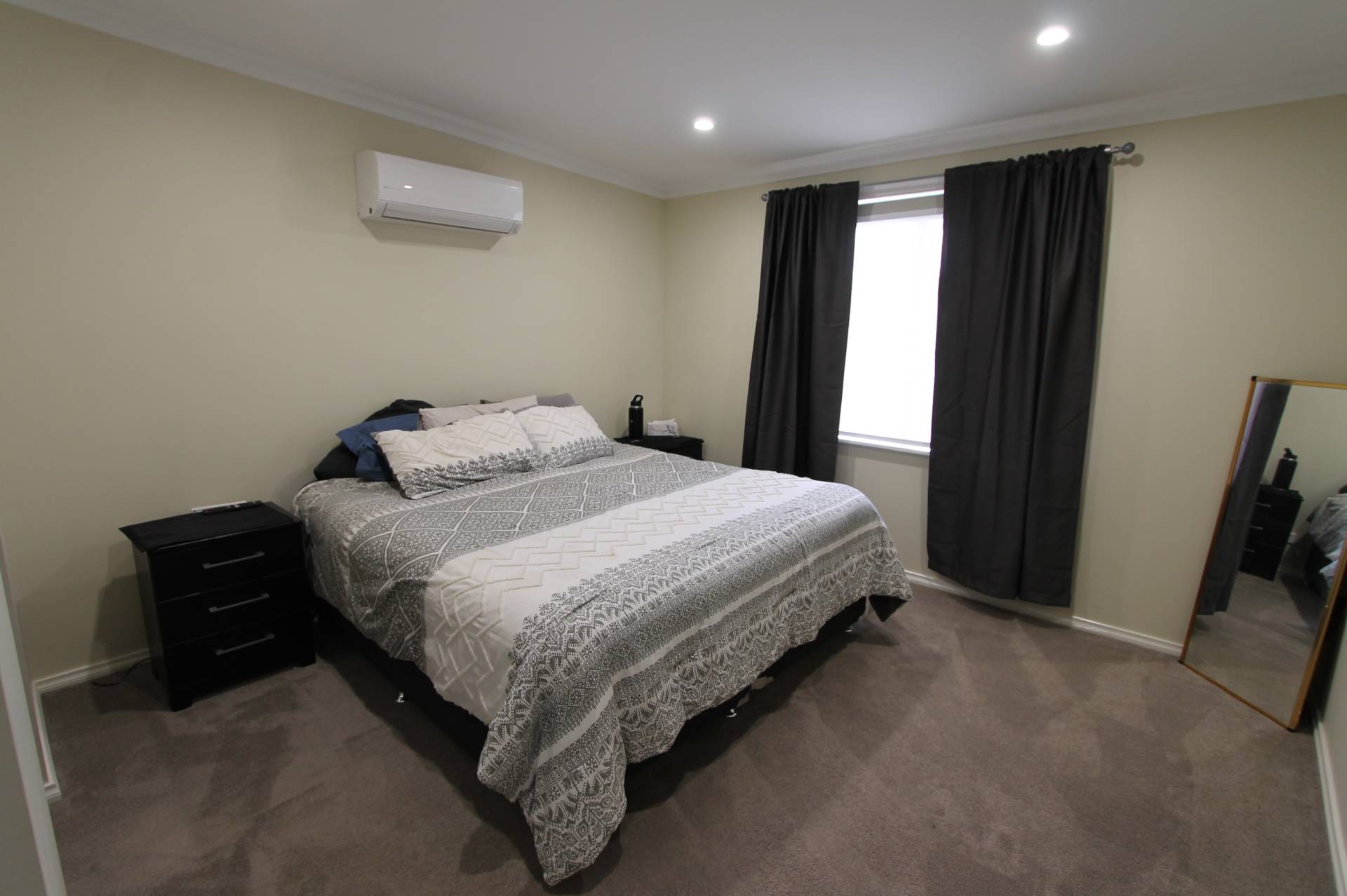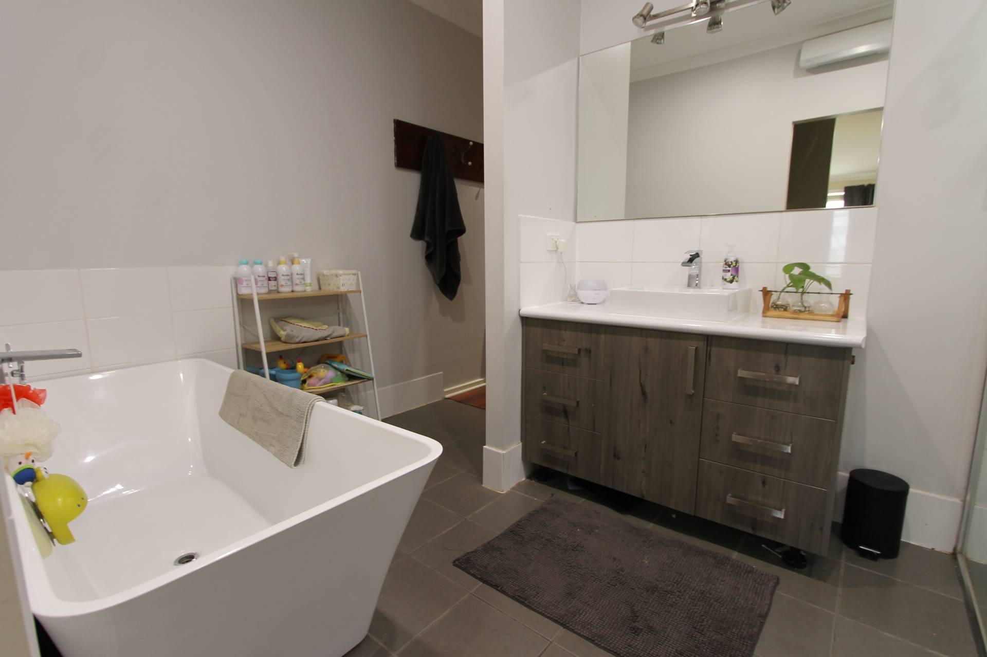 The master bedroom, located on the left is large in size and features plush carpet, modern recessed lights and a split system air-con. Walking through the built-in robe gives you access to your well designed, modern ensuite bathroom.  Featuring a walk-in shower, large vanity unit with storage and basin, plus a large bath perfect for relaxing after a long day. Additional storage space and separate toilet are located to the rear of the bathroom.